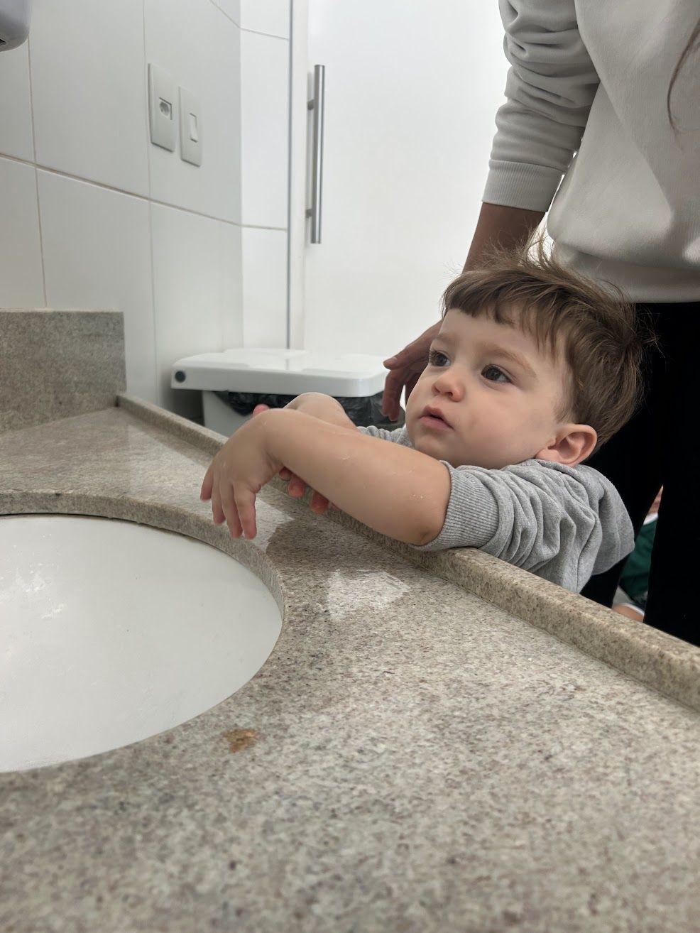 Diego revela sua autonomia na higiene com atenção e cuidado. Ao escovar os dentes, acompanha atentamente os movimentos cantados da educadora, absorvendo cada gesto com curiosidade e concentração. Em seguida, lava as mãos com seriedade, parecendo se observar pensativo no espelho, descobrindo prazer e confiança em cuidar de si mesmo.