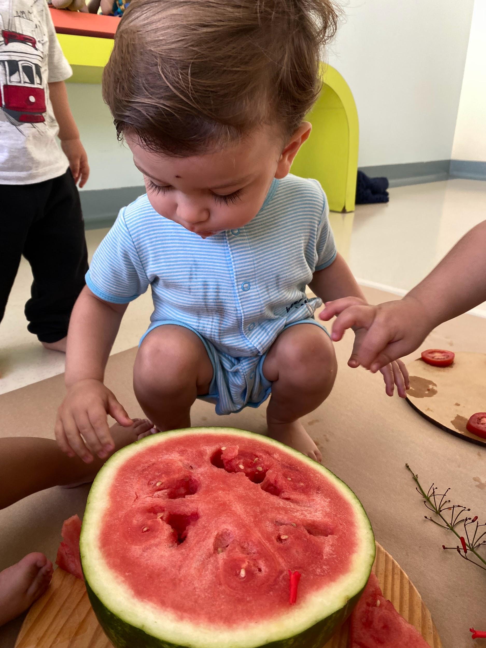 No vermelho, seus olhos se iluminam diante da melancia. Ele observa com atenção tranquila, aproxima as mãos e pega um pedaço. Então, se delicia devagar, experimentando e saboreando, deixando o doce marcar o instante com simplicidade e prazer.