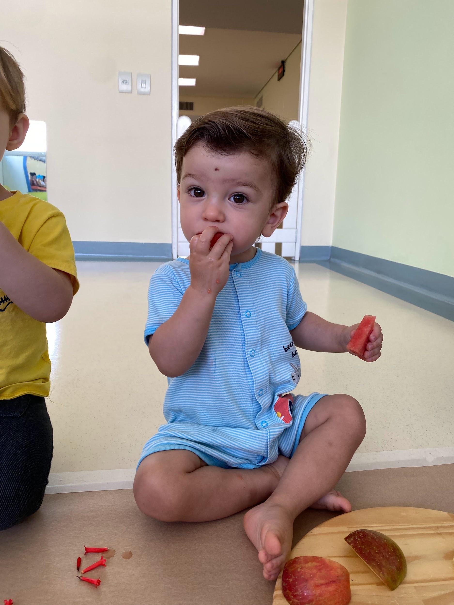 Diego revela autonomia e prazer ao se alimentar. Com as mãos ou talheres, explora cada alimento, levando-o à boca com confiança e atenção, saboreando cada pedaço com curiosidade e alegria. Experimenta texturas e sabores, provando frutas, pães e pequenas porções, desenvolvendo coordenação e independência a cada gesto.