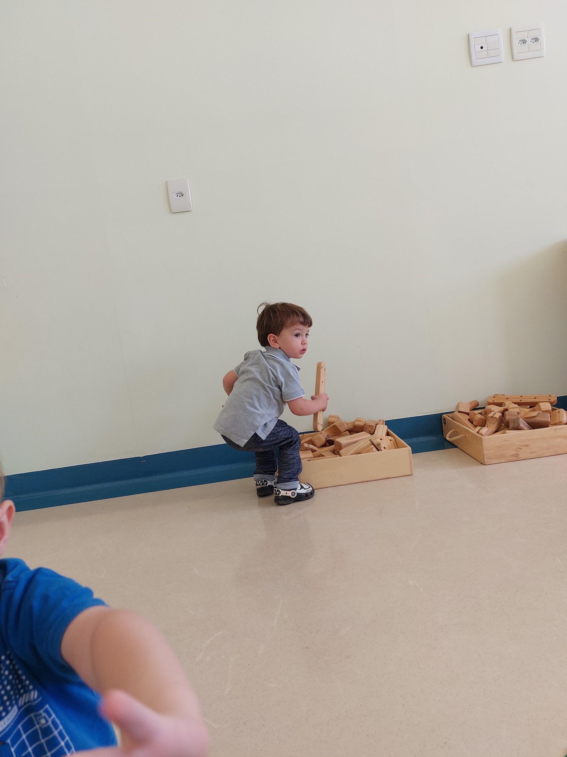 Diego inicia sua própria construção com atenção e curiosidade. Caminha até a caixa de pecinhas de madeira, escolhe cuidadosamente os materiais e os leva para o lugar onde quer se sentar e criar.