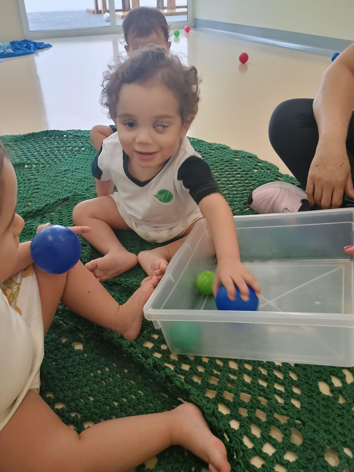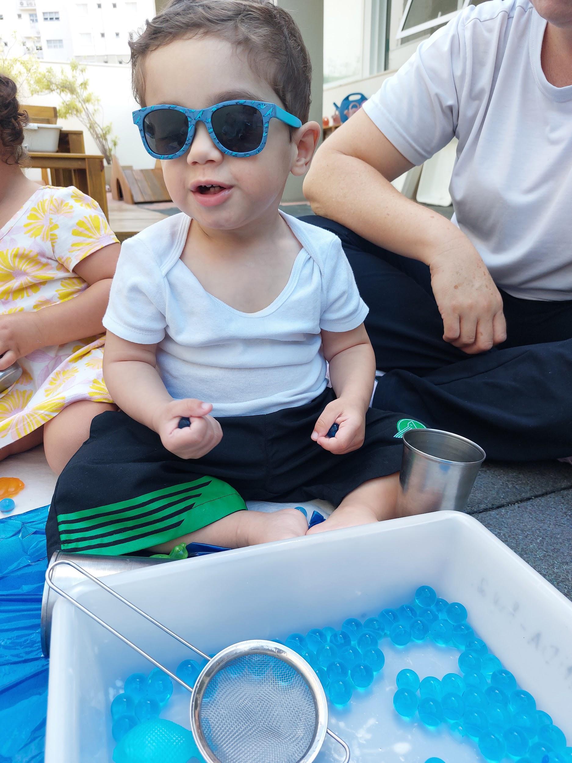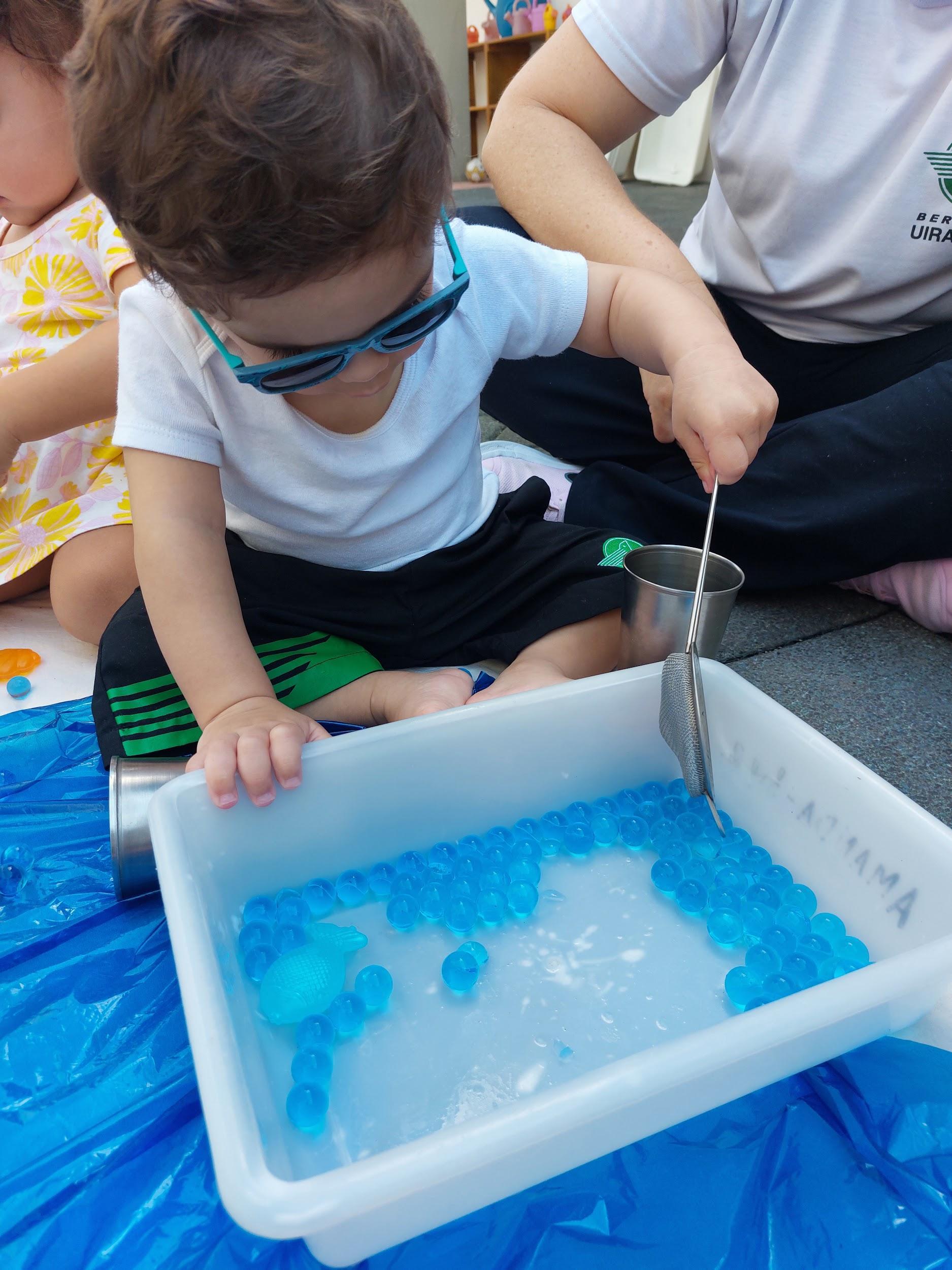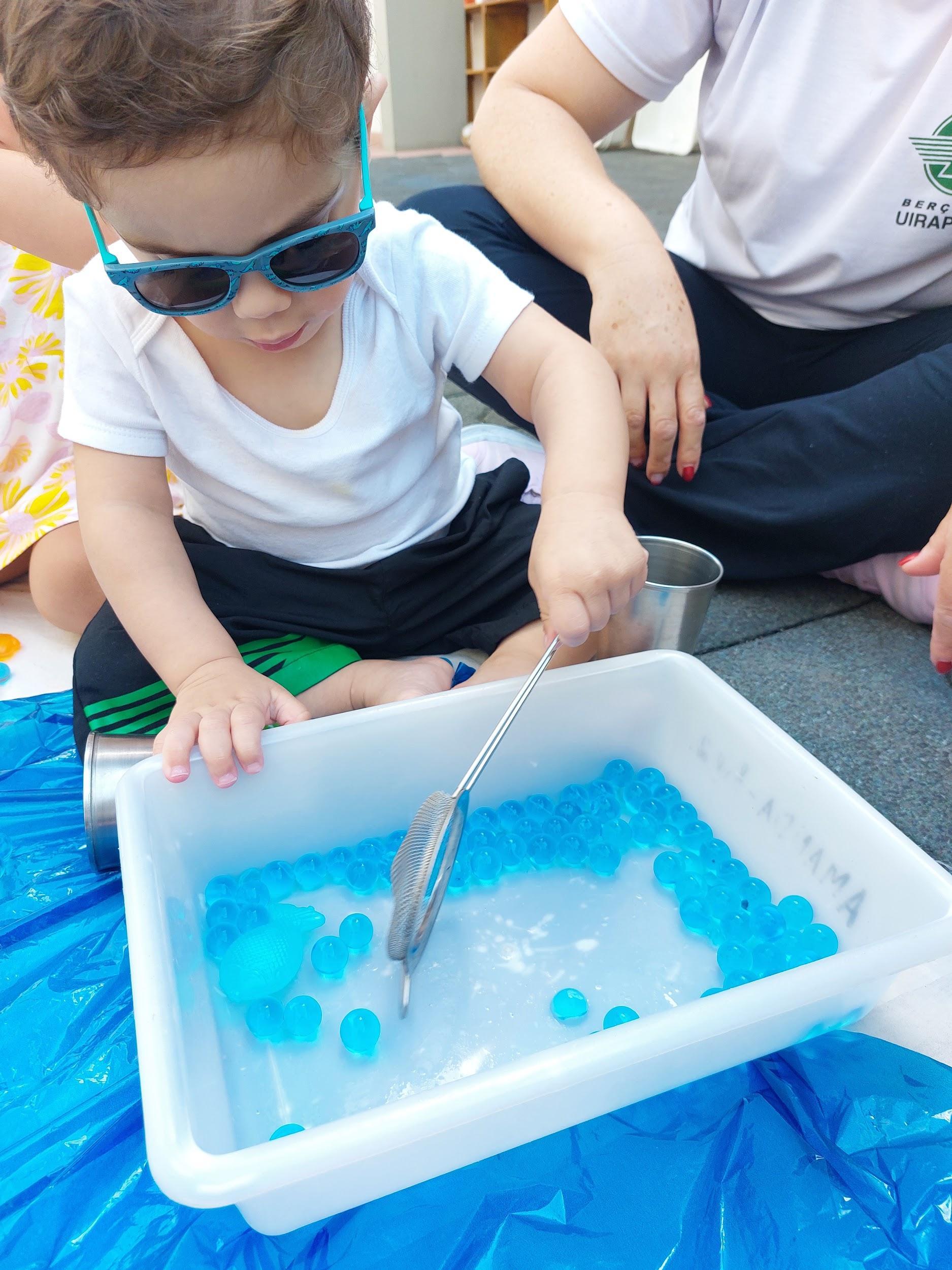 Com criatividade, ele sente a textura macia das bolinhas, transfere-as de uma bandeja para outra e, pega uma peneira para "pescar" os peixinhos, mergulhando ainda mais na brincadeira.