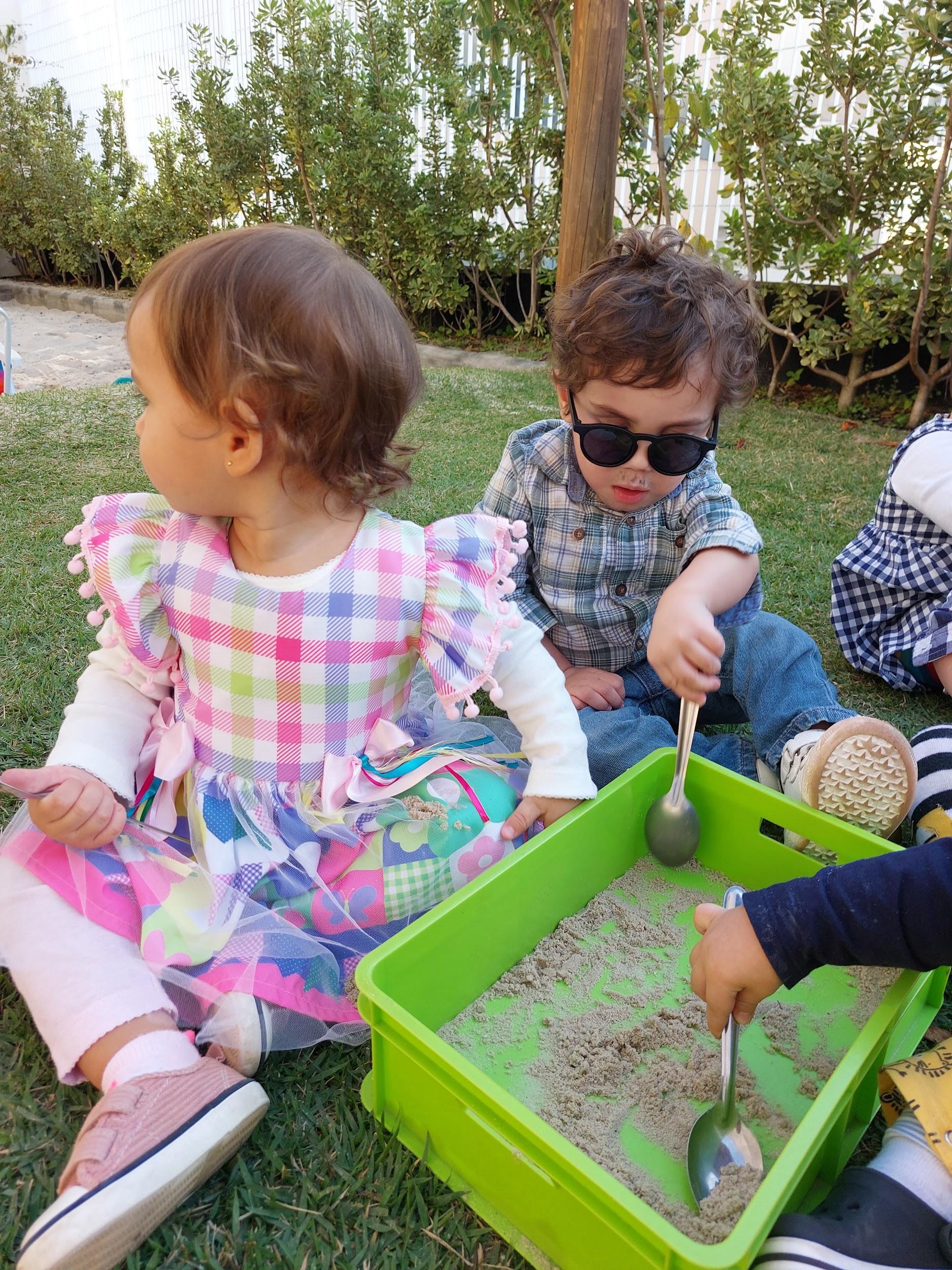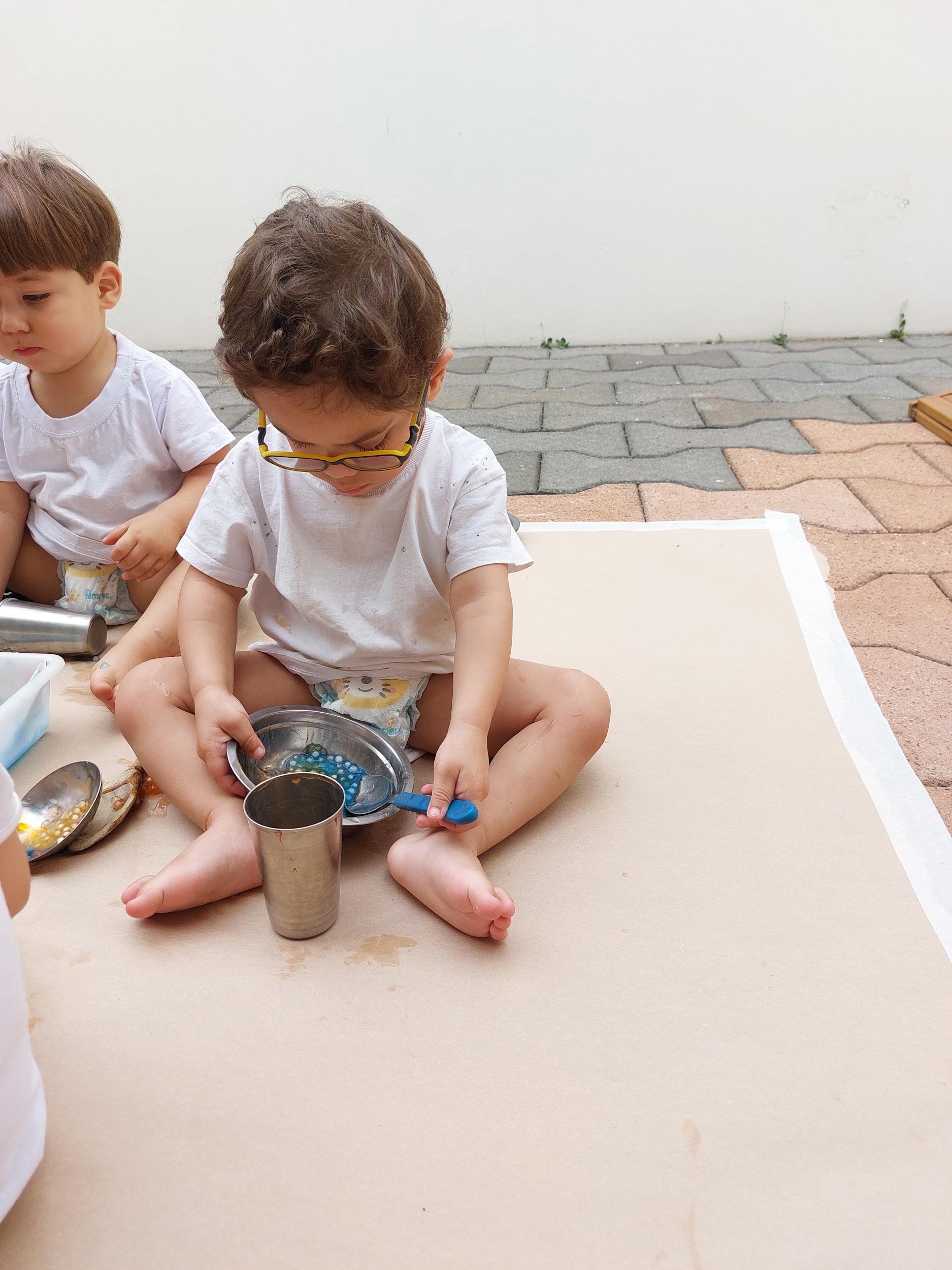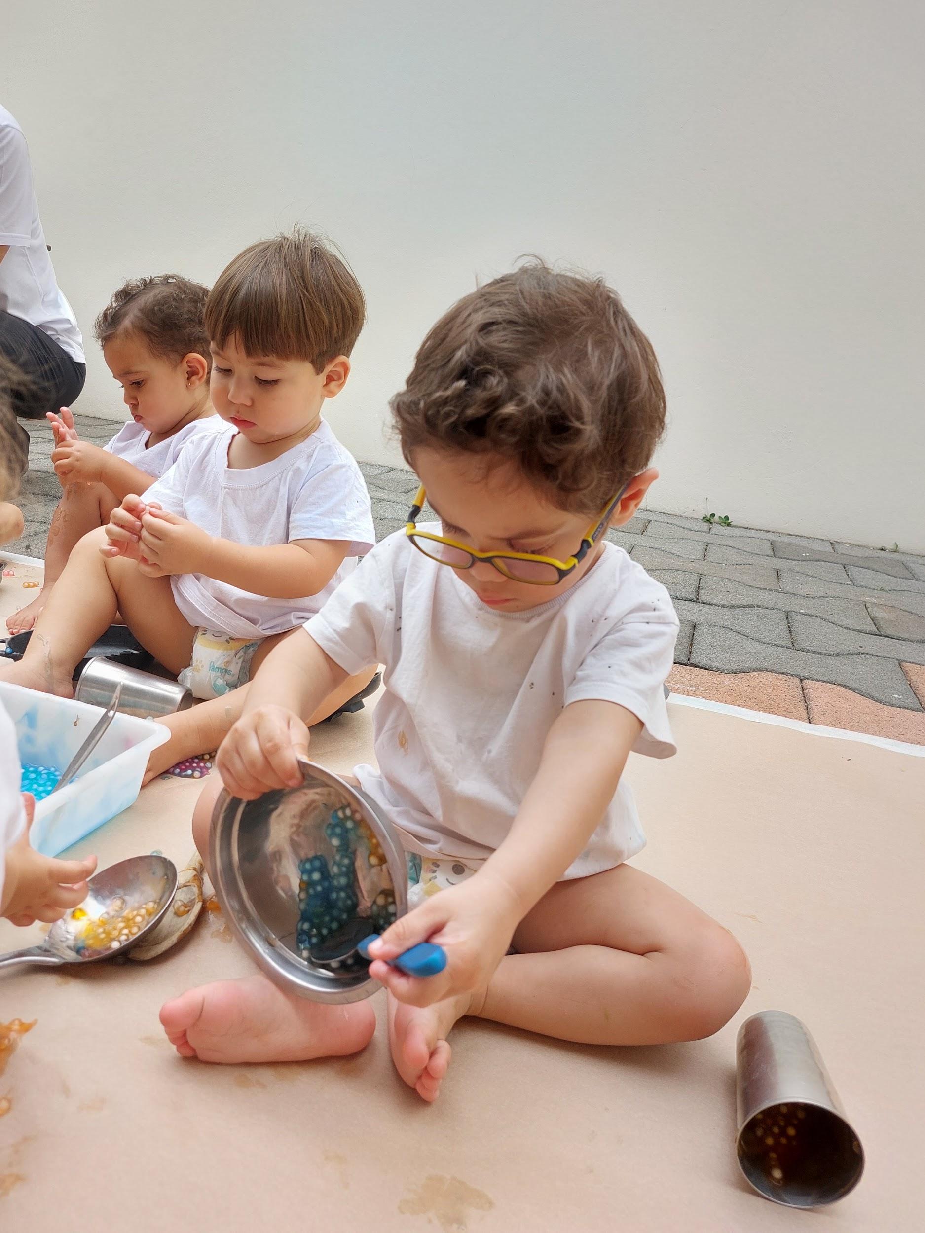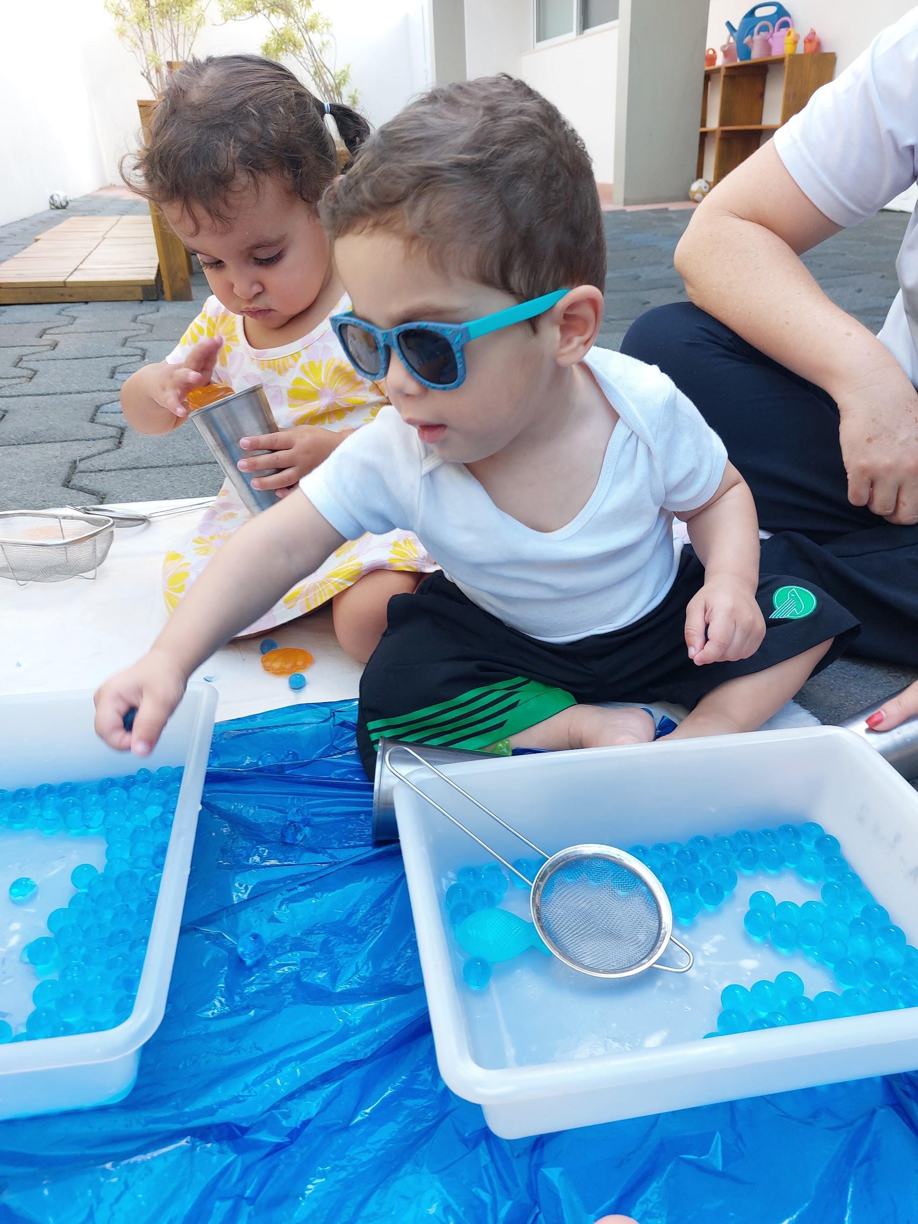 Com criatividade, ele sente a textura macia das bolinhas, transfere-as de uma bandeja para outra e, pega uma peneira para "pescar" os peixinhos, mergulhando ainda mais na brincadeira.