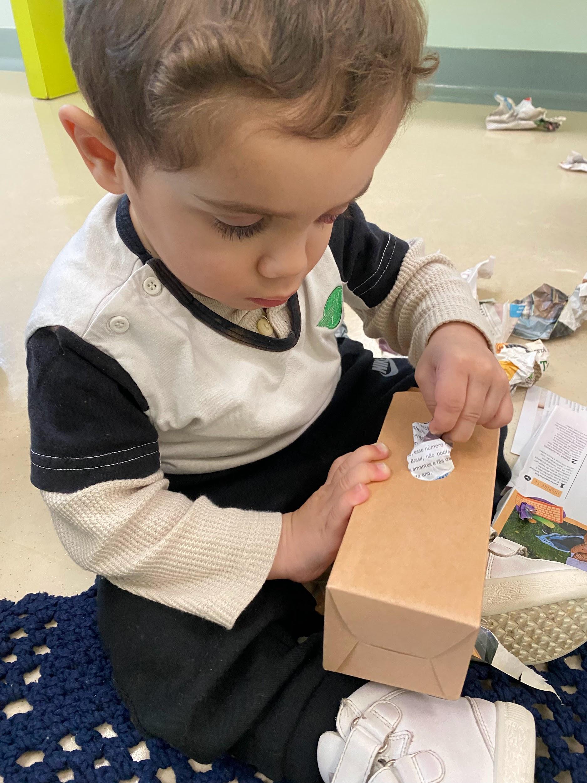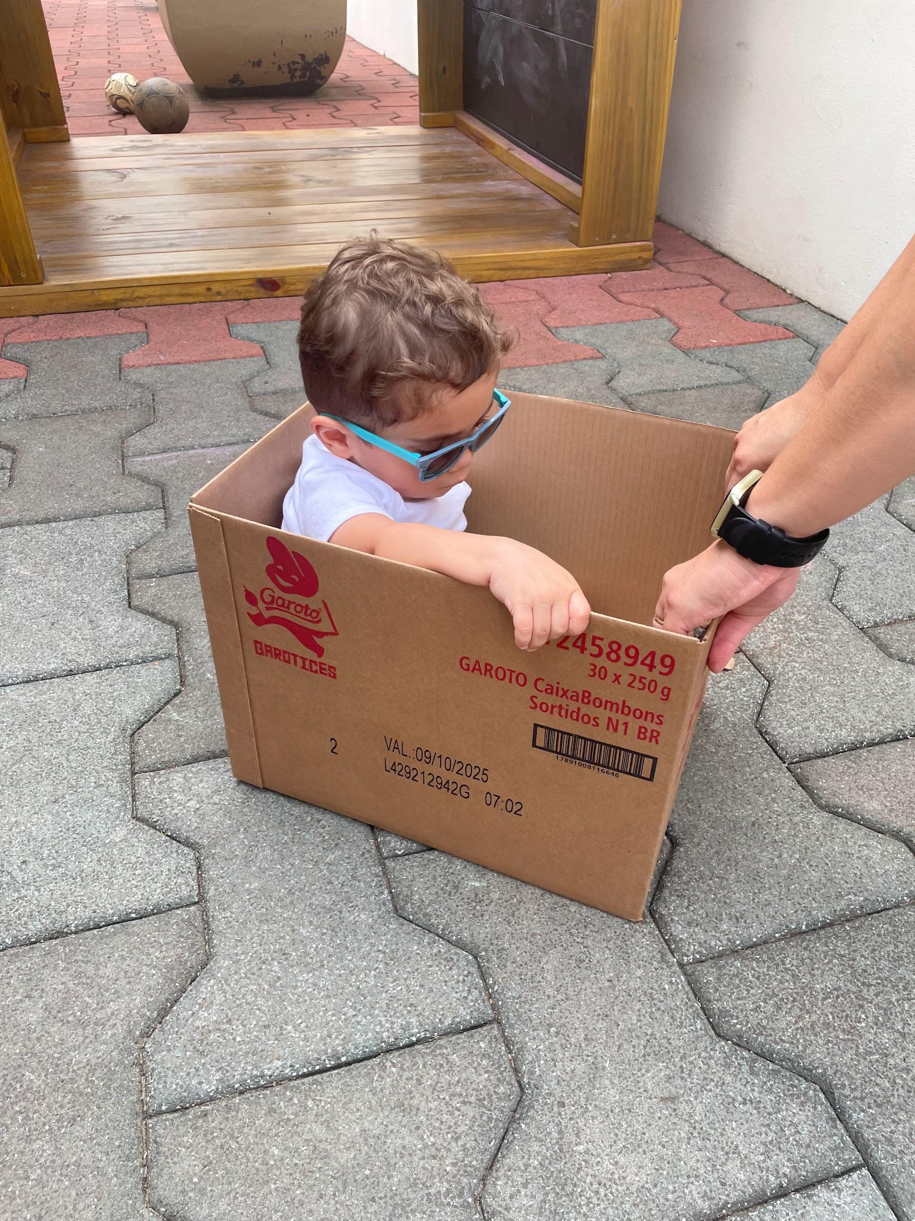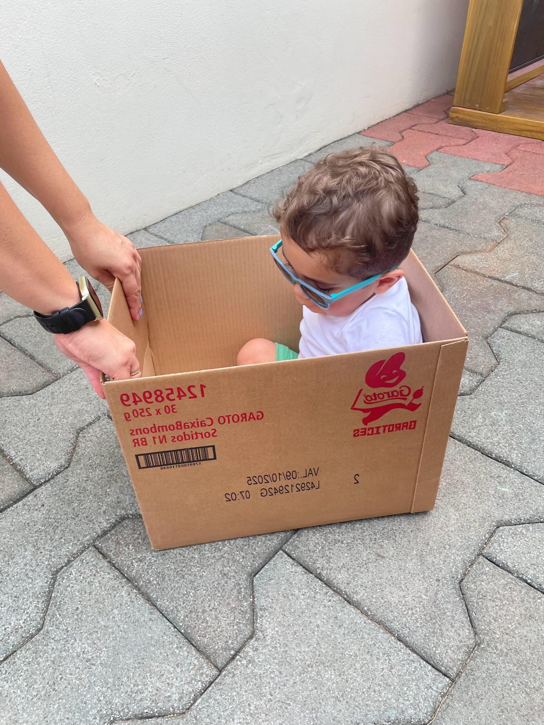 Assim, ele amplia sua experiência, explorando a caixa com curiosidade e transformando cada gesto em uma nova descoberta.