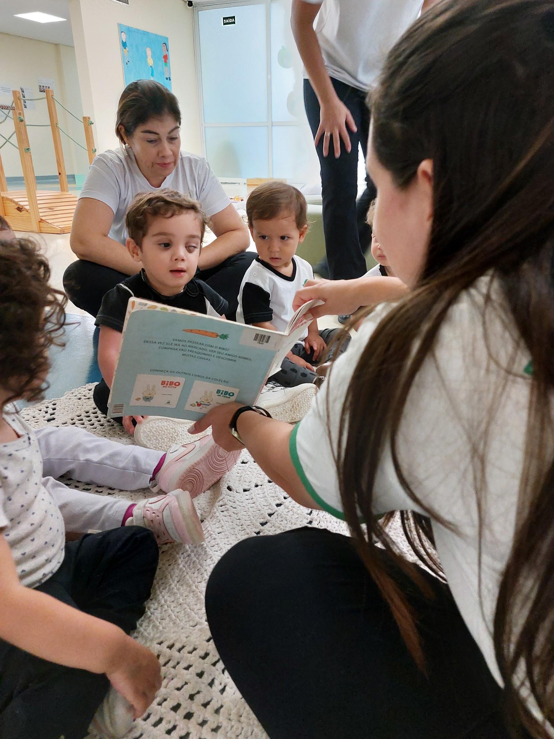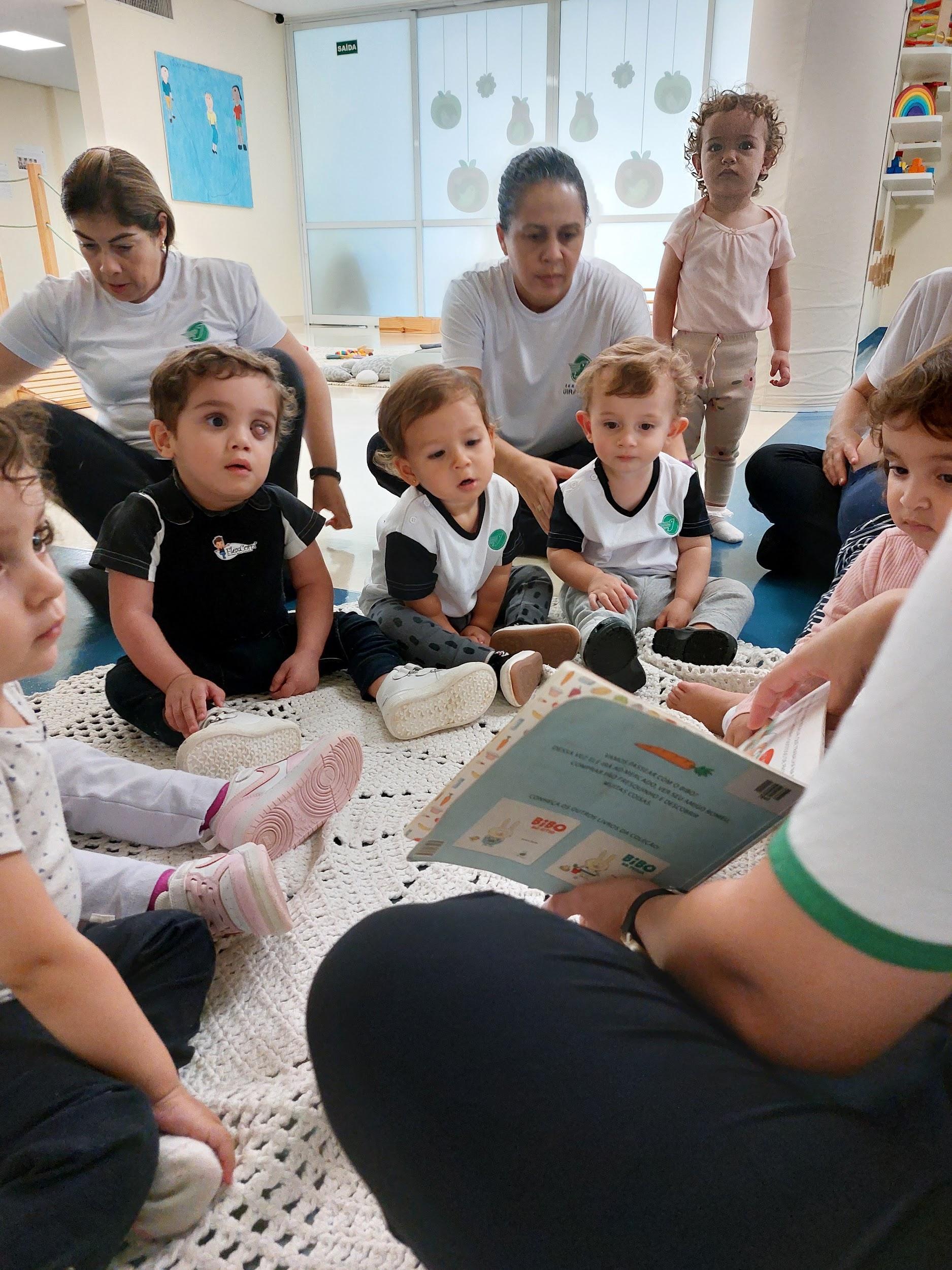 Na hora da história em roda, Ethan observa atentamente a educadora, absorvendo cada página contada.
