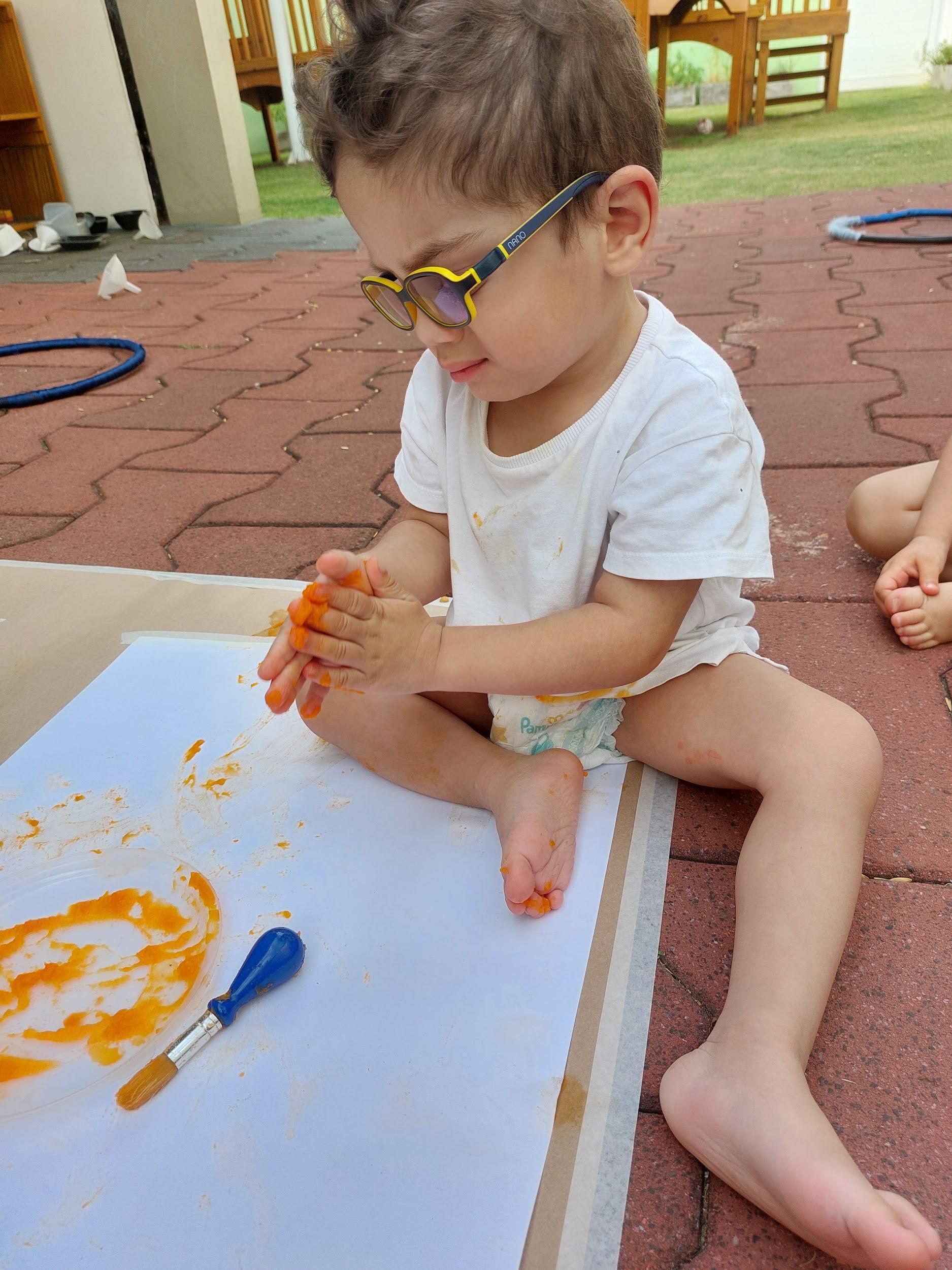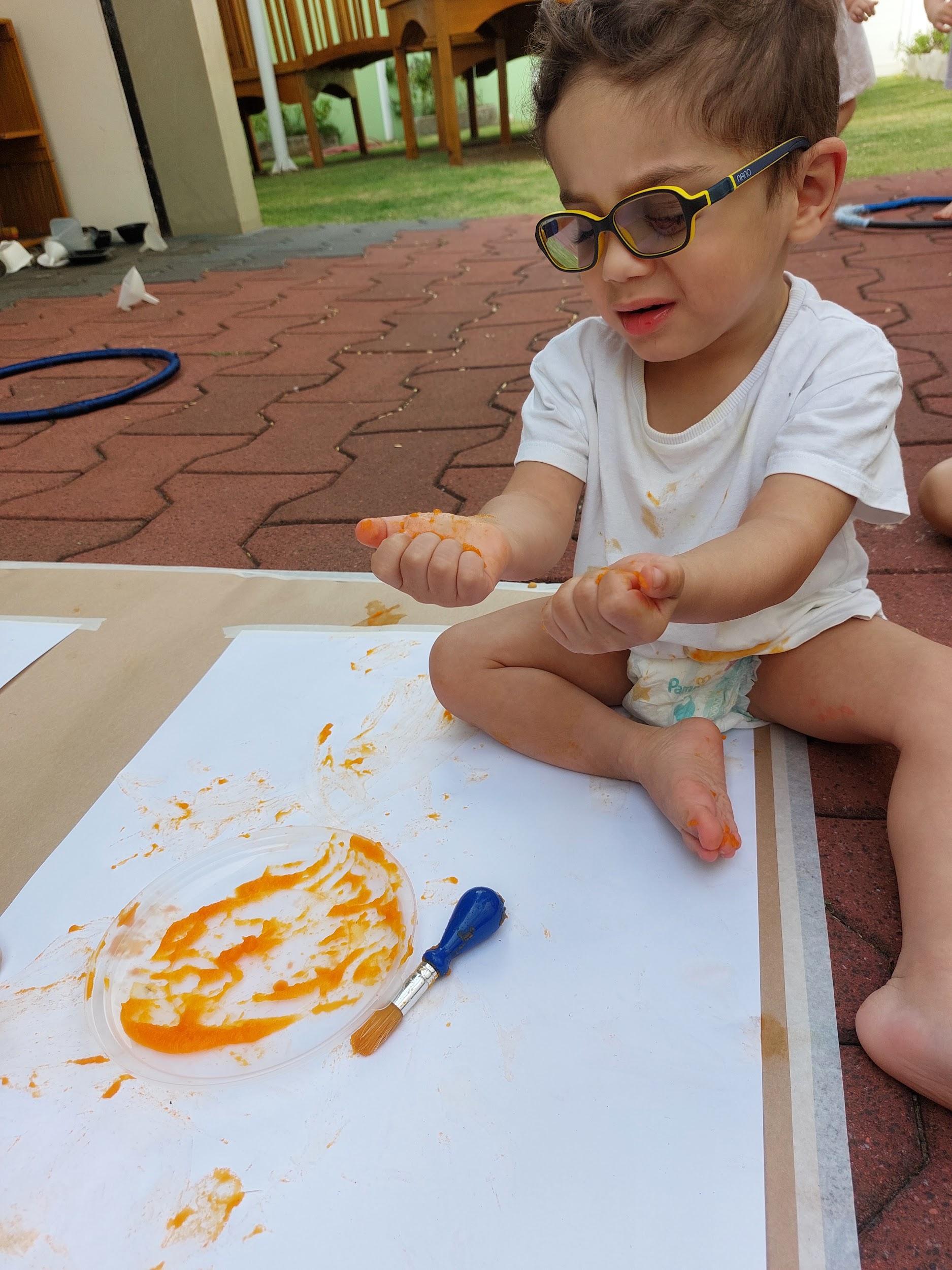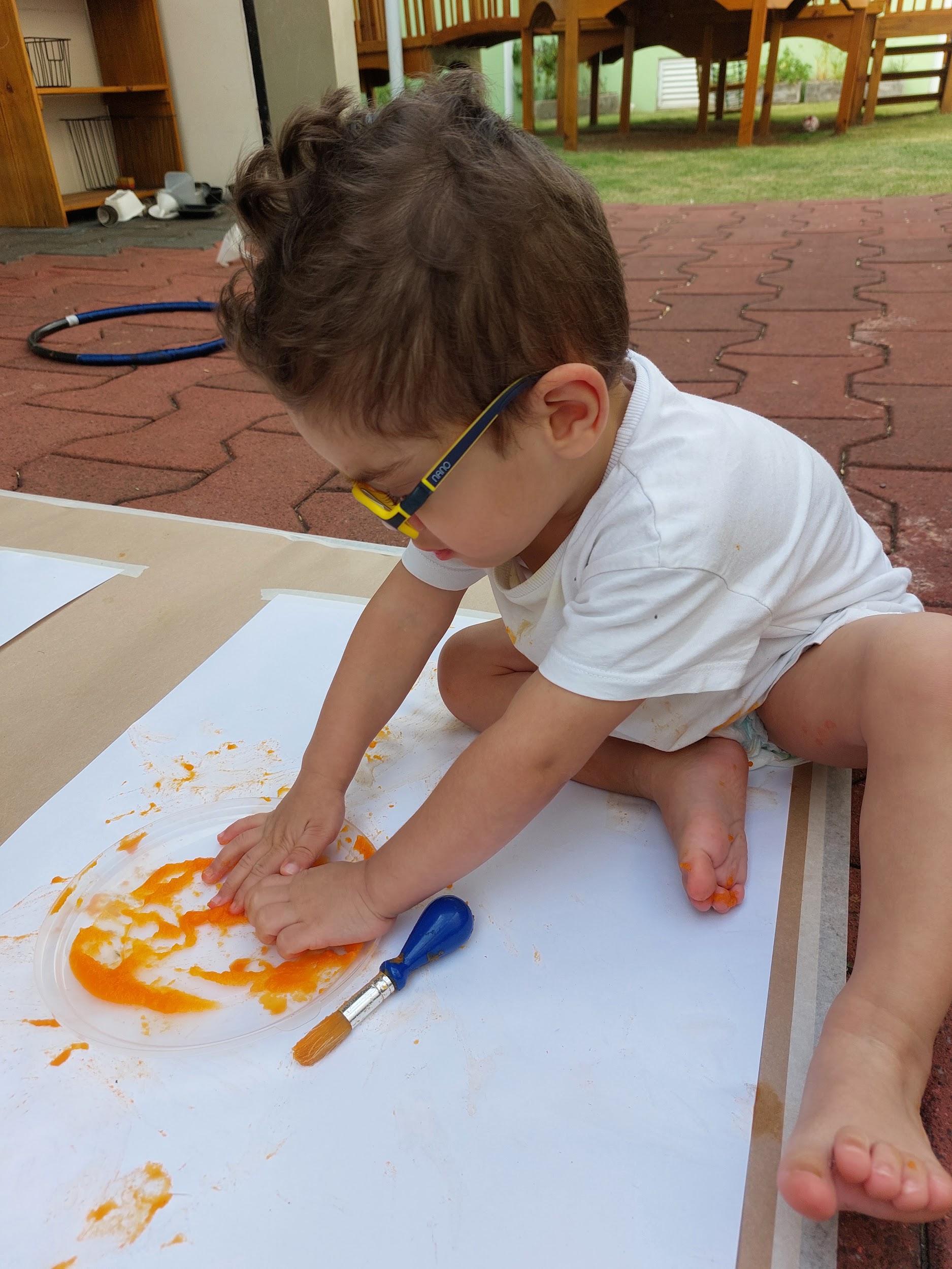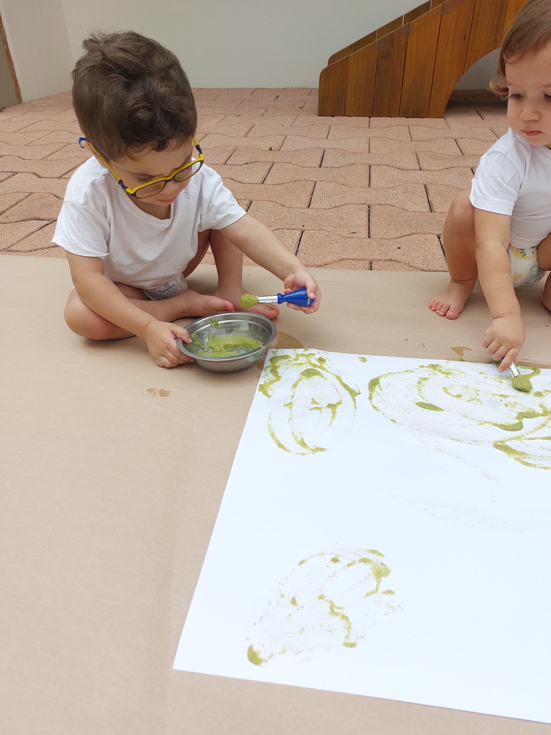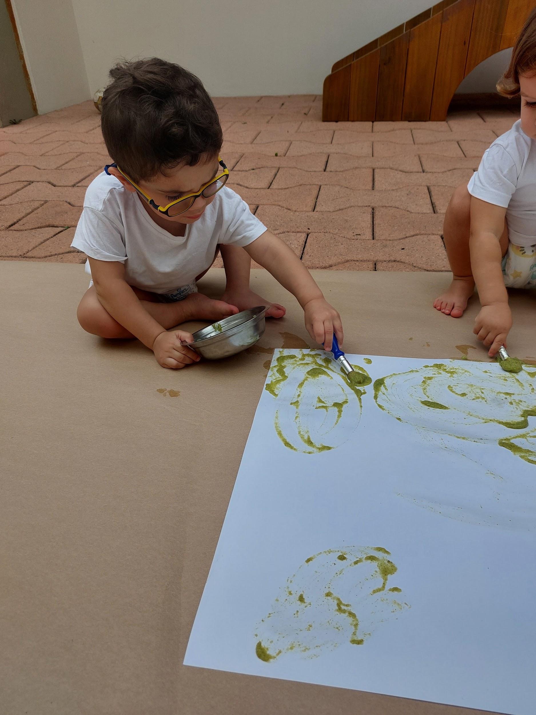 Com o pincel mergulhado na tinta de brócolis, Ethan deixa suas marcas no papel, explorando cada gesto com curiosidade crescente.