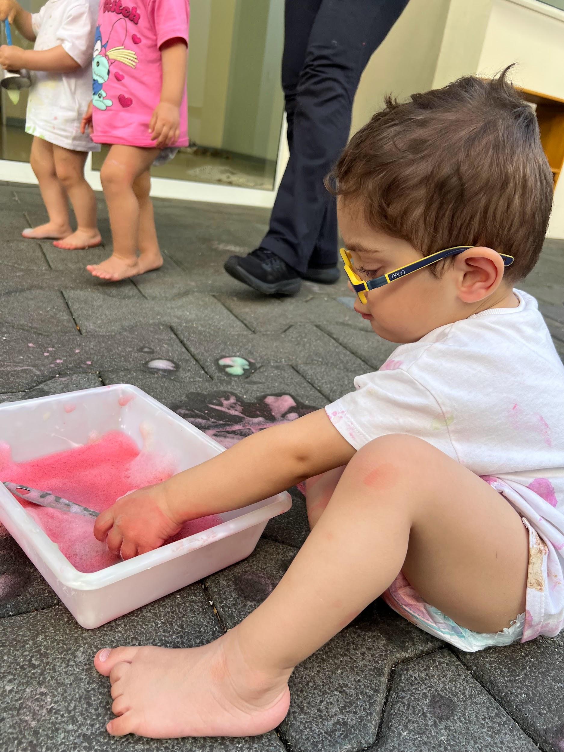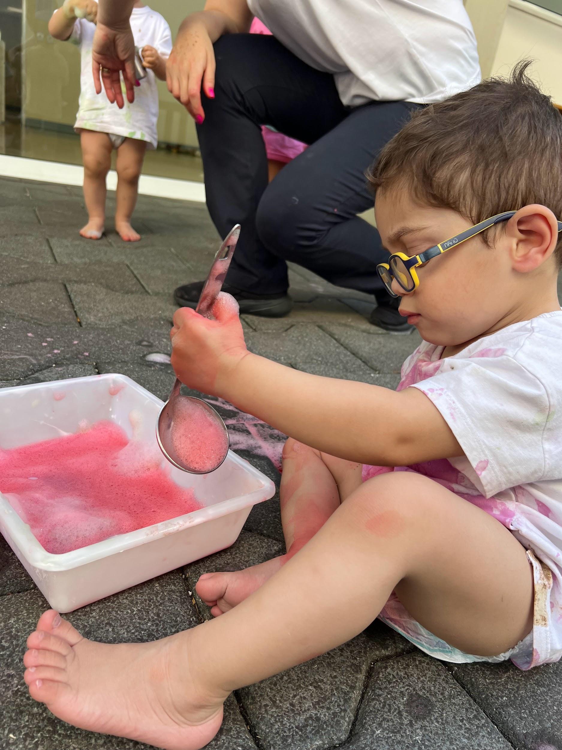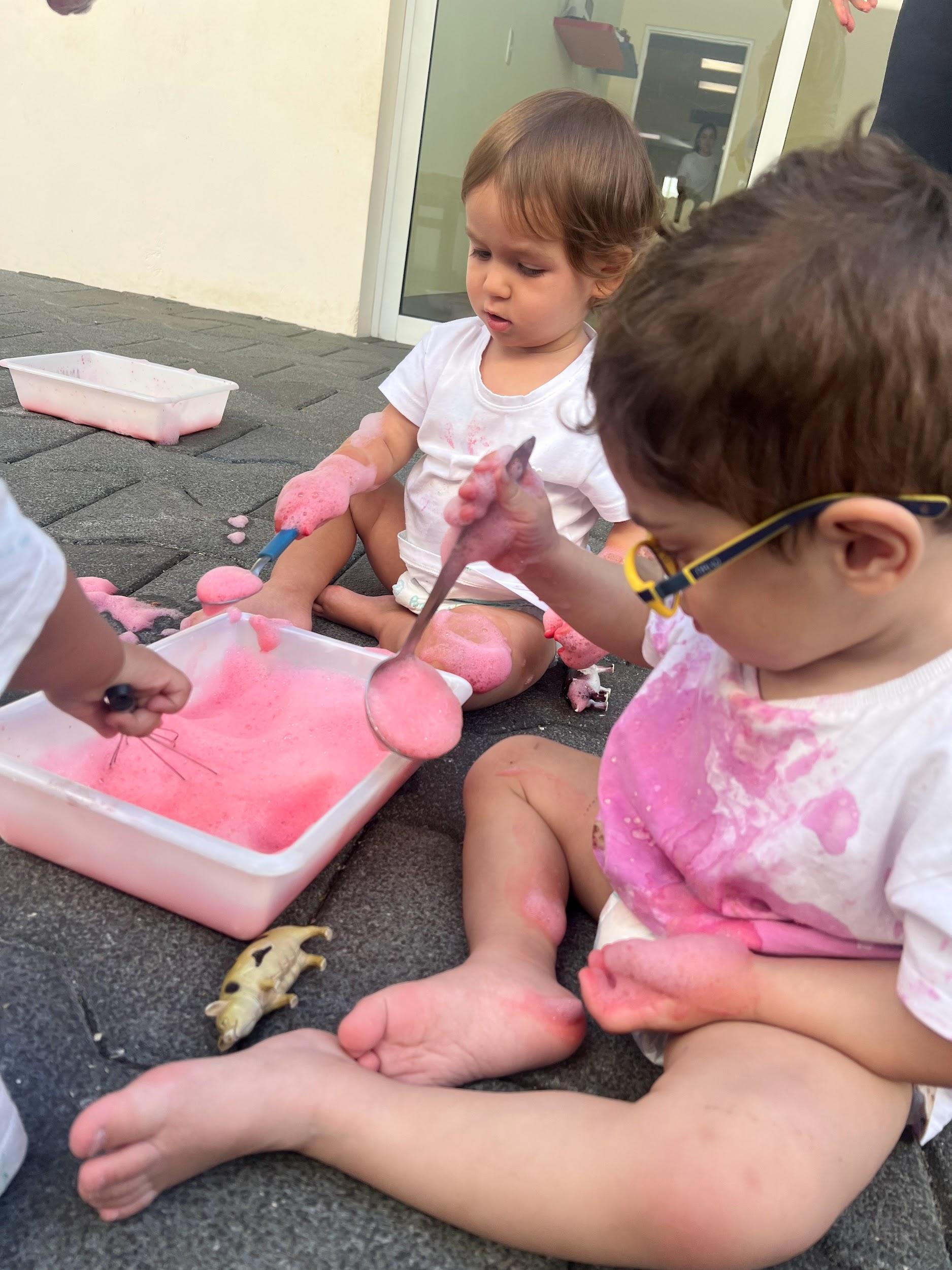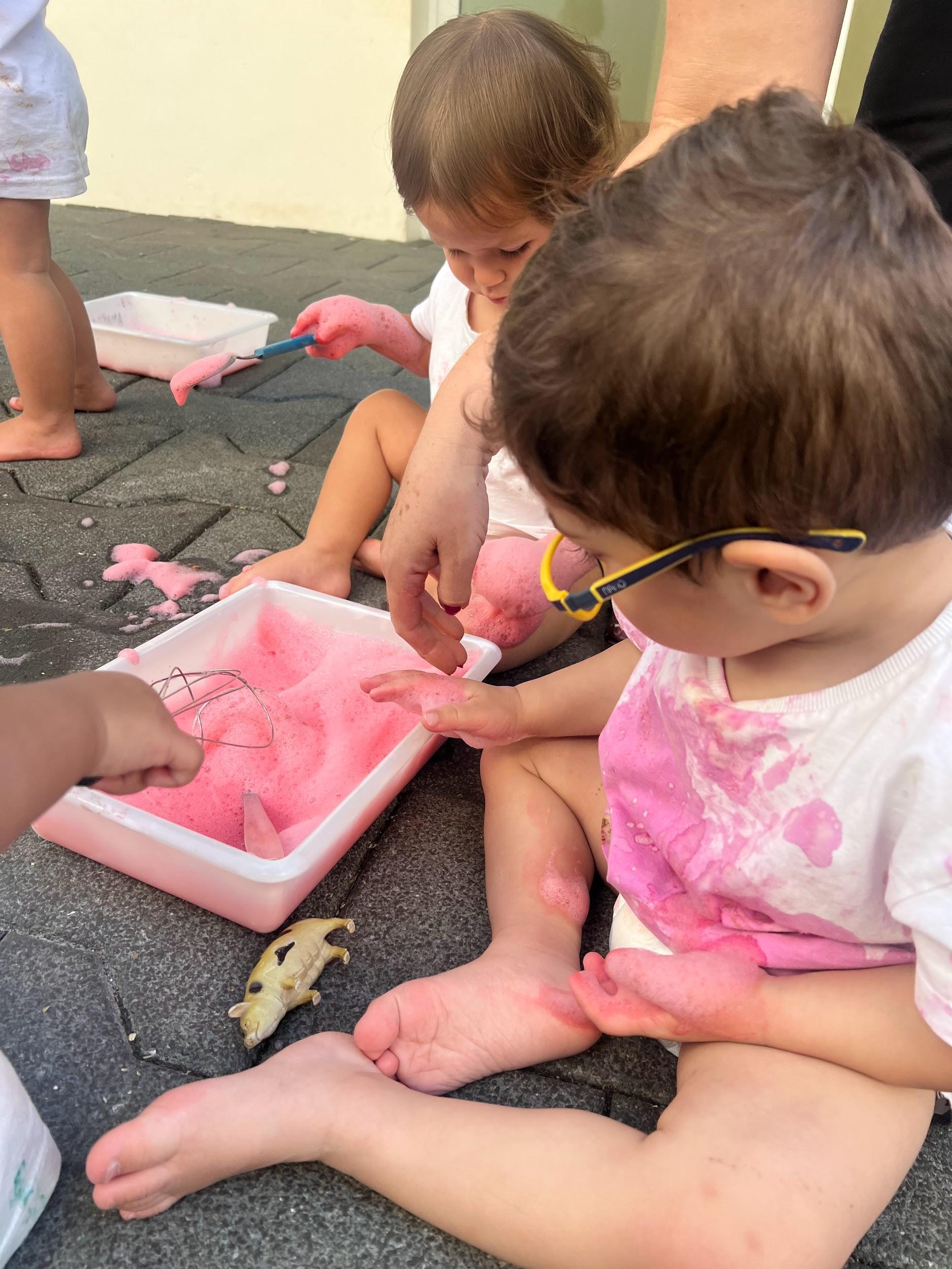Logo sente a espuma deslizando pelas mãos, passeando pelos dedos, tornando o momento uma experiência de descoberta sensorial cheia de alegria e encanto.