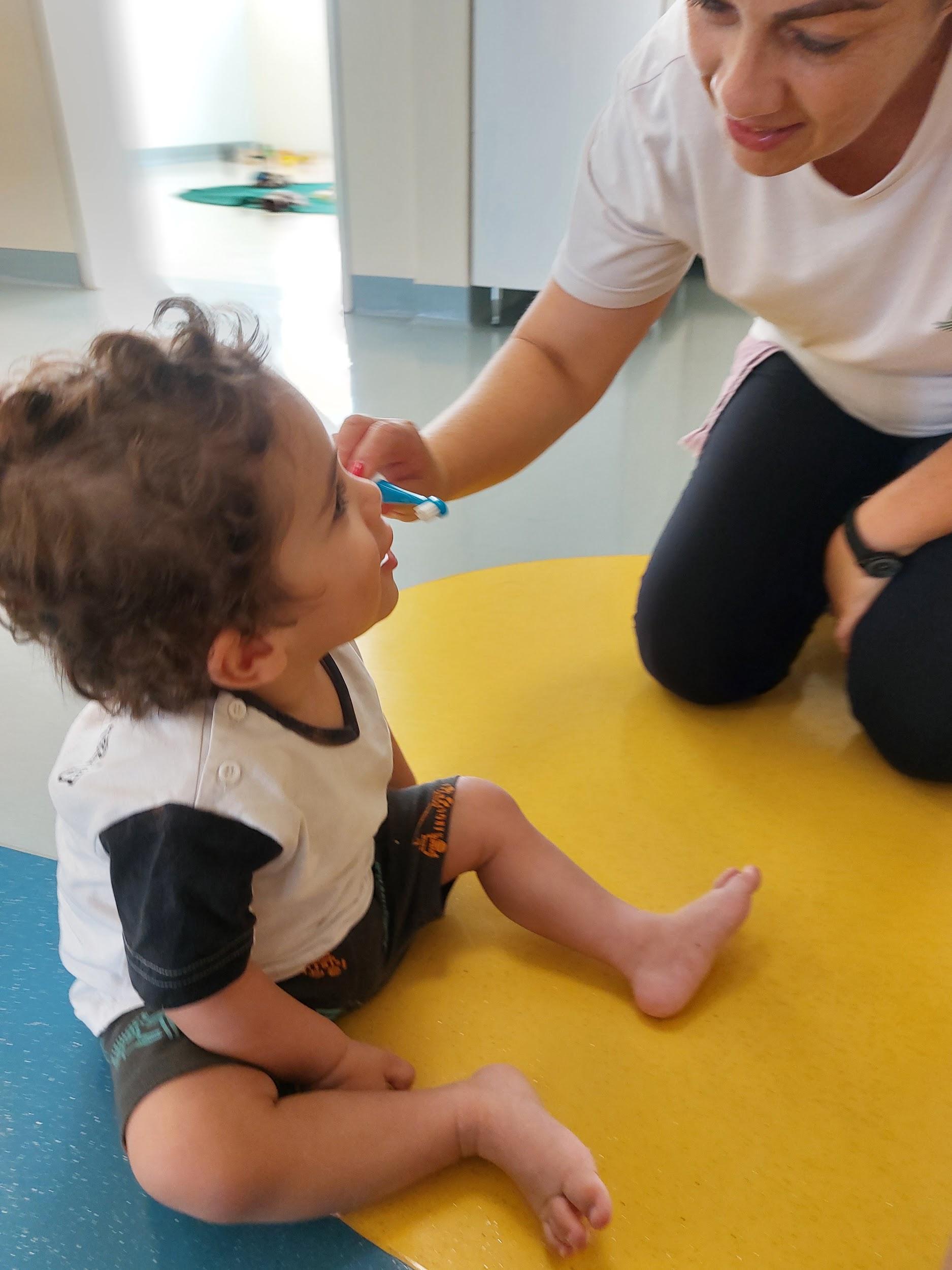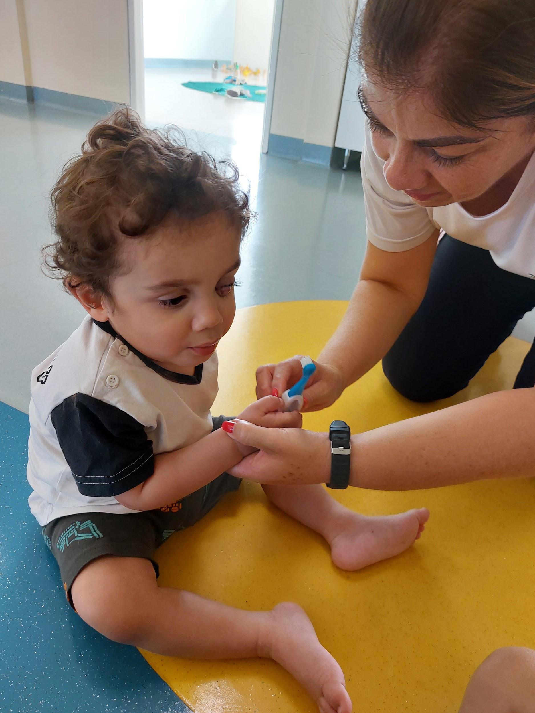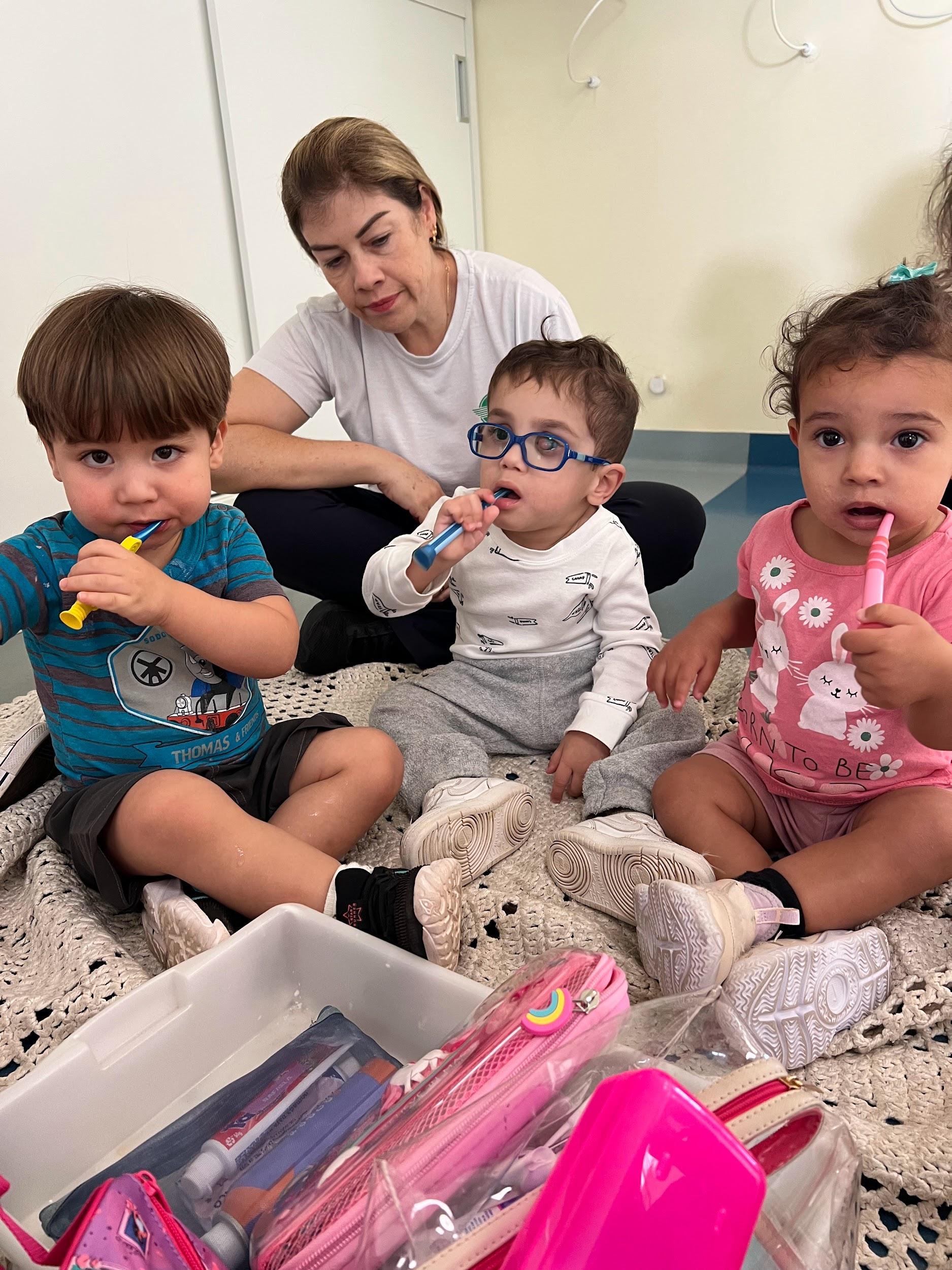 Ao sair do refeitório, dirige-se ao tapete, onde todas as crianças se reúnem para esse momento especial. A educadora distribui as escovas com a pasta de dente, mostrando a Ethan, passo a passo, como fazer, e entregando a escova em sua mão.