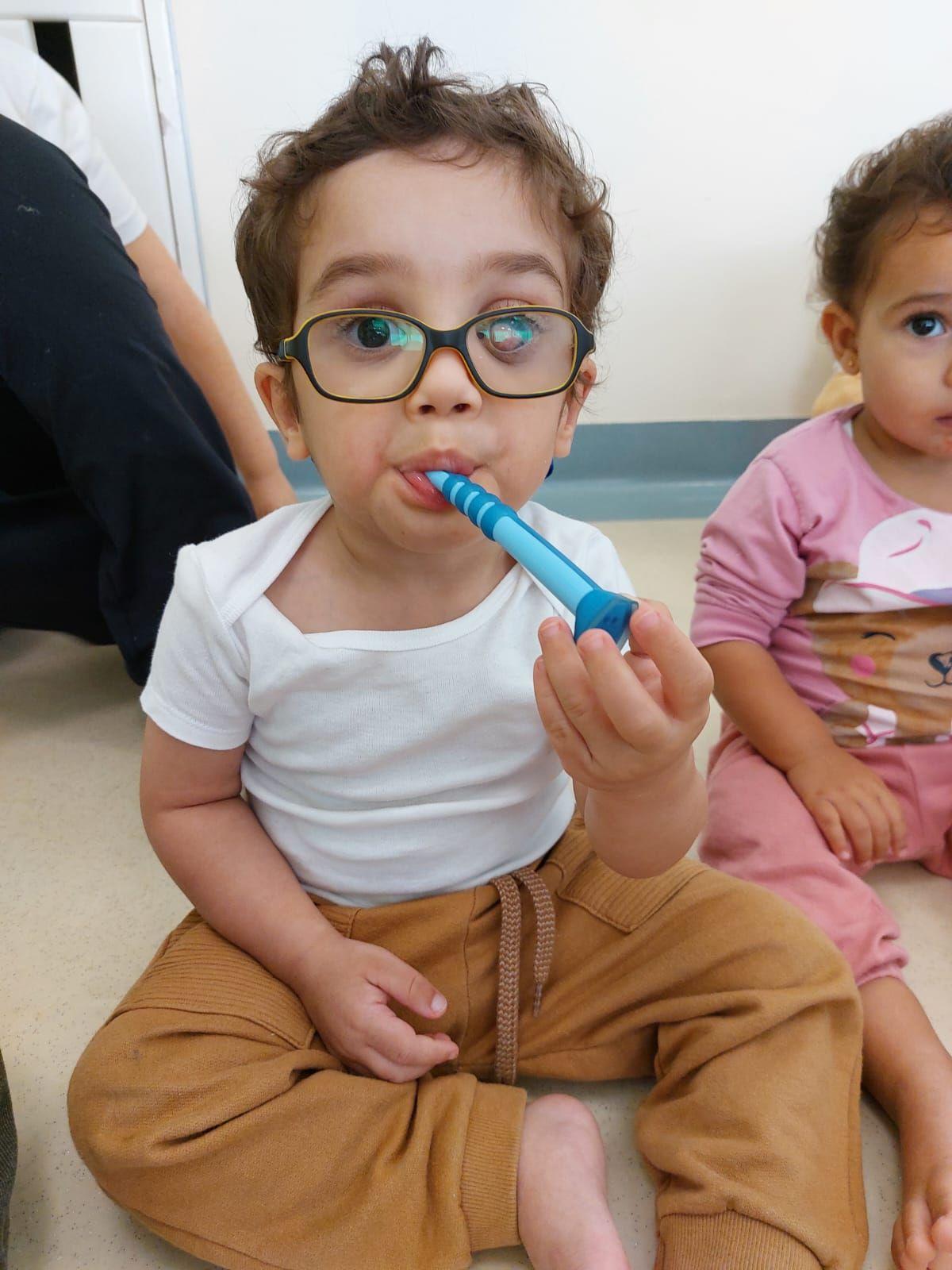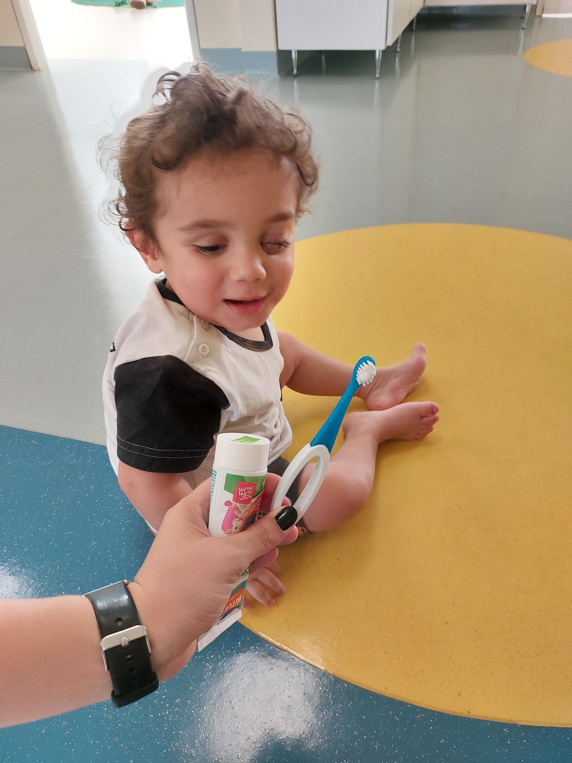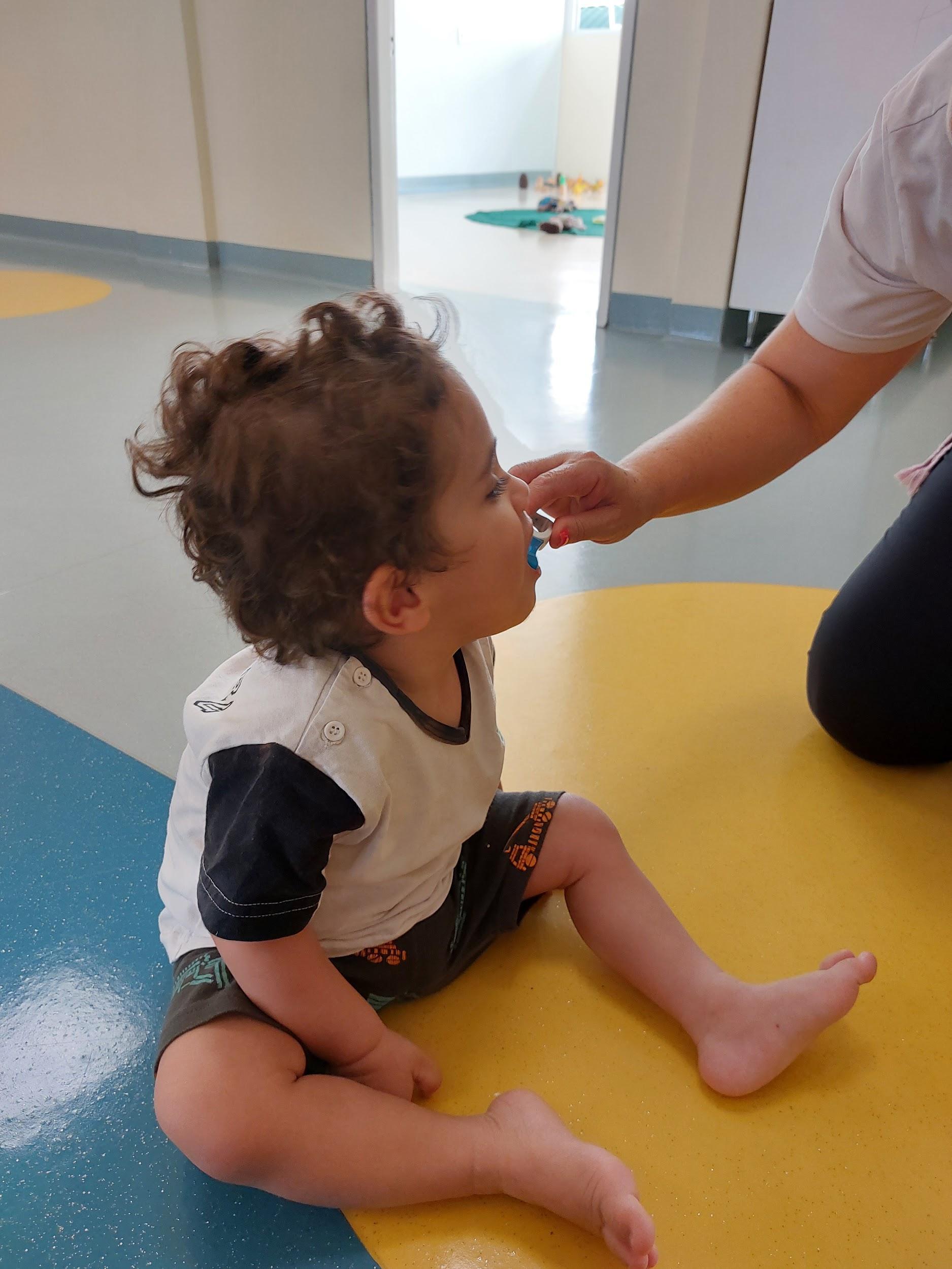 Ao sair do refeitório, dirige-se ao tapete, onde todas as crianças se reúnem para esse momento especial. A educadora distribui as escovas com a pasta de dente, mostrando a Ethan, passo a passo, como fazer, e entregando a escova em sua mão.