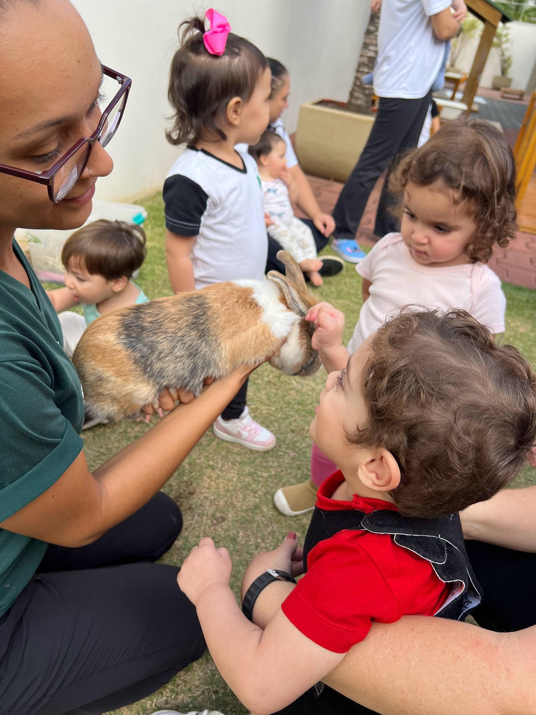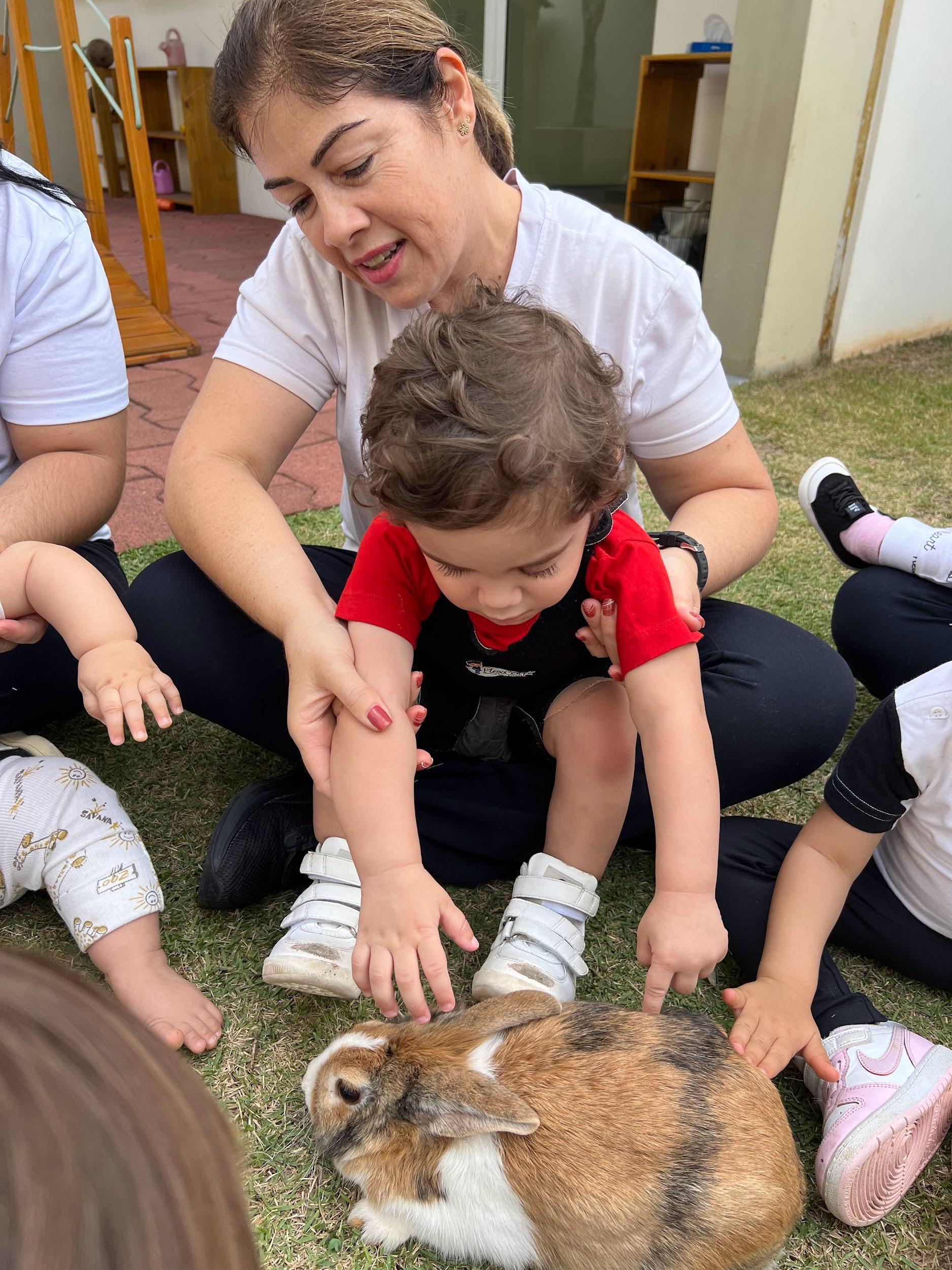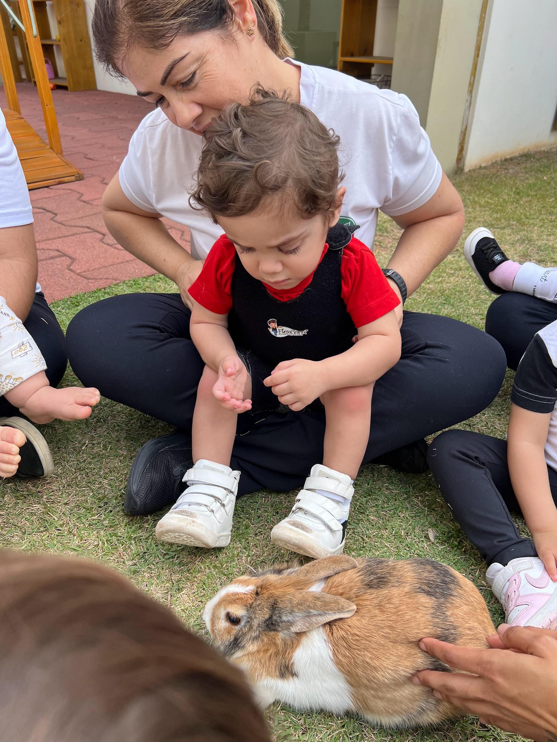 Em outro momento, já no colo do adulto que o acompanha, sua atenção se volta para o coelho.