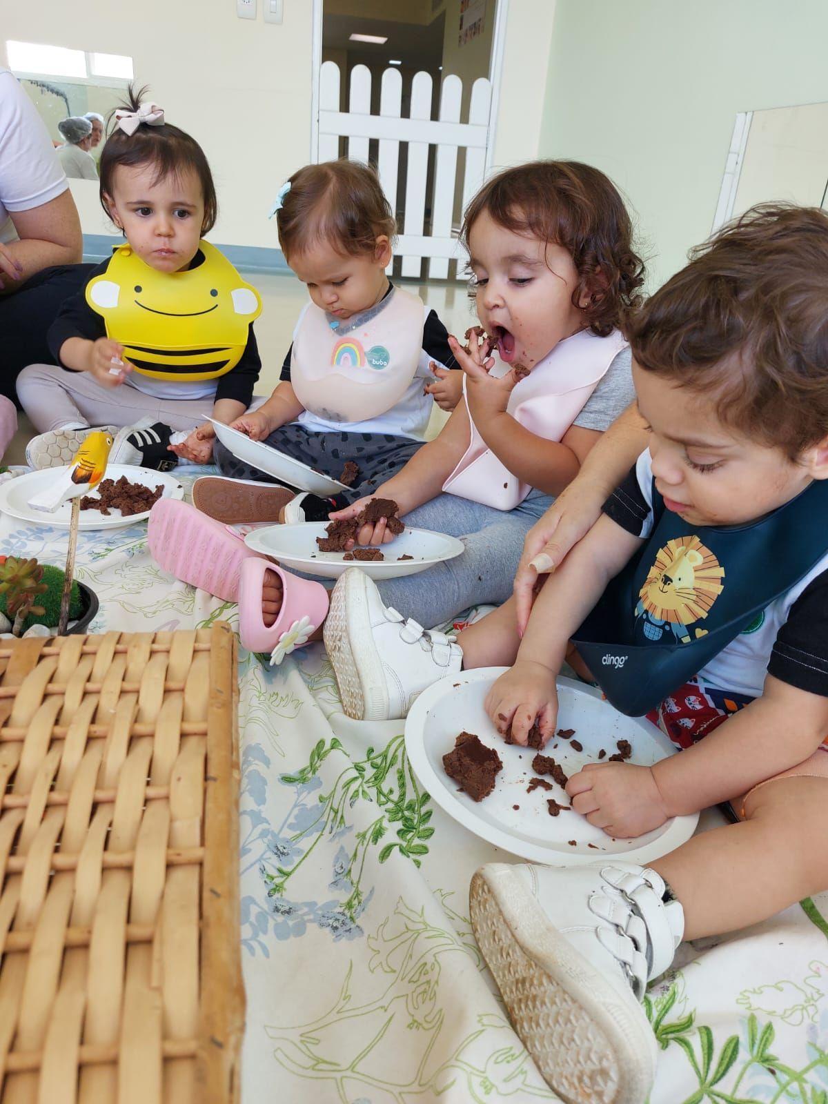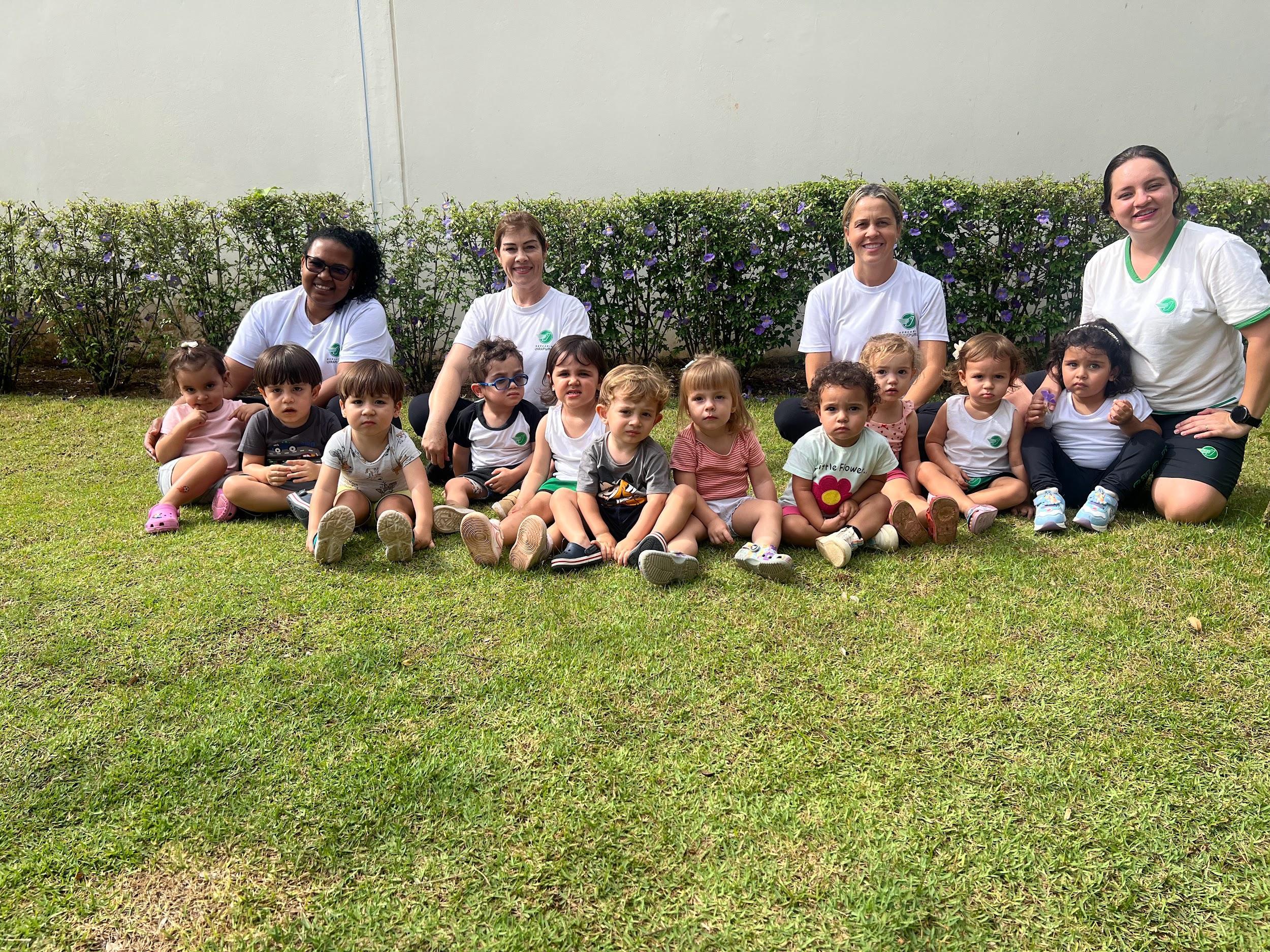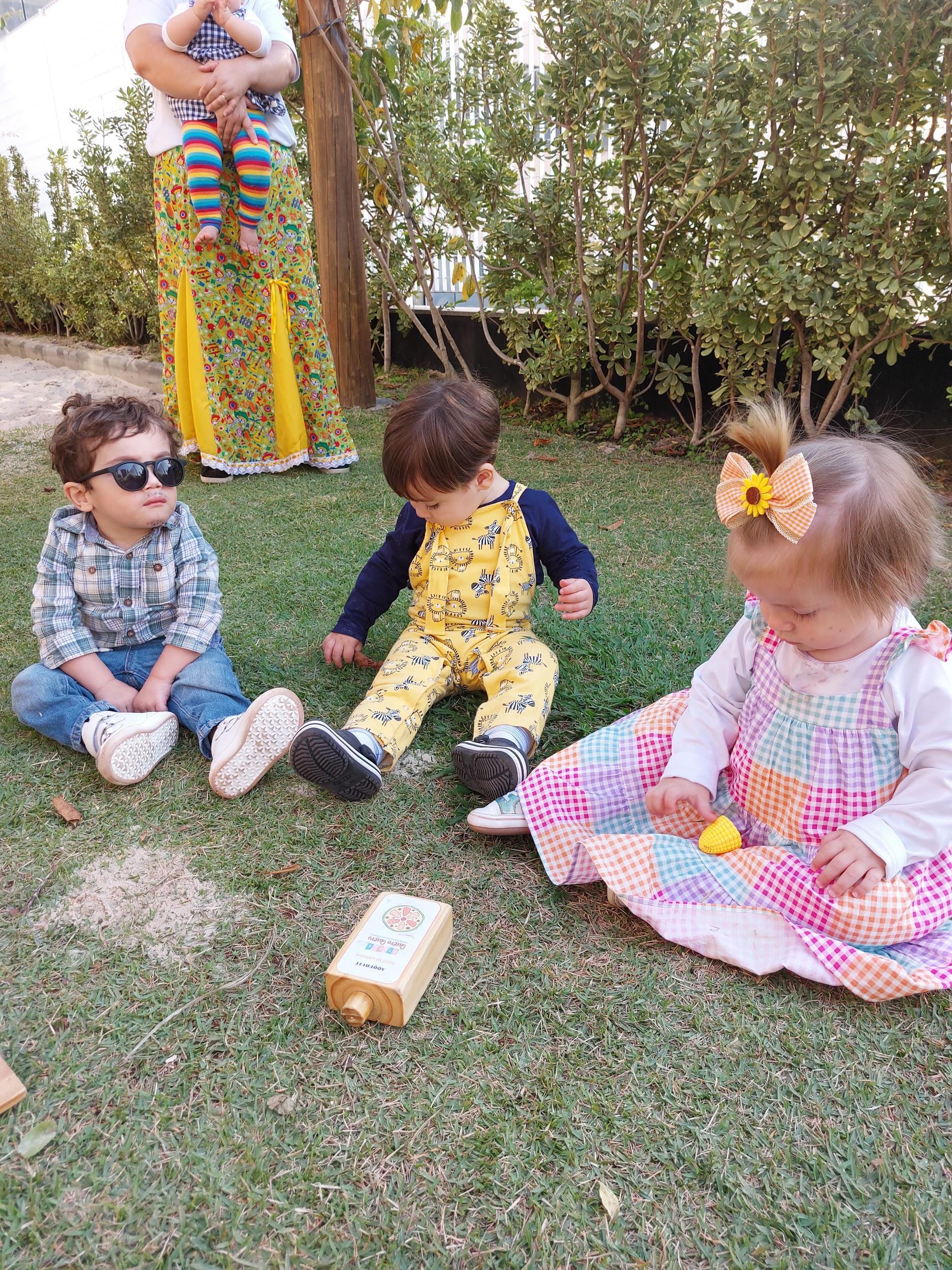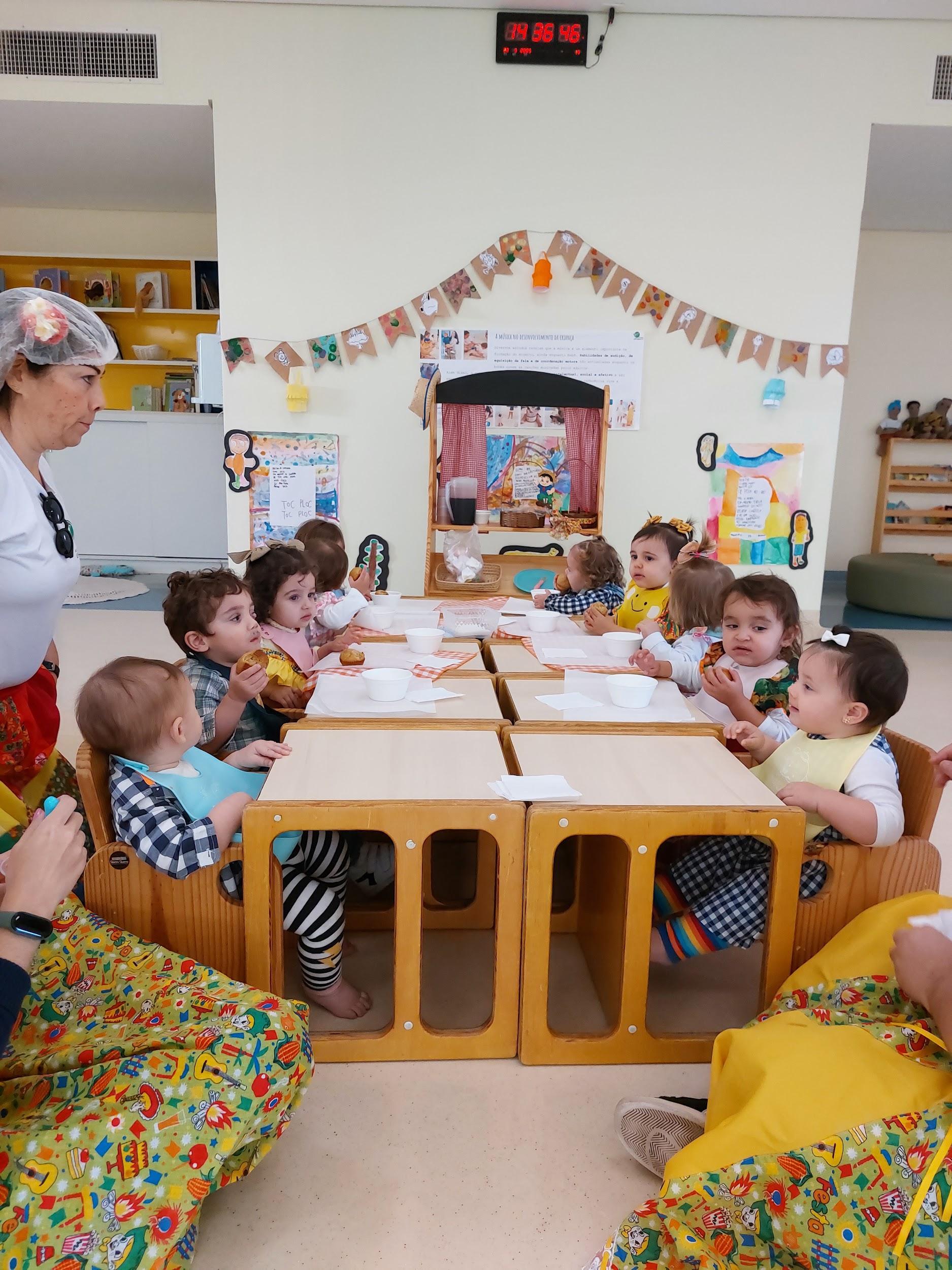 Uma lembrança doce de Ethan na festa junina do berçário, sentado à mesa entre os amigos, partilhando sabores e sorrisos que aquecem o instante. Ele posa para a foto com a delicadeza de quem vive o momento com encanto. E, no abraço coletivo e alegre, tias e amigos ao redor, todos envolvidos pela mesma festa que se faz memória, afeto e brilho nos olhos