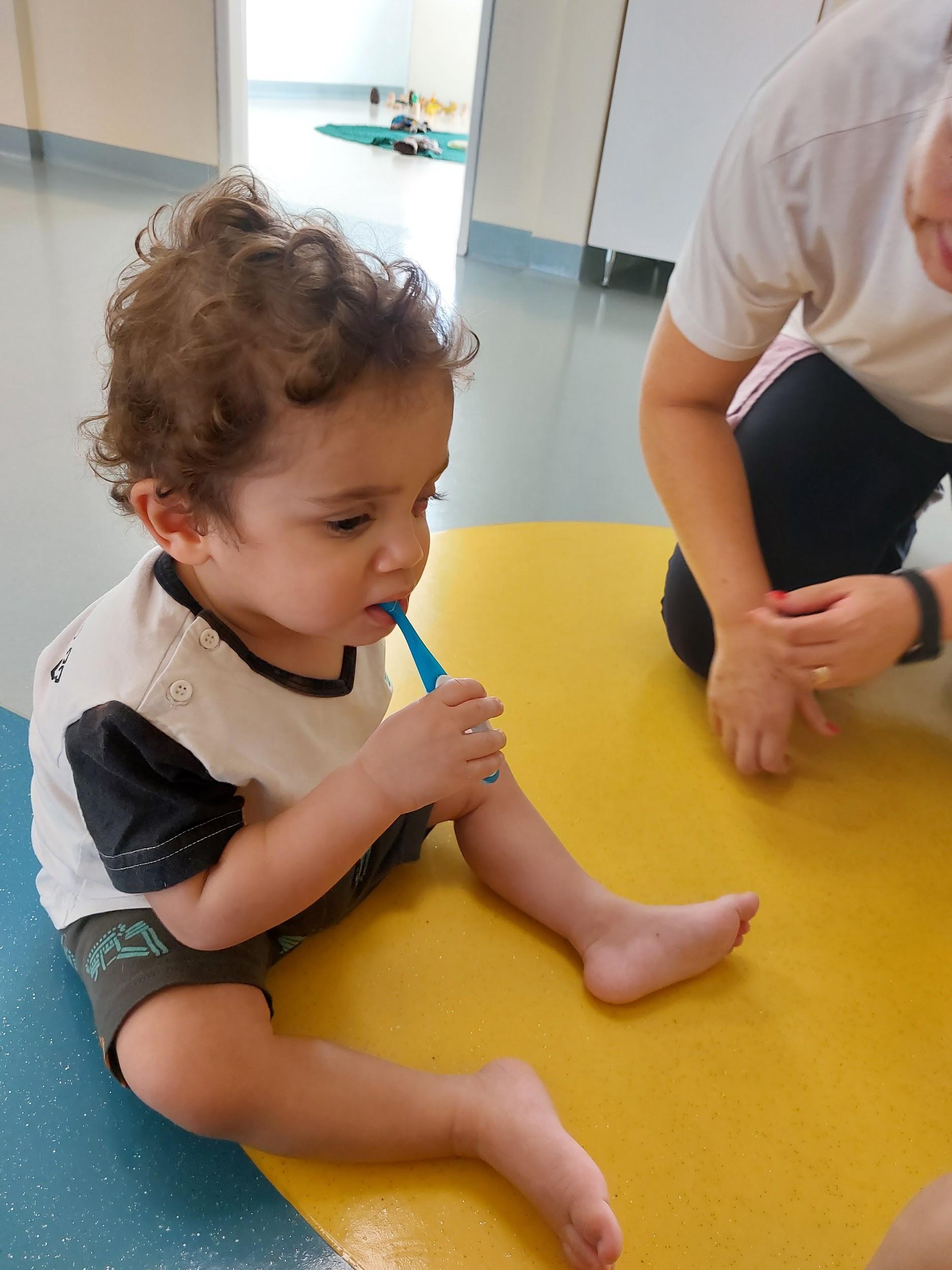 Ethan vive com alegria os pequenos rituais de autocuidado do dia a dia. Todos os dias, após a refeição, ele escova os dentes, cultivando desde cedo autonomia e hábitos saudáveis.