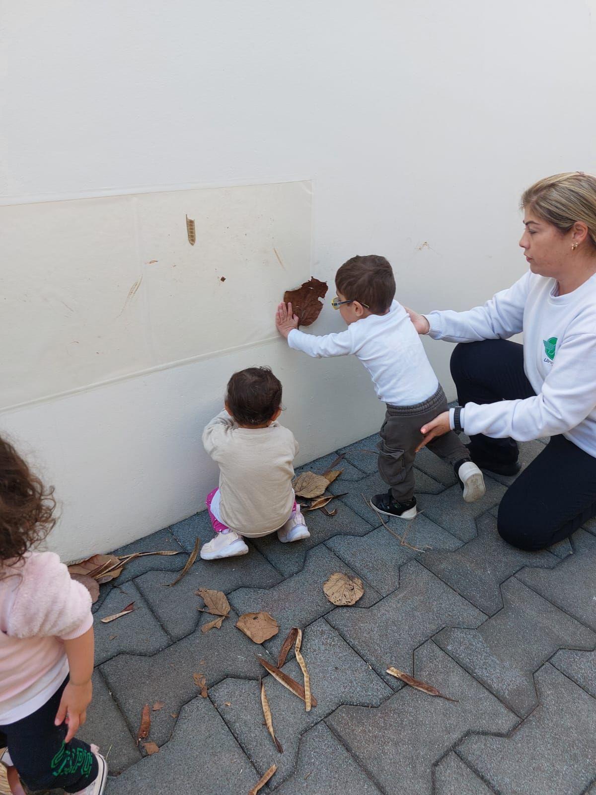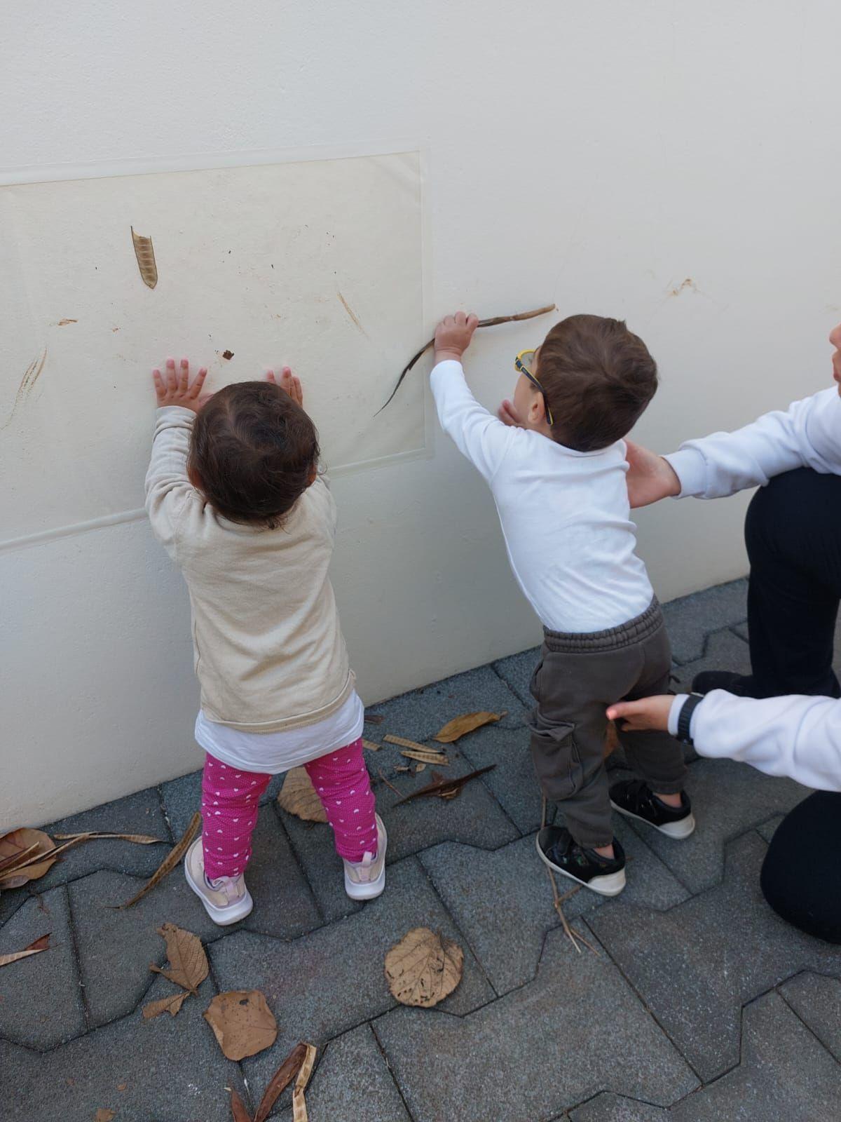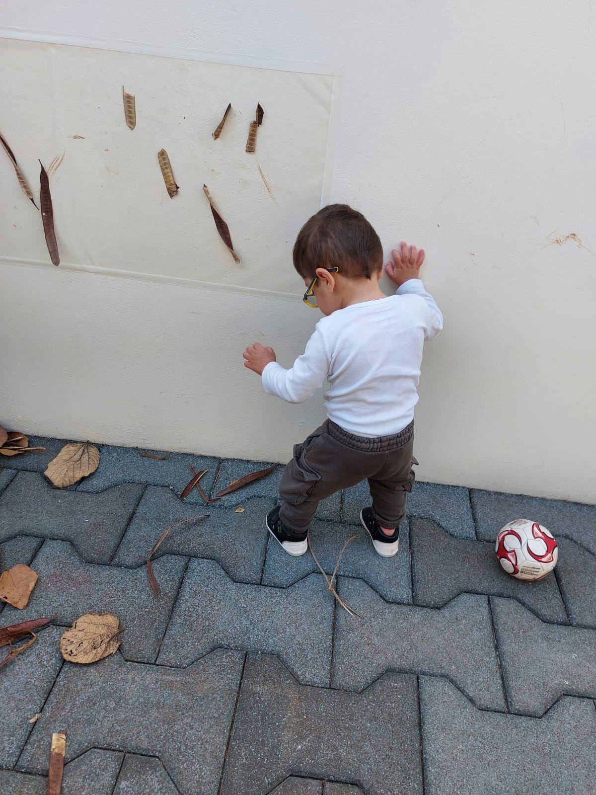 Com as mãos curiosas, Ethan pegou galhos e folhas e começou a fixá-los no papel