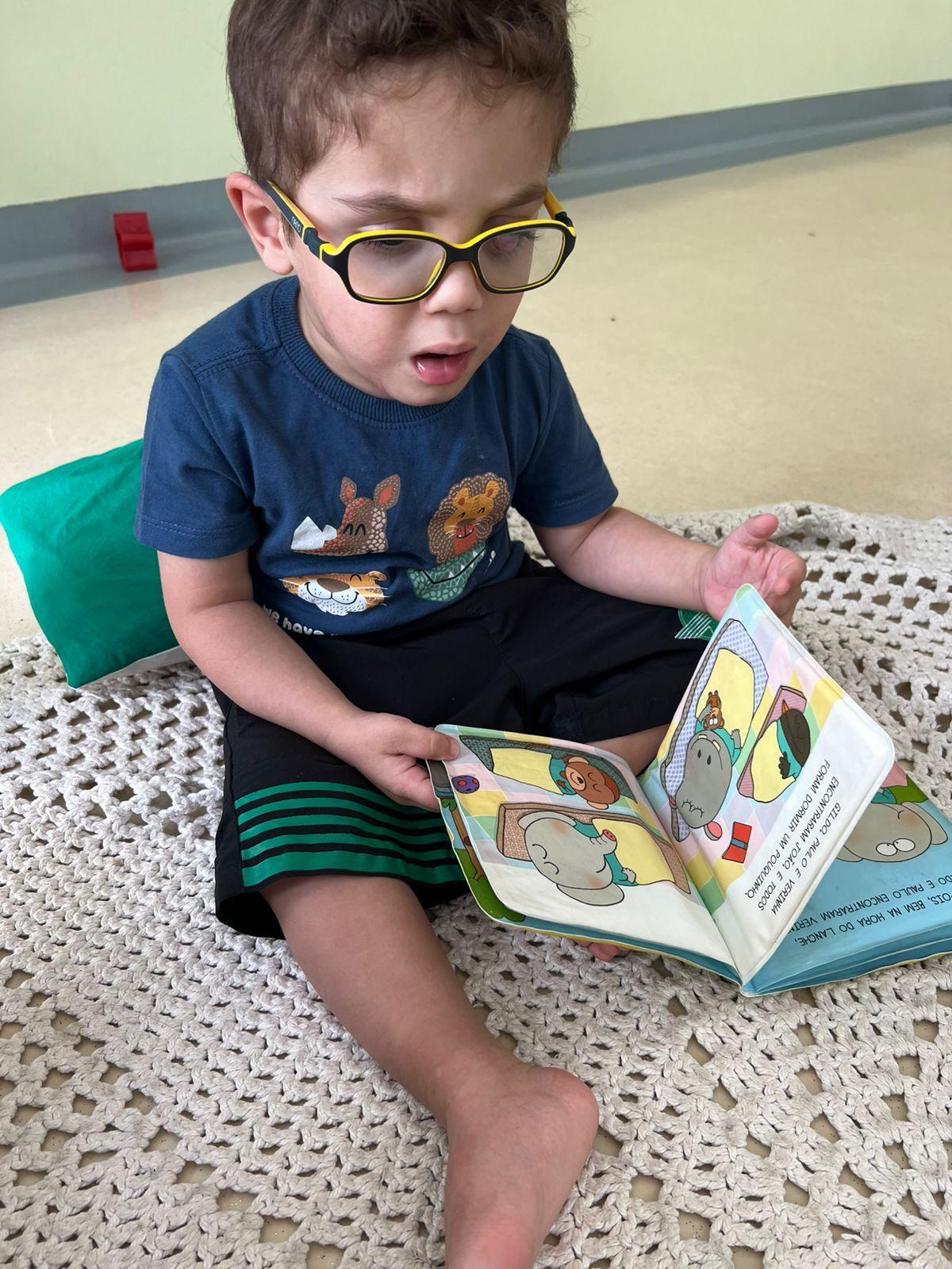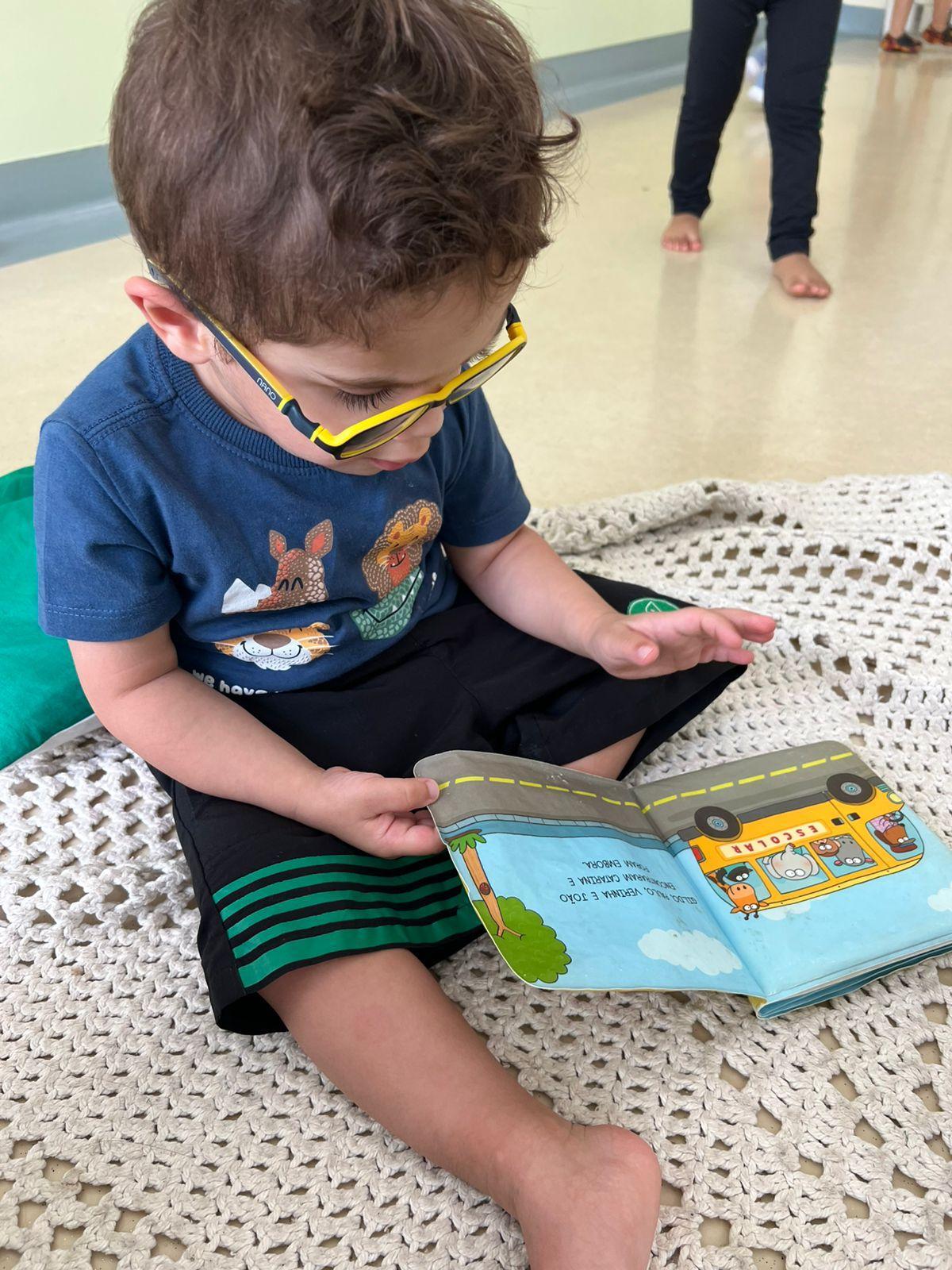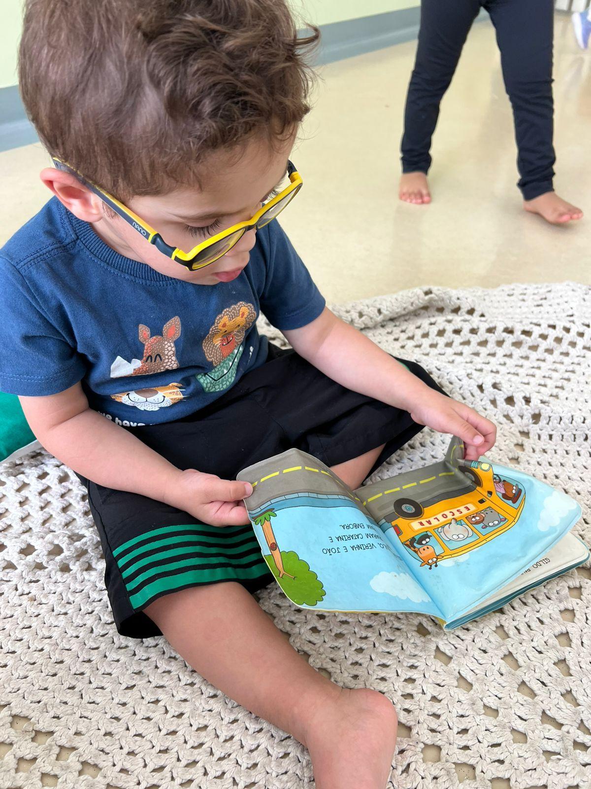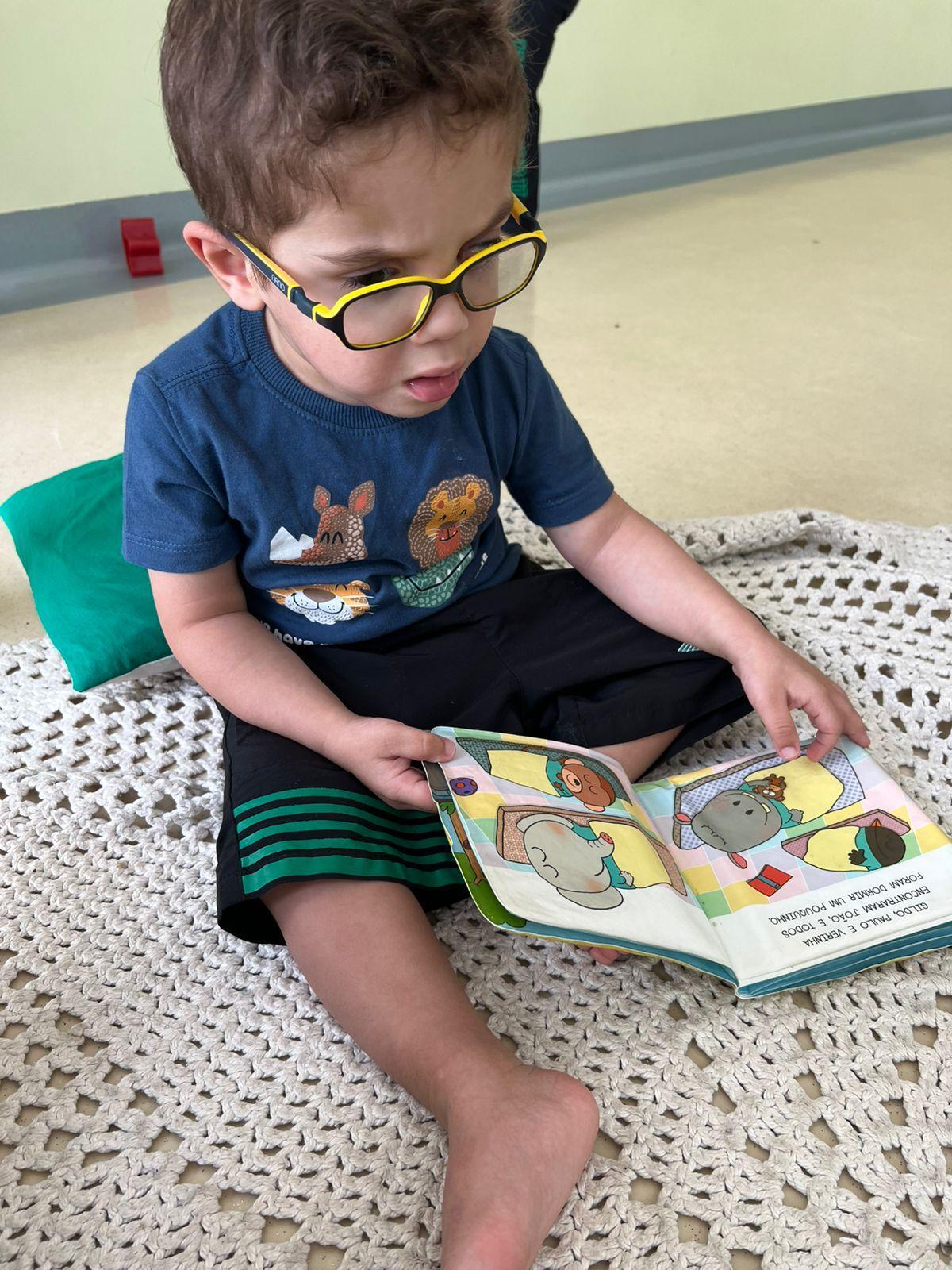Ao folhear as páginas do livro do Gildo, Ethan explora cada imagem com curiosidade, observa, comenta e aponta, descobrindo pequenas surpresas a cada virar de folha, encantando-se com as histórias que ganham vida diante de seus olhos.