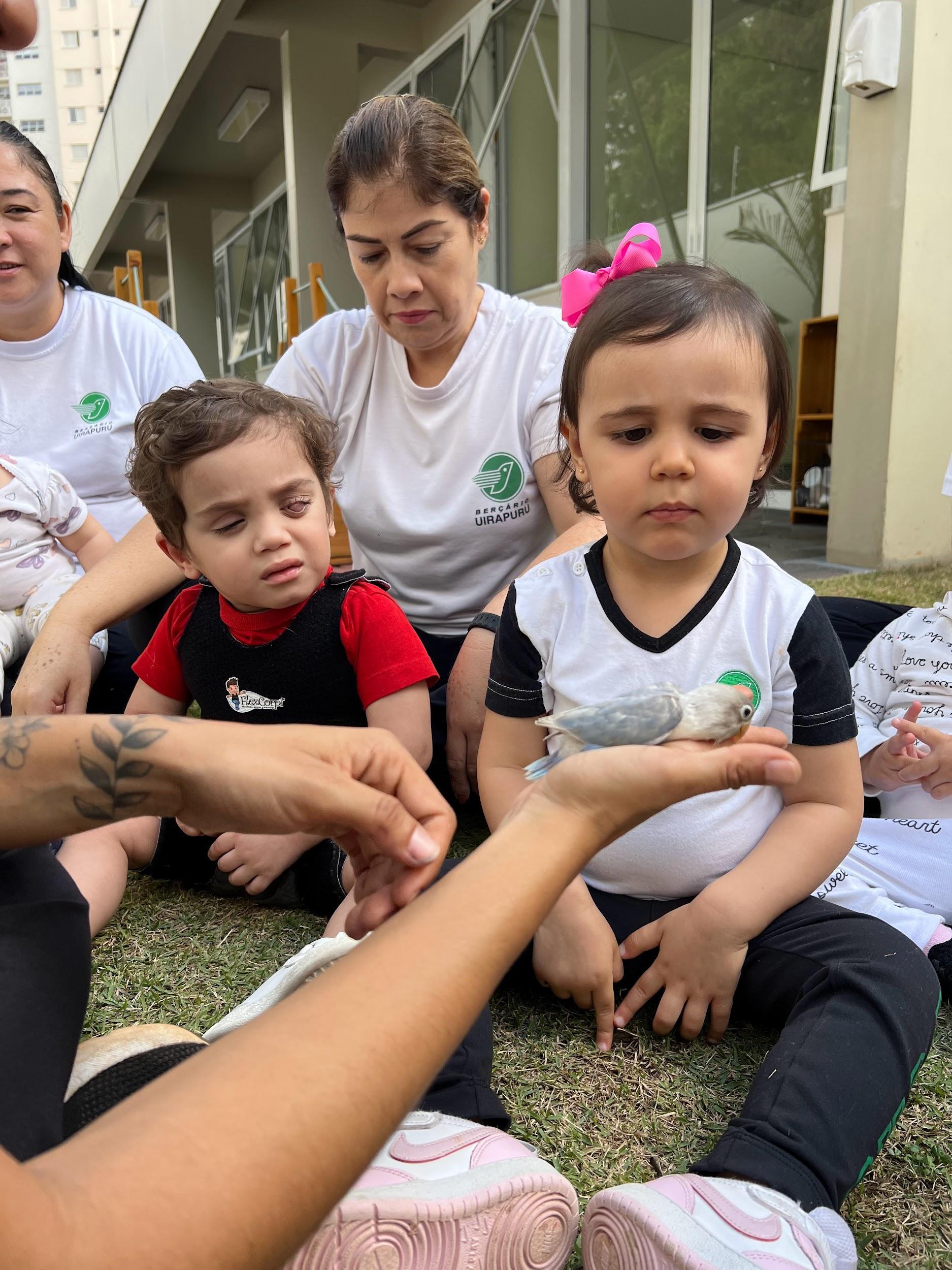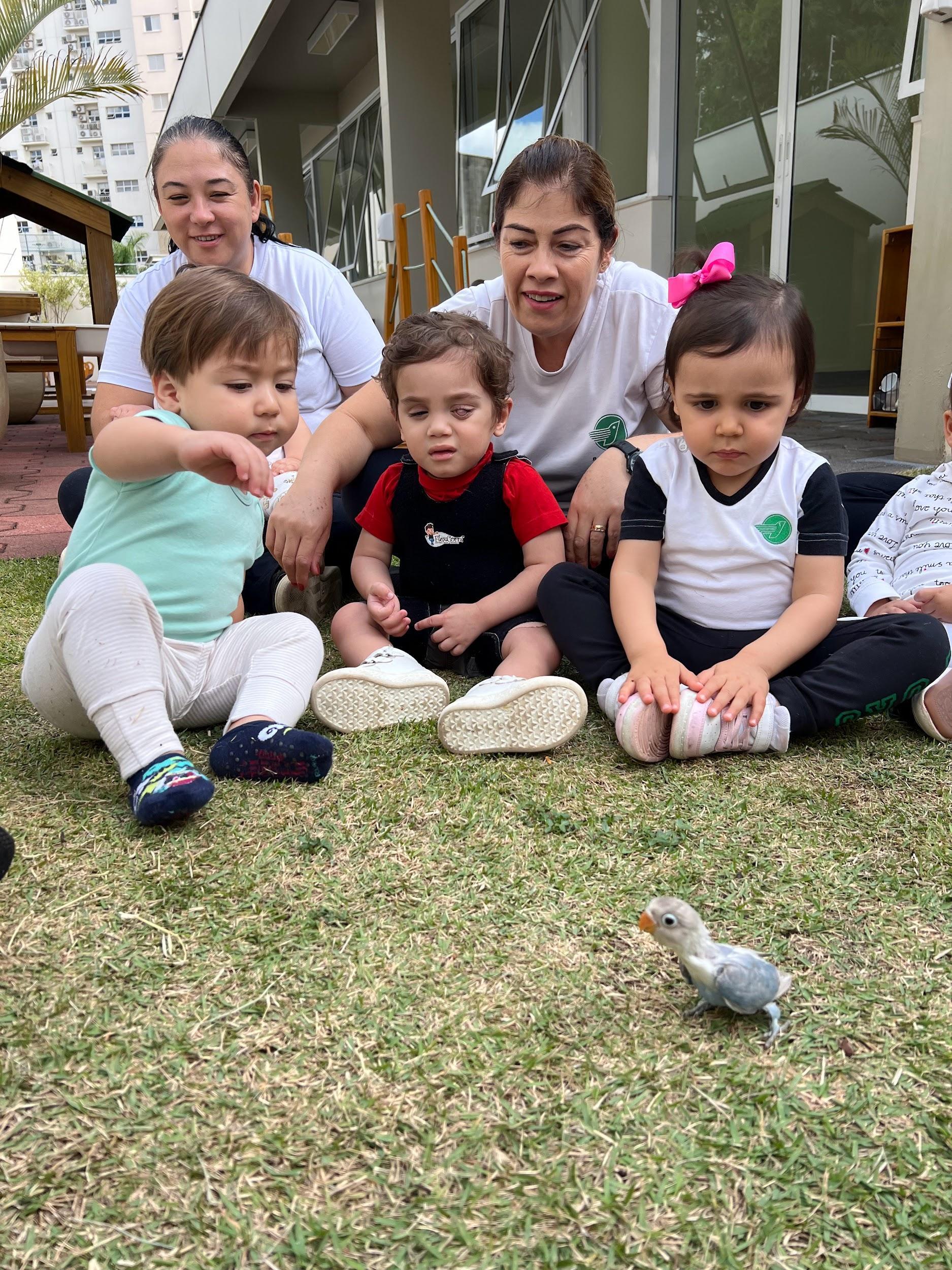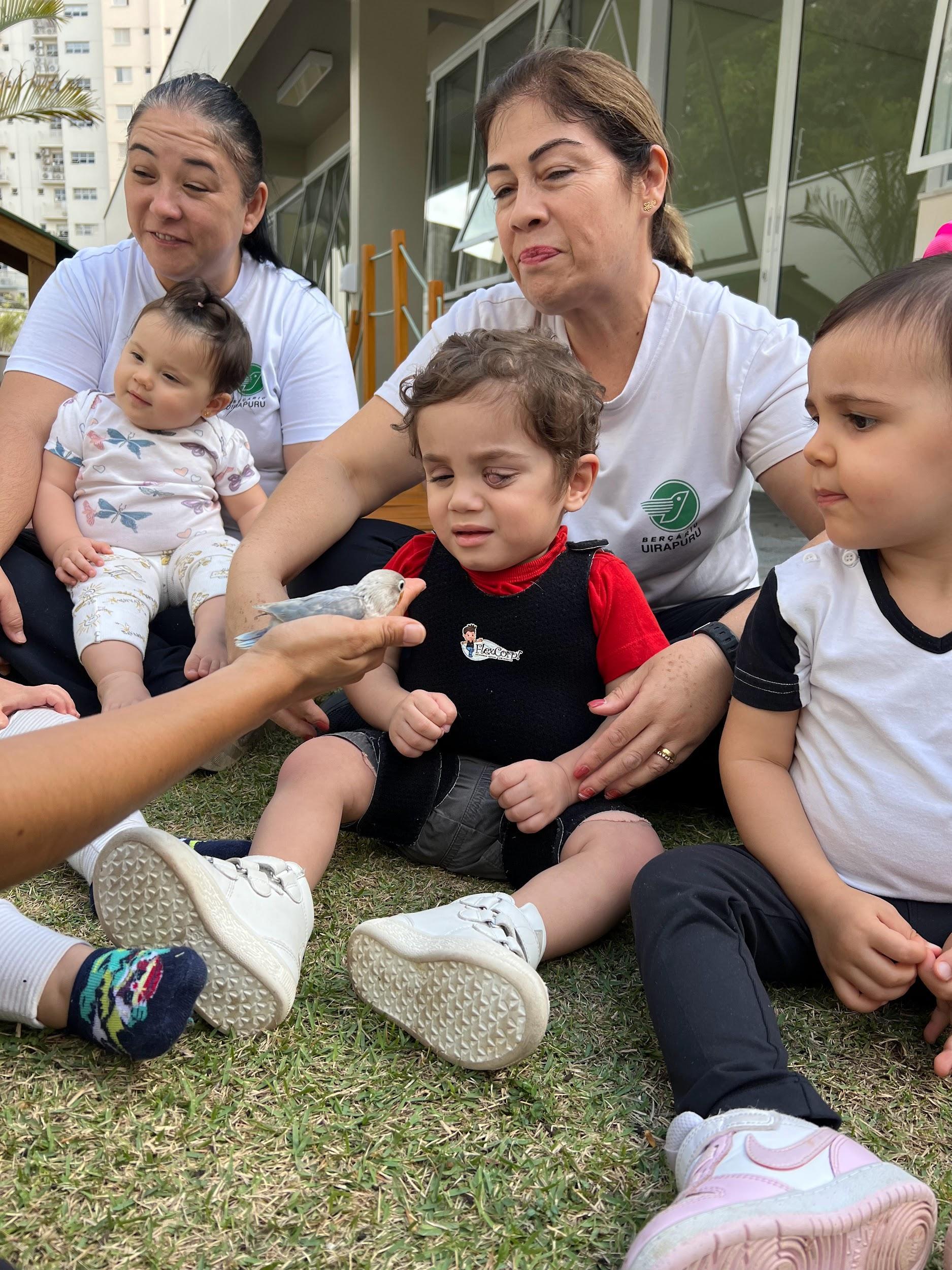 Sentado no gramado, cercado pelos amigos, Ethan observa atentamente a calopsita que repousa tranquila nas mãos do adulto.