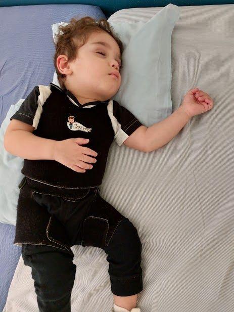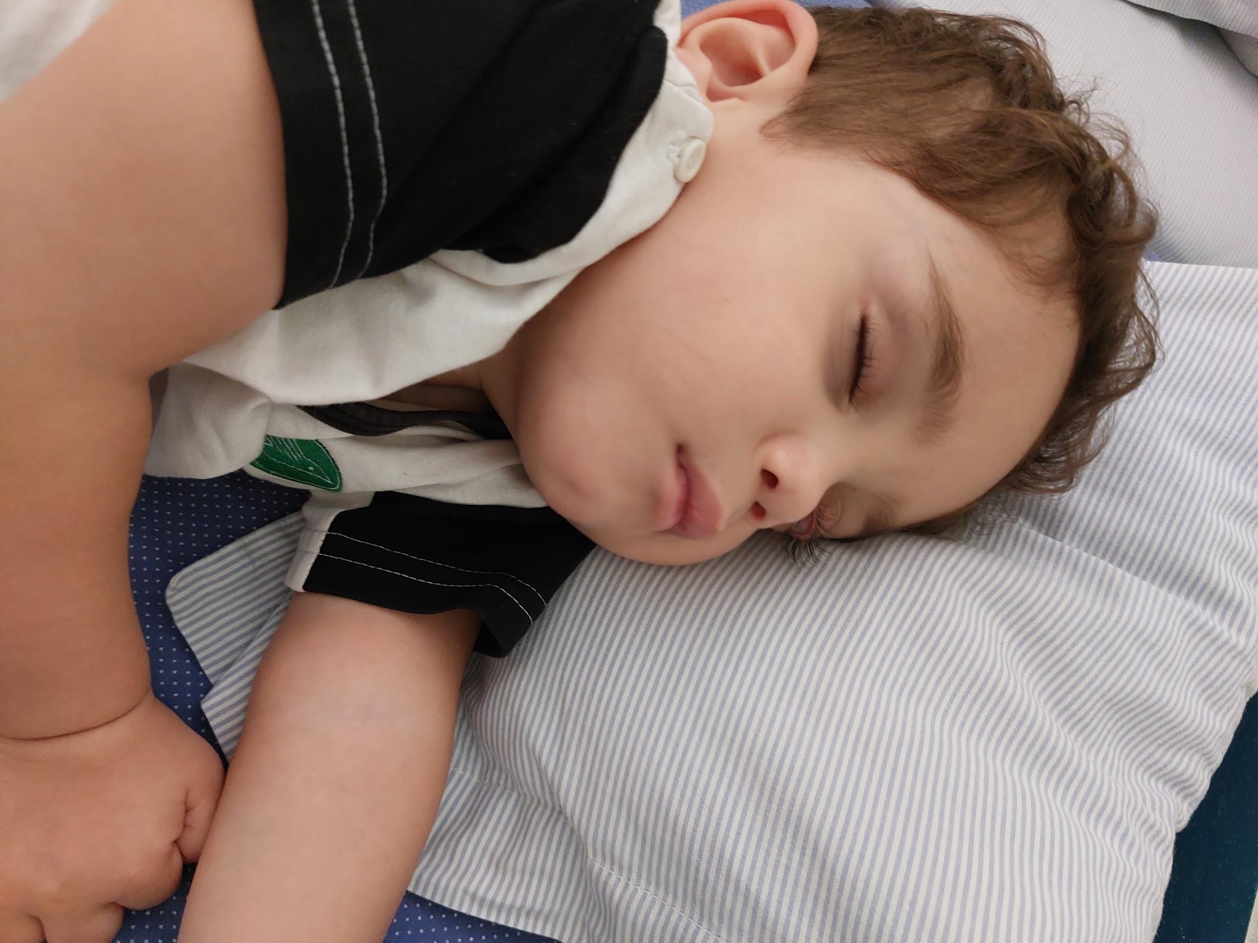 Ethan dorme tranquilamente, aconchegado em sua cama, sob o olhar atento e carinhoso de um adulto.