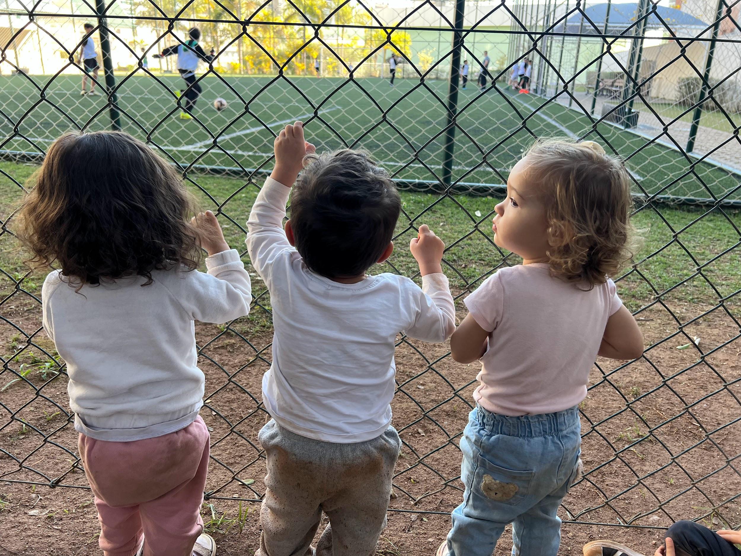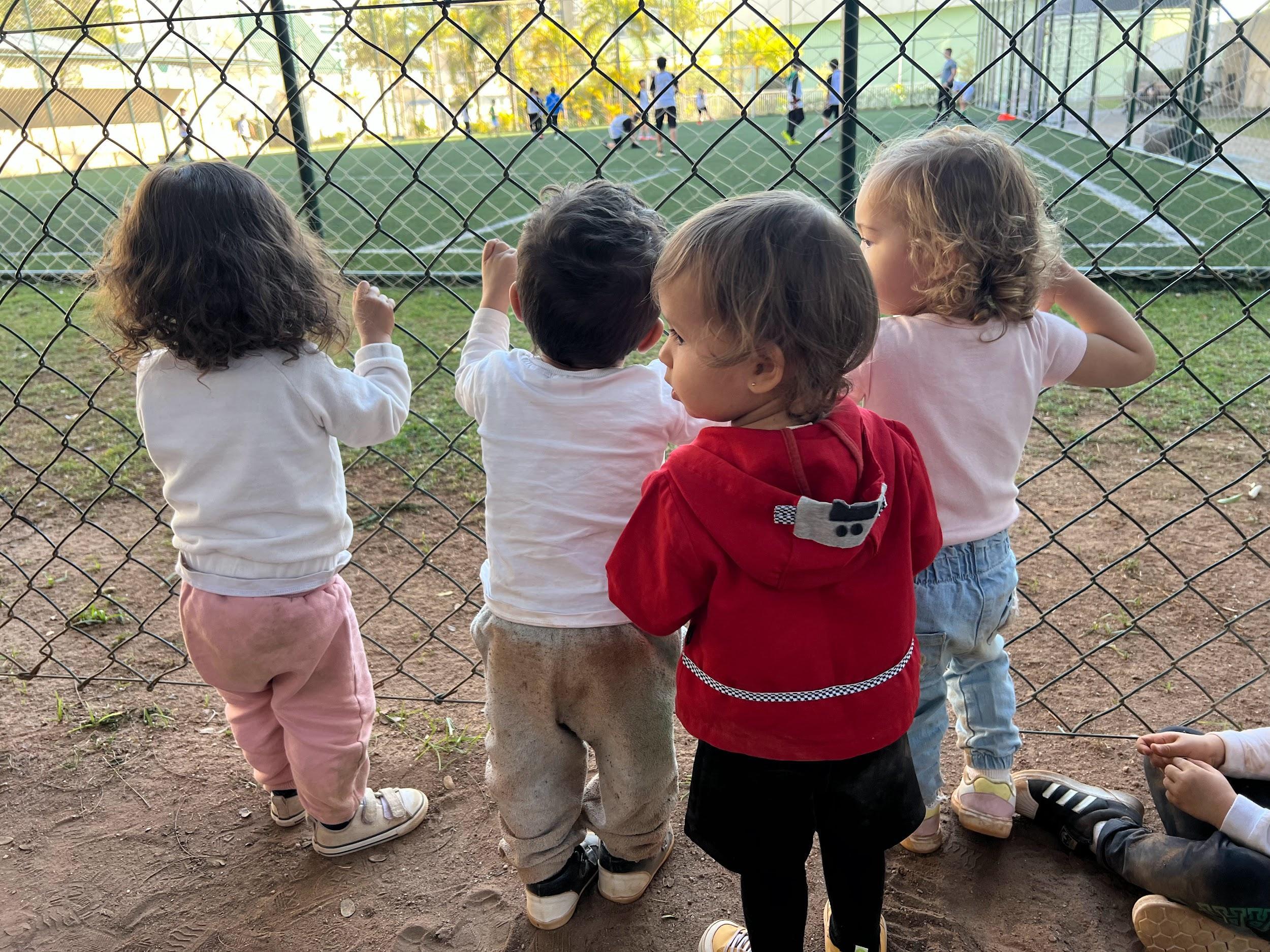 Com atenção e olhares curiosos, Ethan e seus amigos se aproximam do alambrado, encantados pelo movimento que se desenrola no campo de futebol ao lado do Espaço Eco.