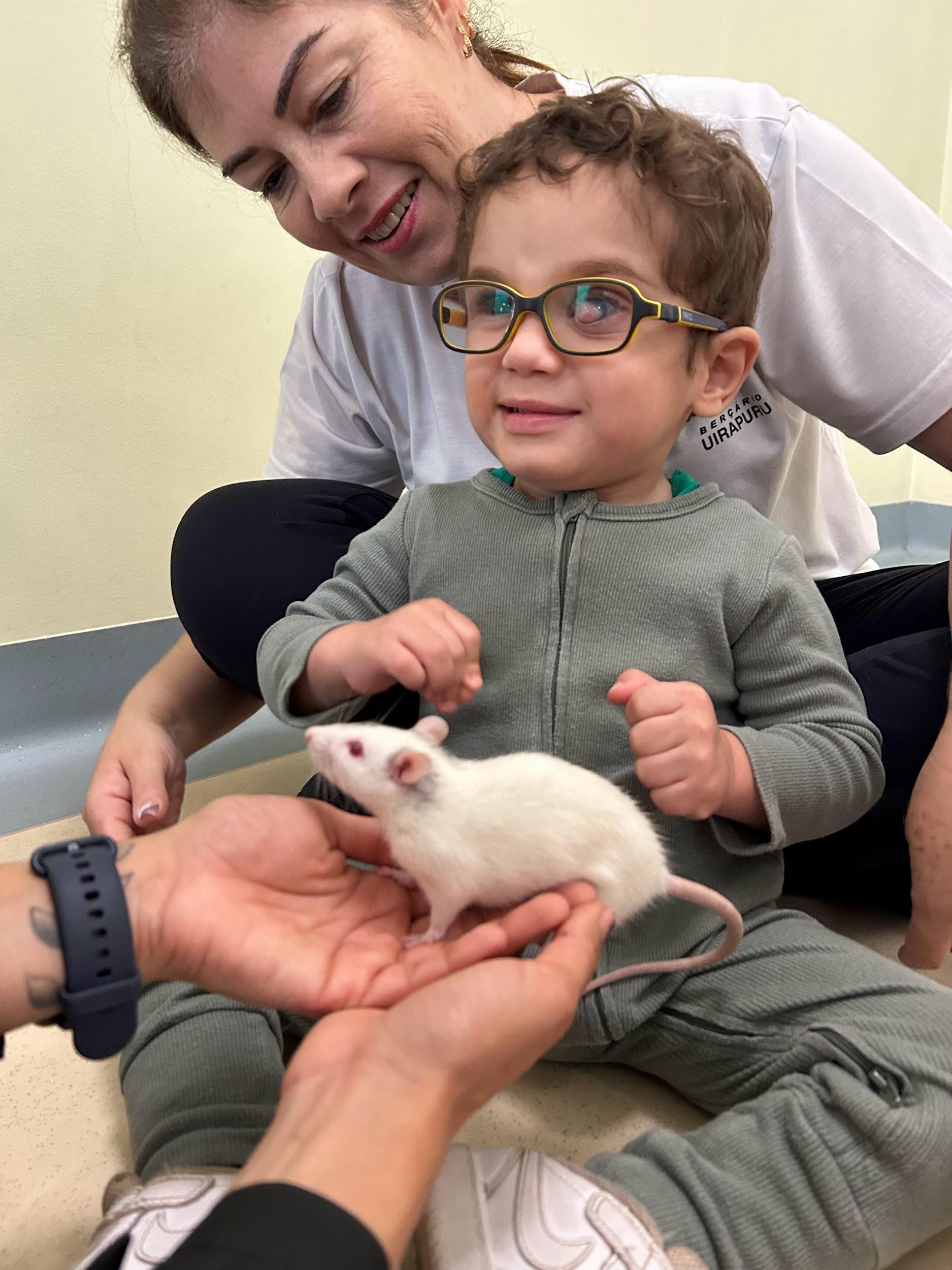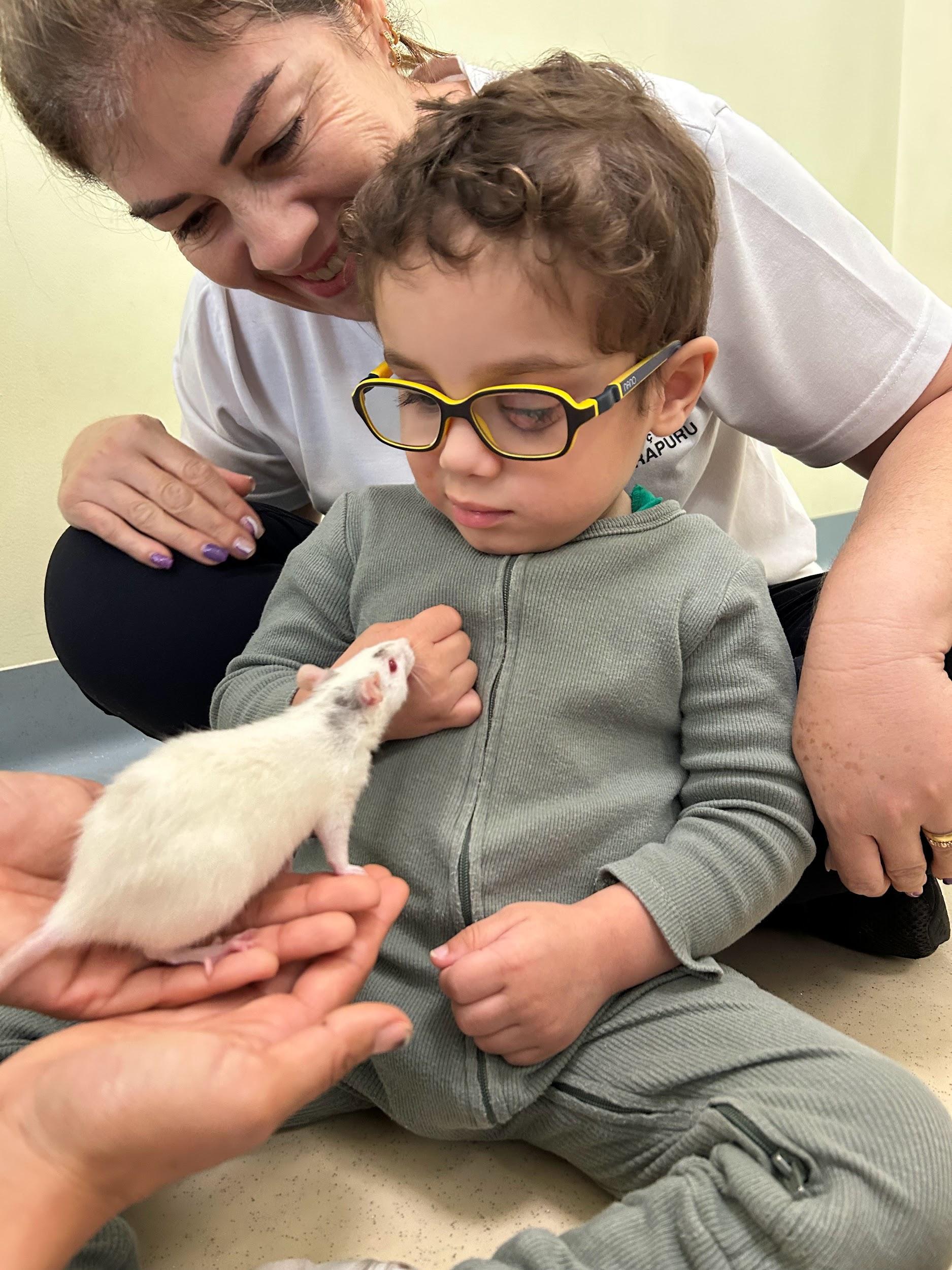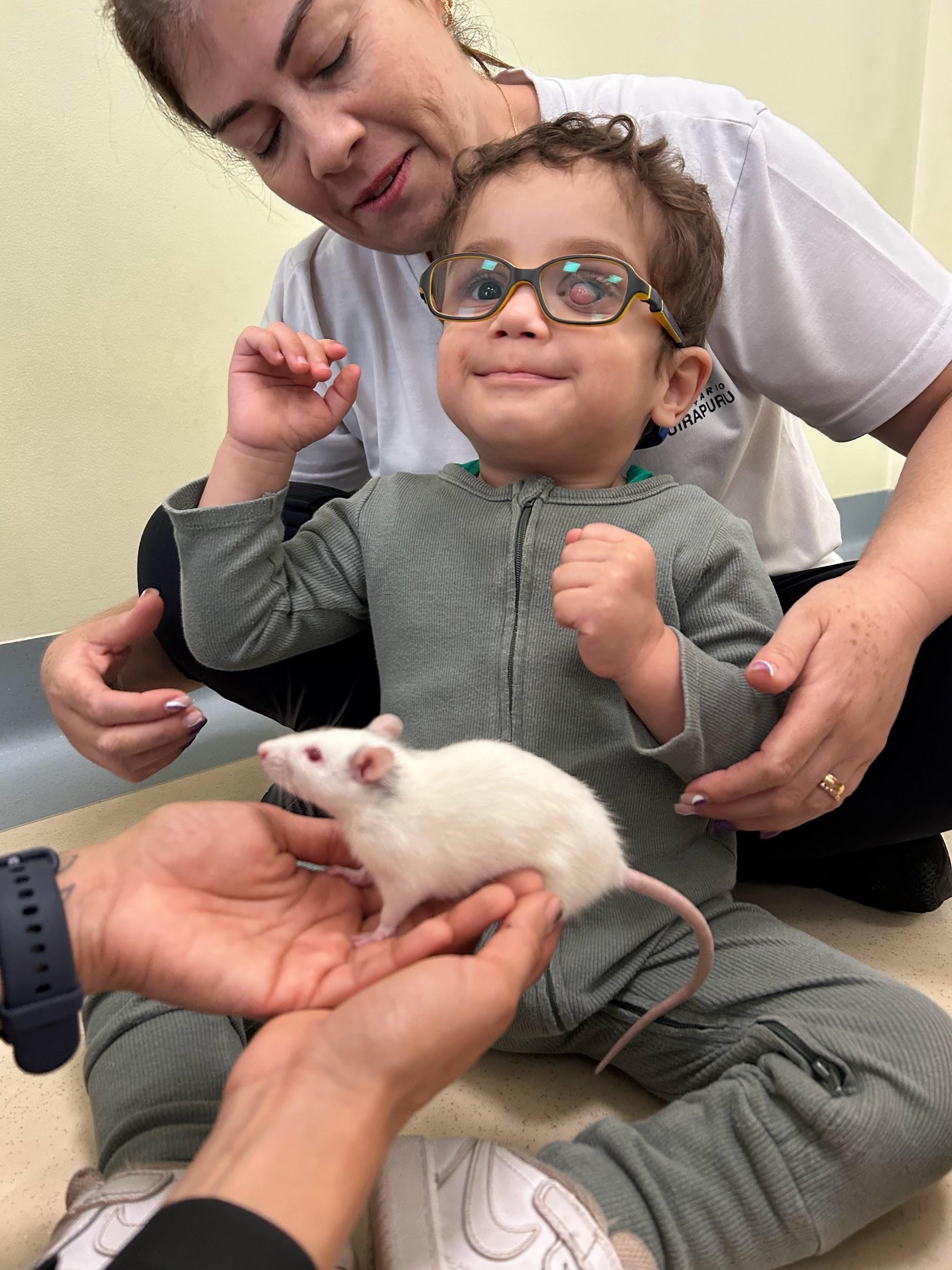 No colo do adulto que o acompanha, Ethan observa atentamente a ratinha repousando nas mãos.