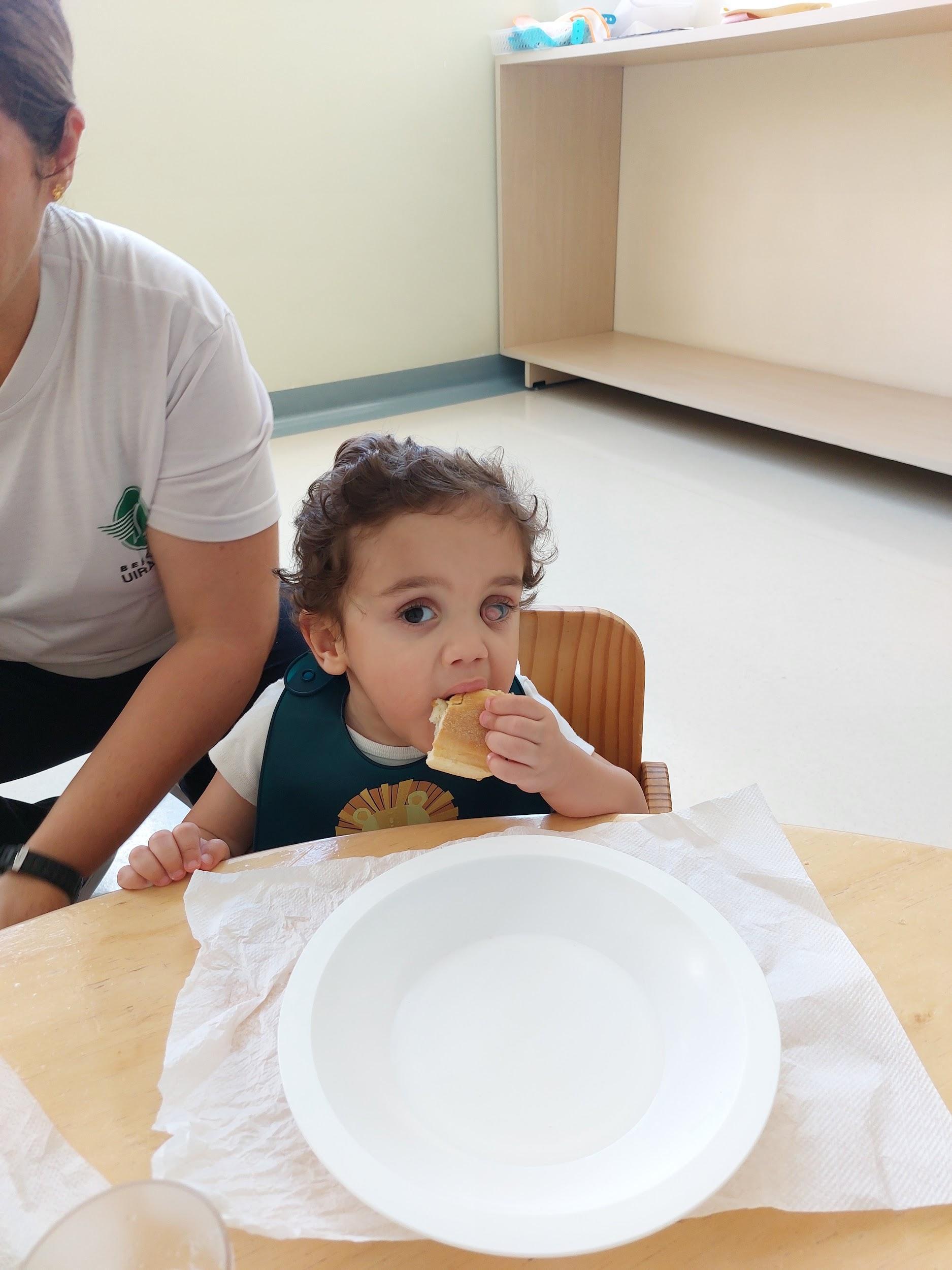 Ethan, aprecia os momentos de alimentação com alegria tranquila. No lanche, costuma pedir pão, seu preferido, e mesmo nos dias em que não