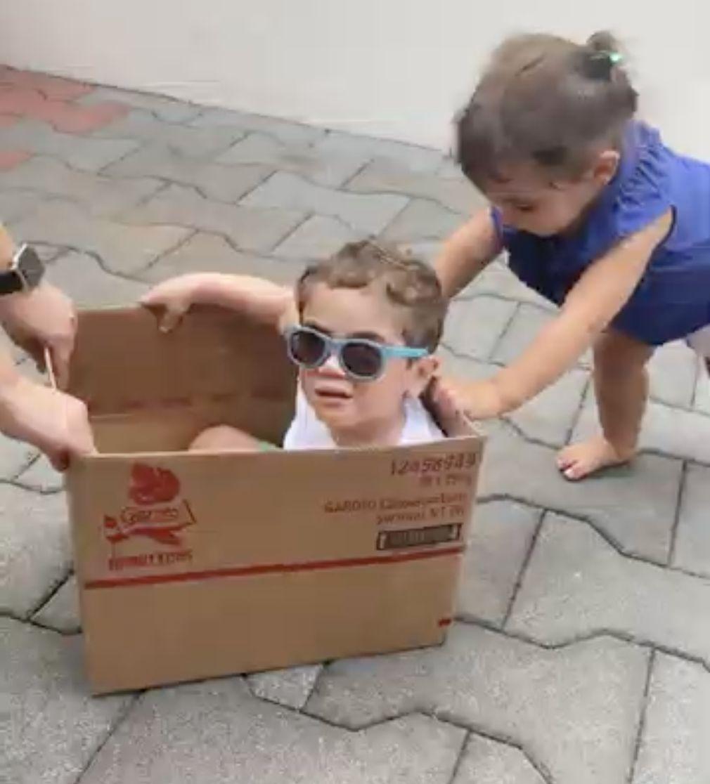 Ethan se diverte dentro de uma caixa de papelão que se transforma em um carro cheio de possibilidades.
