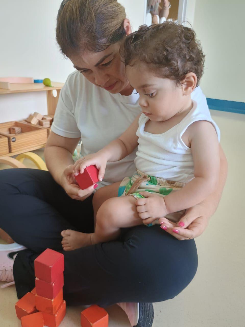 Envolto no colo da educadora, Ethan se sente seguro e encorajado. Essa proximidade dá-lhe confiança para enfrentar e conquistar pequenos desafios. Com determinação, ele toma a peça e a coloca sobre a pilha, conduzindo o próprio gesto.