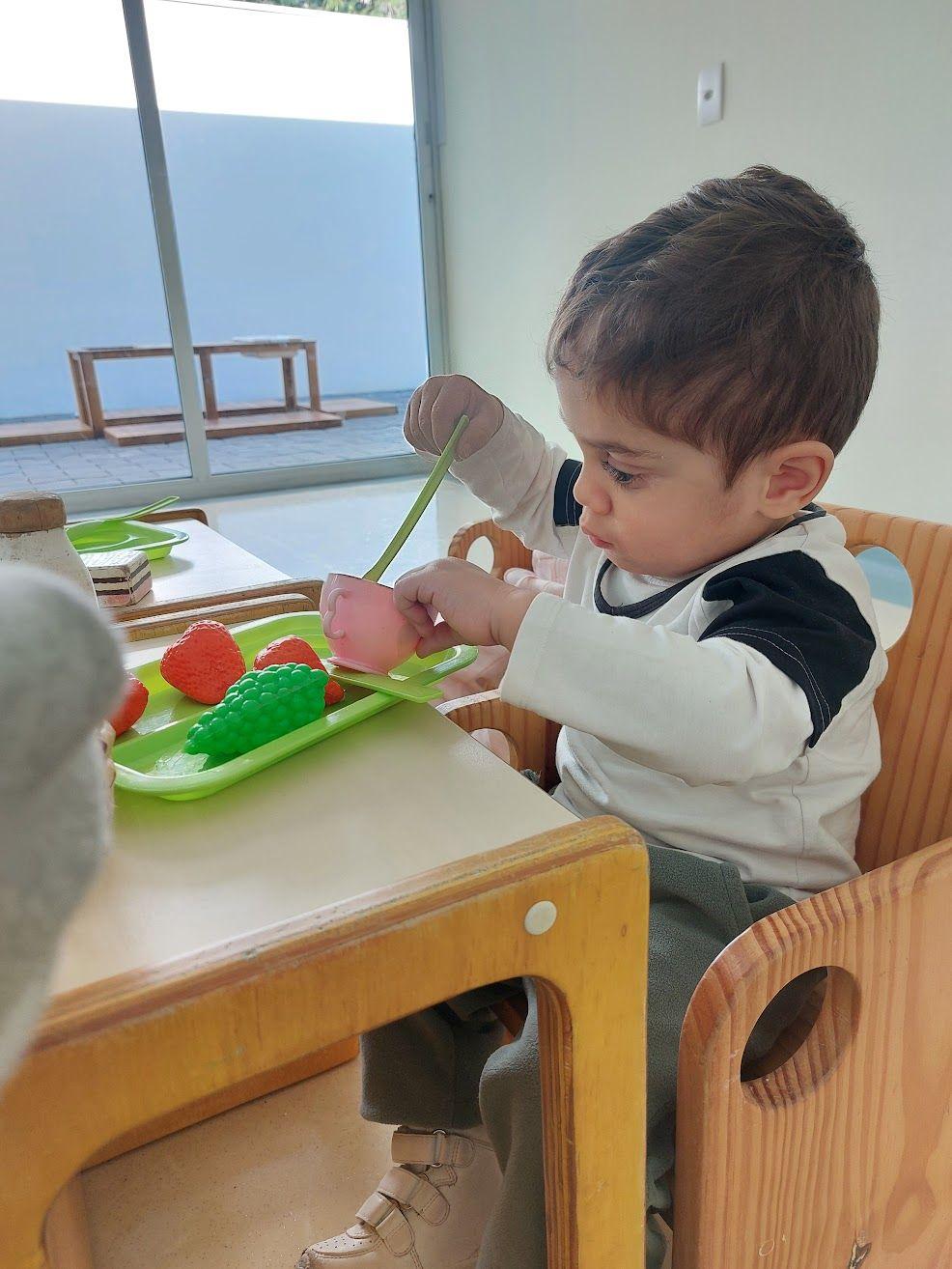 Com uma xícara e uma colher nas mãos, Ethan se diverte preparando seu chá imaginário. ele mistura os ingredientes com cuidado, imitando os gestos que observa nas crianças e nos adultos ao seu redor.