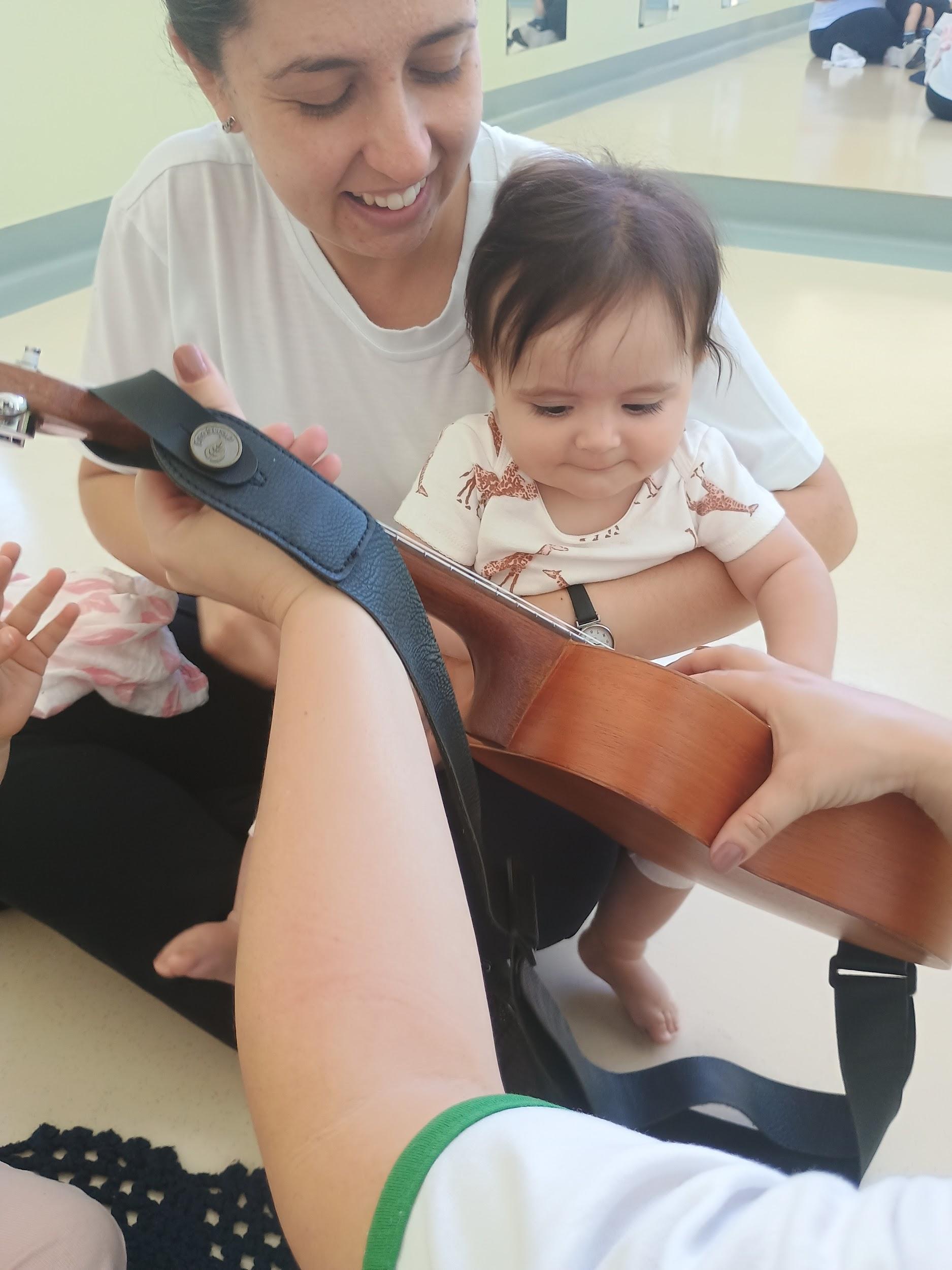 Entre sons, gestos e encantamento, Pérola mergulha na musicalização com olhos atentos e sorriso radiante. Ela segura com força o pandeiro Oceano, sentindo suas vibrações percorrerem suas mãozinhas. O chocalho dança em seus dedos e cada toque do instrumento é descoberto com curiosidade e alegria.
