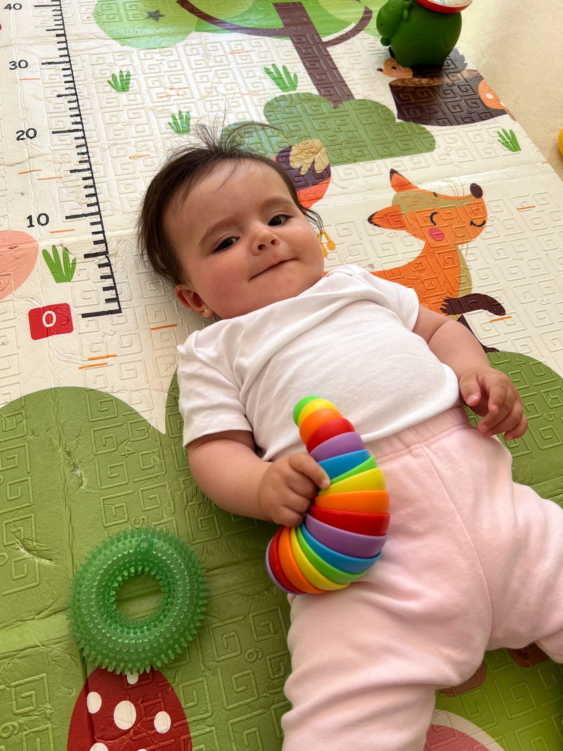 Deitada, Pérola sorri para o olhar que a acolhe. no encontro com o adulto, nasce a confiança, e o berçário se torna um lugar de afeto e descobertas
