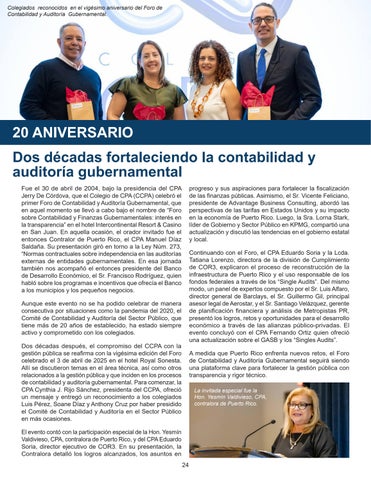 Jerry De Córdova, que el Colegio de CPA (CCPA) celebró el primer Foro de Contabilidad y Auditoría Gubernamental, que en aquel momento se llevó a cabo bajo el nombre de “Foro sobre Contabilidad y Finanzas Gubernamentales: interés en la transparencia” en el hotel Intercontinental Resort & Casino en San Juan. En aquella ocasión, el orador invitado fue el entonces Contralor de Puerto Rico, el CPA Manuel Díaz Saldaña. Su presentación giró en torno a la Ley Núm. 273, “Normas contractuales sobre independencia en las auditorías externas de entidades gubernamentales. En esa jornada también nos acompañó el entonces presidente del Banco de Desarrollo Económico, el Sr. Francisco Rodríguez, quien habló sobre los programas e incentivos que ofrecía el Banco a los municipios y los pequeños negocios.
