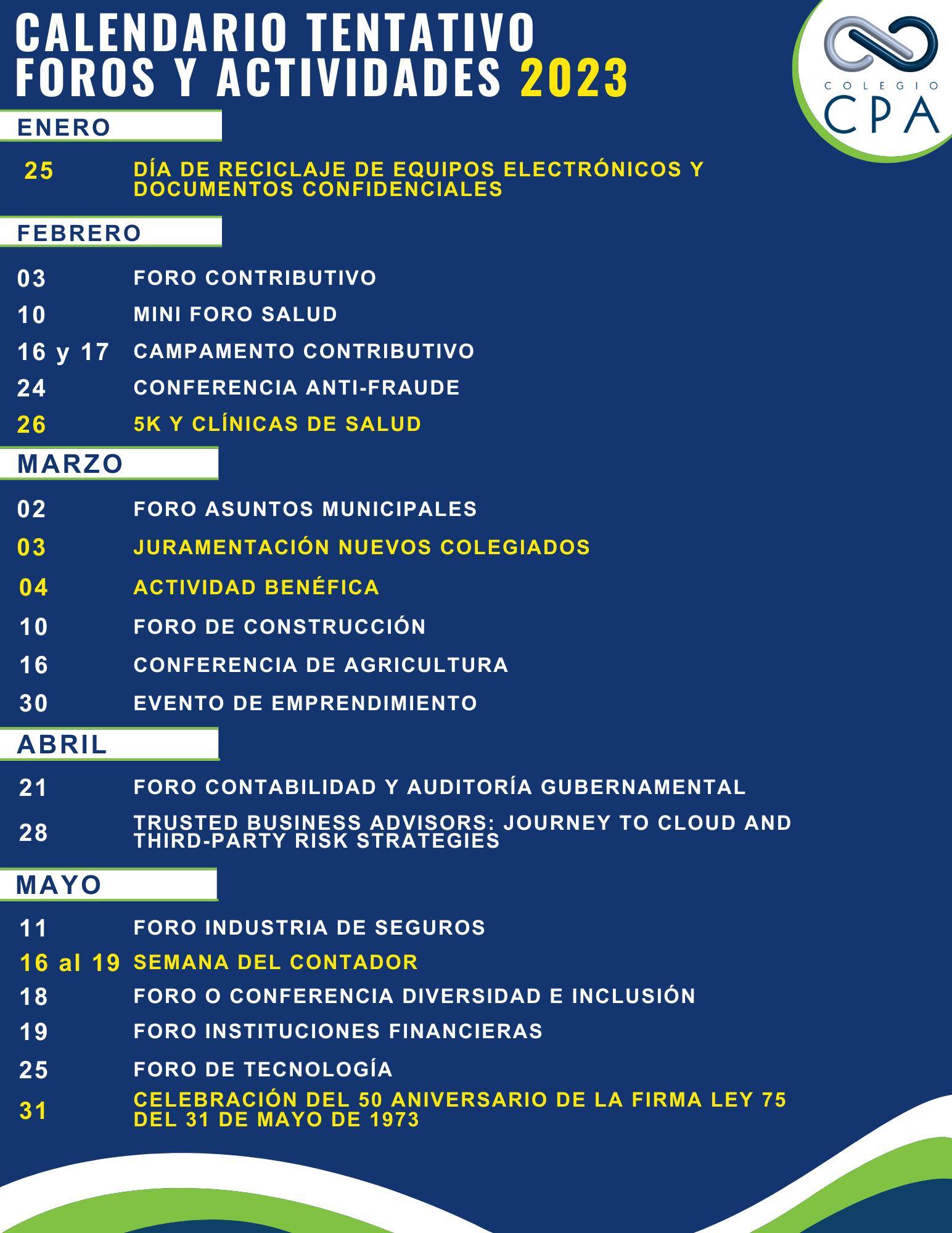 Como les dije al principio, tenemos un calendario lleno de actividades para el 2023. En cuanto a eventos educativos, el 3 de febrero tendremos el XXXIV Foro Contributivo en el Centro de Convenciones, desde ahora pueden registrarse a través de nuestra página web, www.colegiocpa.com. El 16 y 17 de febrero celebraremos el Campamento Contributivo en el Mayagüez Resort & Casino; el 24 de febrero realizaremos la Conferencia de Antifraude; y el 2 de marzo tendremos el Foro de Asuntos Municipales. Atentos a nuestras comunicaciones para más detalles sobre estos eventos.