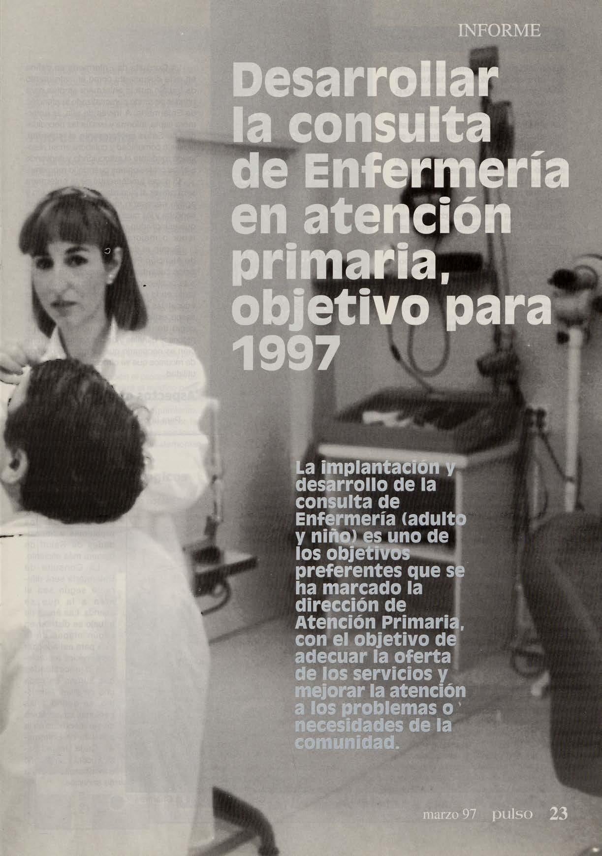 En un principio, la Consulta de Enfermería en Atención Primaria se centró prioritariamente en los enfermos crónicos y en la atención al niño sano. Cubierta esta primera fase de prestación a los enfermos crónicos, las enfermeras de Atención Primaria, en particular, y los propios Equipos de Salud, en general, han visto la necesidad de marcar objetivos de cambio en relación a la oferta de servicios de la Consulta de Enfermería.