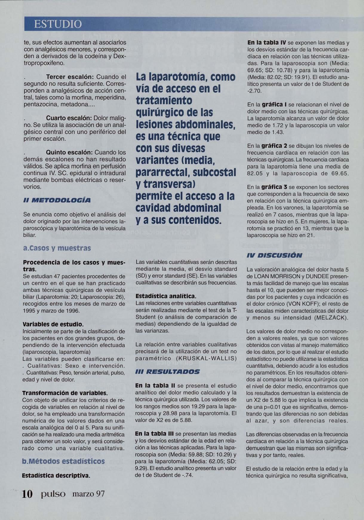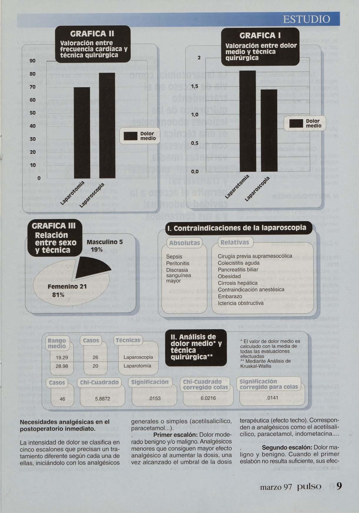 Se realiza un estudiO comparativo del dolor entre la colec1s tectom1a por v1a laparotomsca y por v1a laparoscóp1ca. Par poder comparar homogeneamente el mvel de doJor se h realizado una transformacion hasta establecer un solo valor en una escala analogaca del O al 5. (Calculo medio de toda las valoraciones por pacaente). Los resultados muestran que se encuentran diferencias signi· flcativas en el nivel de dolor entre ambas tecnicas qu1rurg1cas así como de la frecuencia cardíaca con las,mtsmas. La com paración entre la edad y las tecnicas quirúrgicas no muestra diferencias, pudiendo ser originadas éstas por el azar