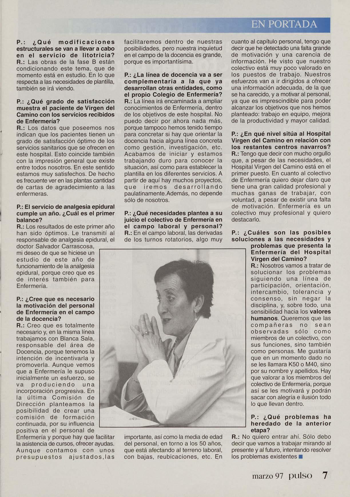 R.: Tengo que decir con mucho orgullo que , a pesar de las n ecesidades, el Hospital Virgen del Camino está en el primer puesto. En cuanto al colectivo de Enfermería quiero dejar claro que tiene una gran calidad profesional y muchas ganas de trabajar , con voluntad, a pesar de existir una falta de mot i vac i ón. Enfe rmería es un colect i vo muy pro fesiona l y quiero destacarl o.