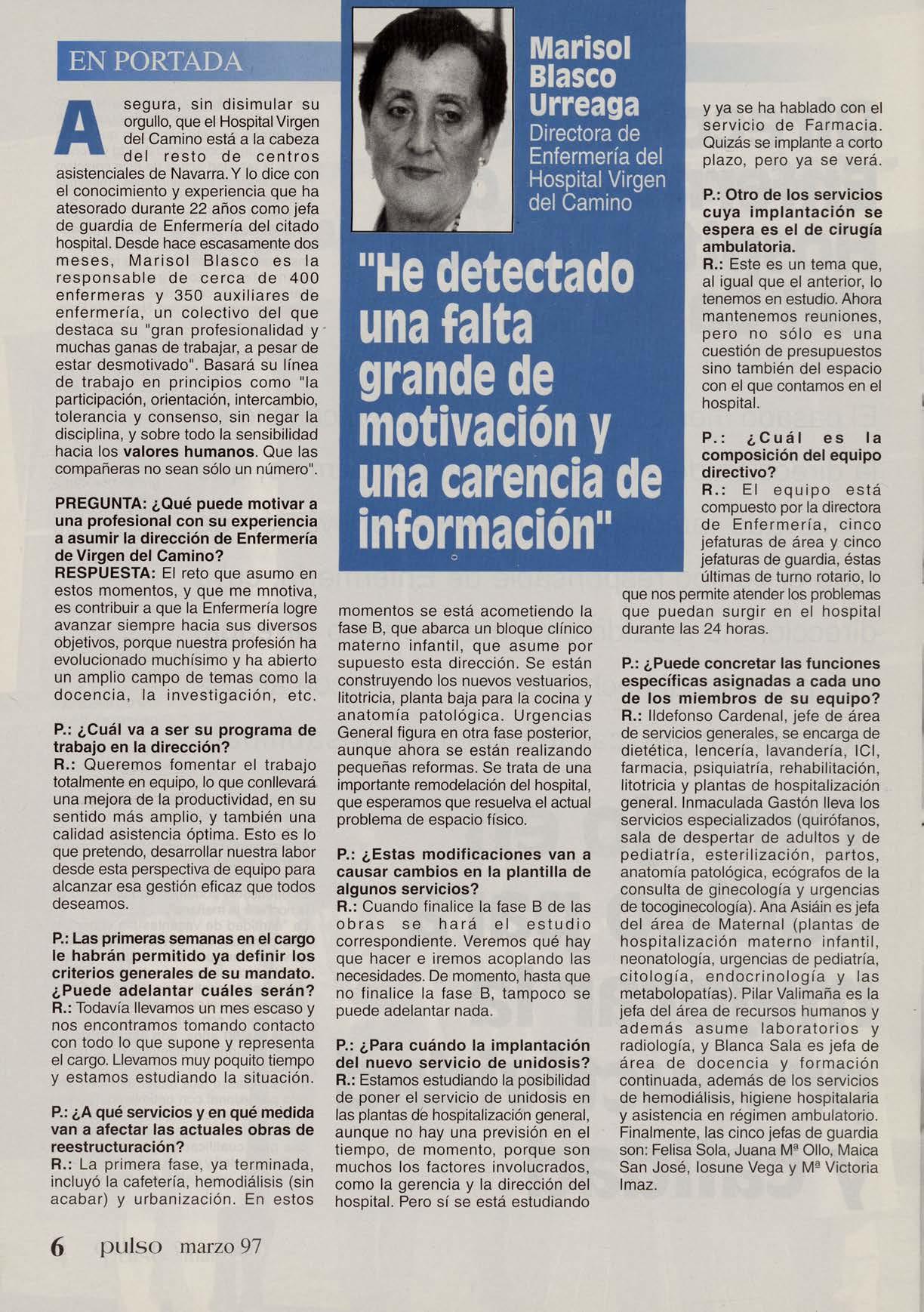 Asegura, sin disimular su orgullo, que el Hospital Virg en del Camino está a la cabeza del resto de centros asistenciales de Navarra. Y lo dice con el conocimiento y experiencia que ha atesorado durante 22 años como jefa de guardia de Enfermería del citado hospital. Desde hace escasamente dos meses, Mari so l Blasco es l a responsab l e de ce rca de 400 enfermeras y 350 auxiliares de enfermería, un colectivo del que destaca su "gran profesionalidad y muchas ganas de trabajar. a pesar de estar desmotivado". Basará su línea de trabajo en principios como "la participación, orientación, intercambio, tolerancia y consenso, sin negar la disciplina, y sobre todo la sensibilidad hacia los valores humanos Que las compañeras no sean sólo un número".