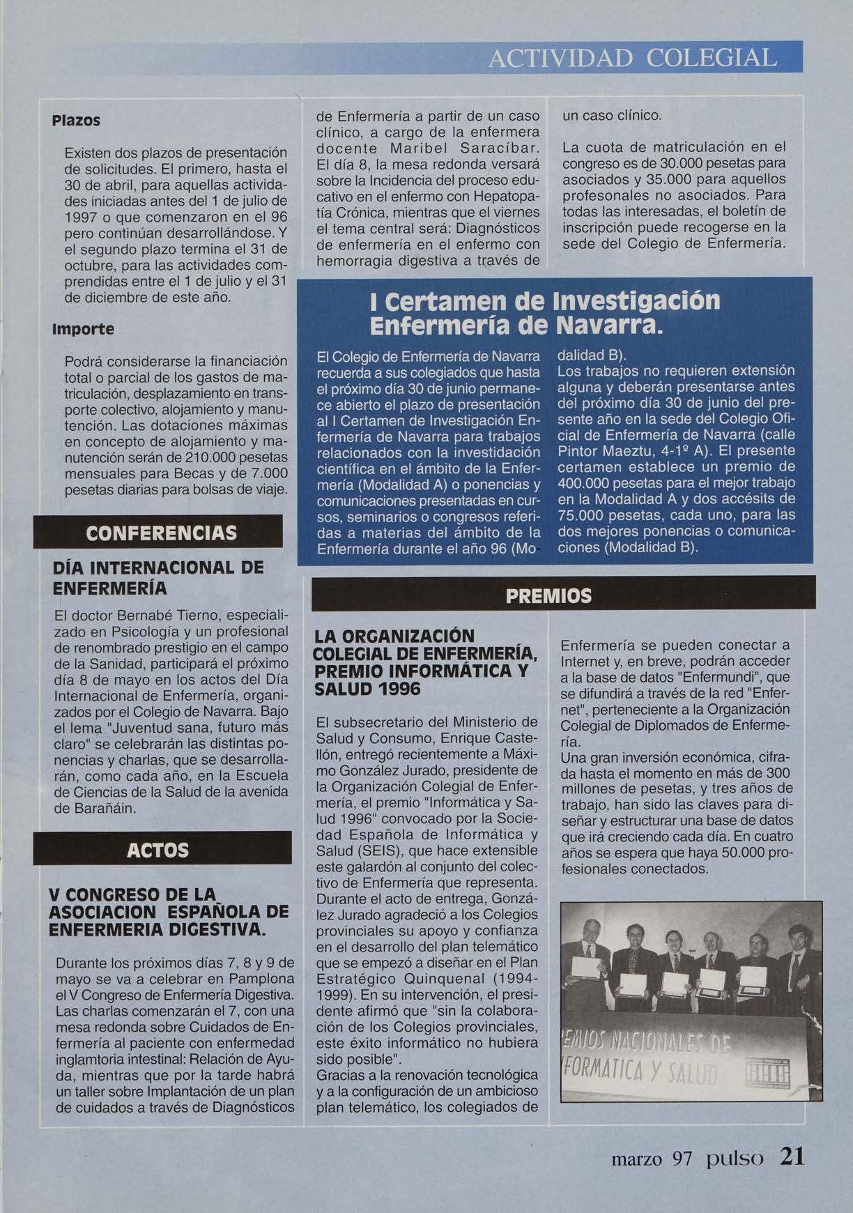 El Colegio de Enfermería de Navarra recuerda a sus colegiados que hasta el próximo día 30 de junio permanece abierto el plazo de presentación al 1 Certamen de Investigación Enfermería de Navarra para trabajos relacionados con la investidación científica en el ámbito de la Enfermería (Modalidad A) o ponencias y comunicaciones presentadas en cursos, seminarios o congresos referidas a materias del ámbito de la Enfermería durante el año 96 (Mo