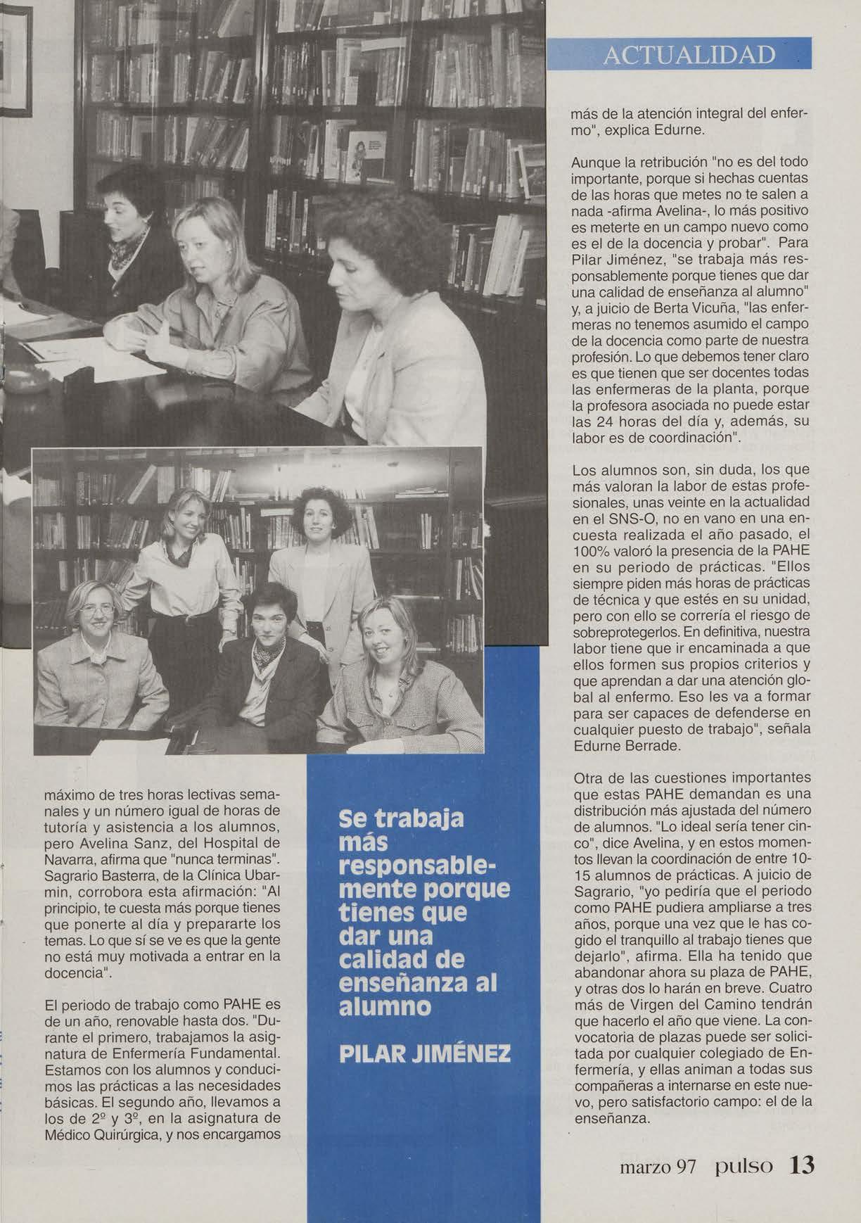 R.: Creo que es totalmente necesario y, en la misma línea trabajamos con Blanca Sala , responsable del área de Docencia , porque tenemos la intenc i ón de ince ntiva r la y promoverla. Aunq u e vemos que a Enfermería le supuso inicialmente un es f ue rzo , se va produciendo una incorporación progresiva En la última Comisión de Dirección planteamos la posibilidad de crear una comisión de formación continuada , por su influencia pos it iva en el pers on a l d e Enfermería y porque hay que fac il itar la asistencia de cursos, ofrecer ayudas. Aunque contamos con unos presupuestos ajustados , las