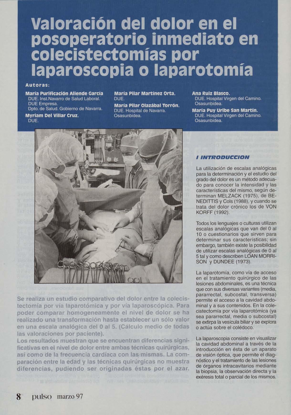 Valoración del dolor en el posoperat orio inmediato en colec iste c tomía s por laparoscopia o laparot omía S Pág