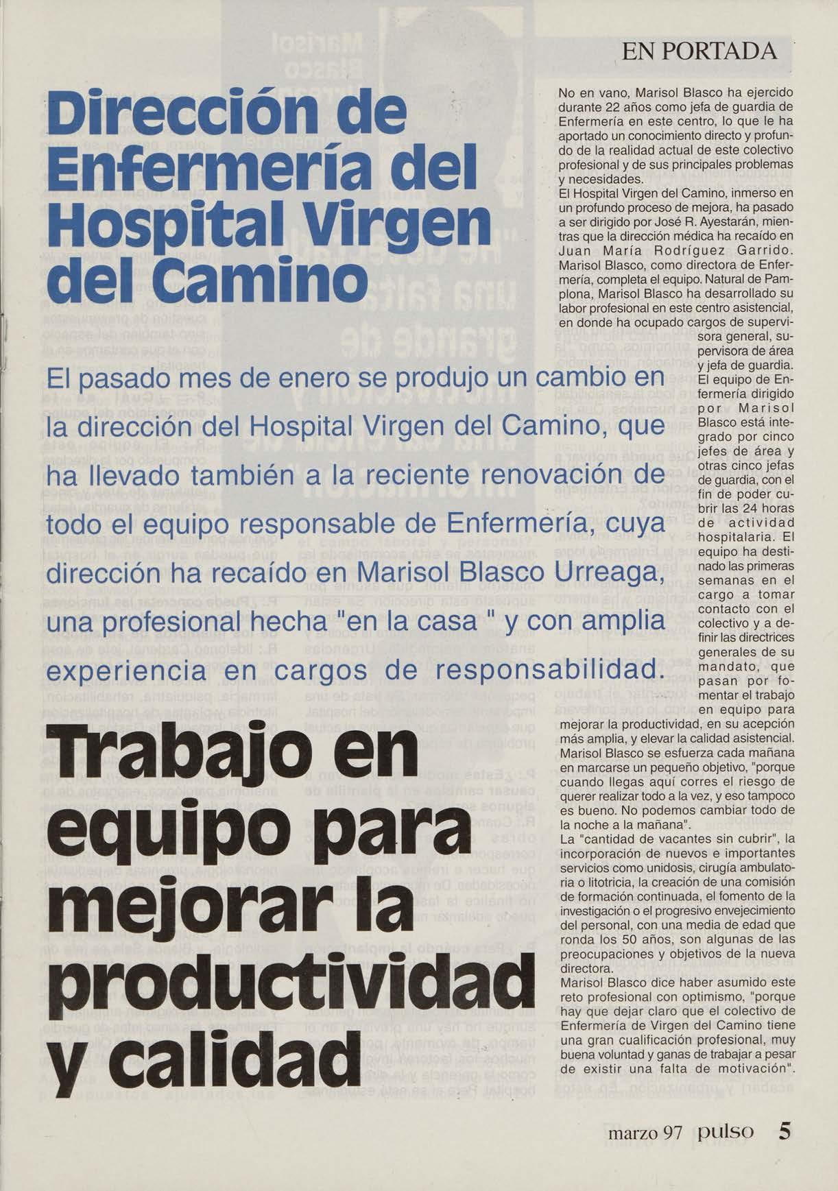 El Hospital Virgen del Camino, inmerso en un profundo proceso de mejora, ha pasado a ser dirigido por José R. Ayestarán, mientras que la dirección médica ha recaído en Juan Marra Rodríguez Garrido. Marisol Blasco, como directora de Enfermería, completa el equipo. Natural de Pamplona, Marisol Blasco ha desarrollado su labor profesional en este centro asistencial, en donde ha ocupado cargos de supervisora general, supervi sora de á rea