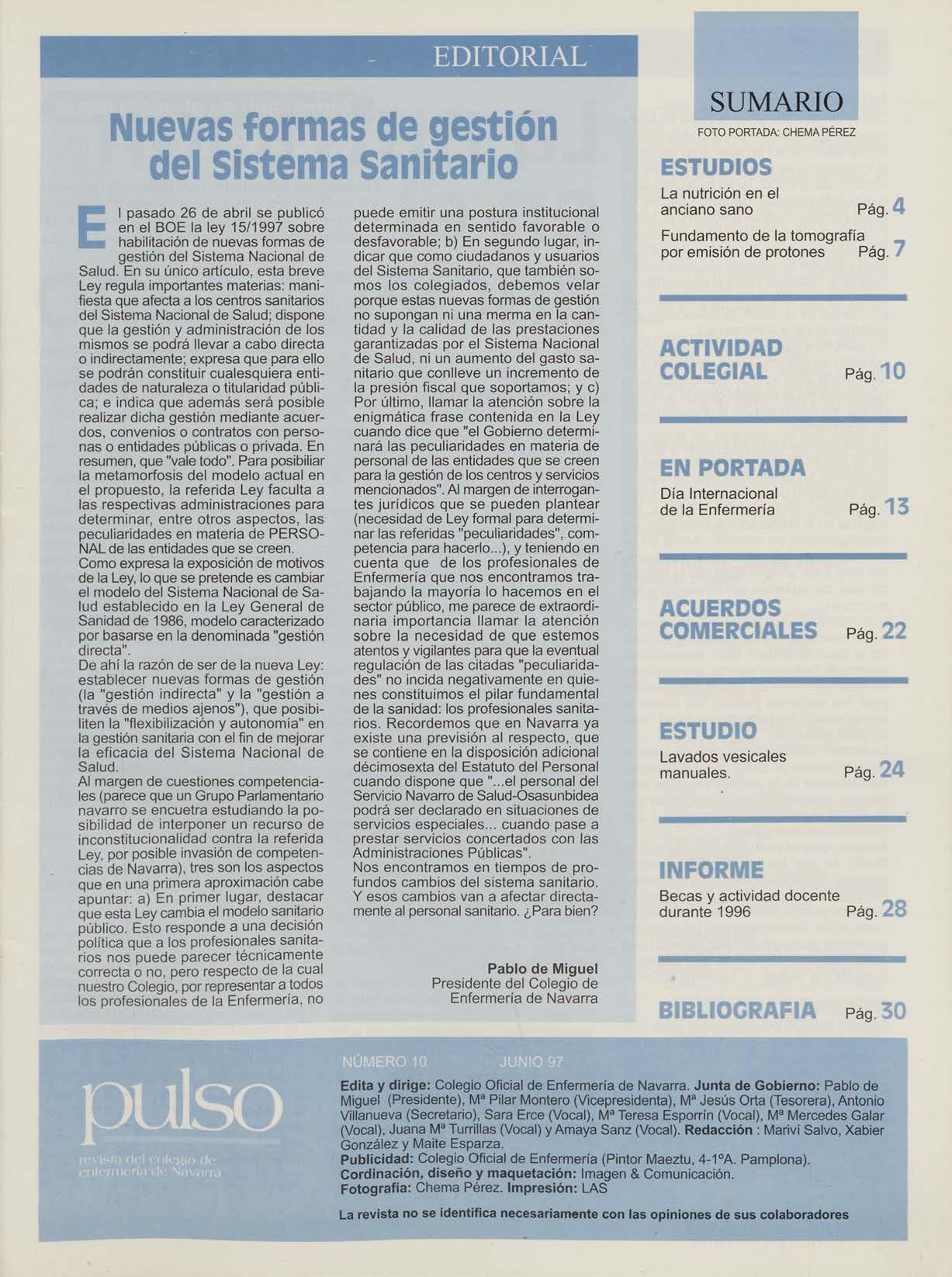 Edita y d iri ge: Colegio Oficial de Enfermería de Navarra. J unta de Go bi ern o: Pablo de Miguel (Presidente), M9 Pitar Montero (Vicepresidenta), M9 Jesús Orta (Tesorera), Antonio Villanueva (Secretario), Sara Erce (Vocal), Ma Teresa Esporrín (Vocal), M8 Mercedes Galar (Vocal), Juana M9 Turrillas (Vocal) y Amaya Sanz (Vocal). Red ac ci ó n : Mariví Salvo, Xabie r Gonzalez y Maite Esparza