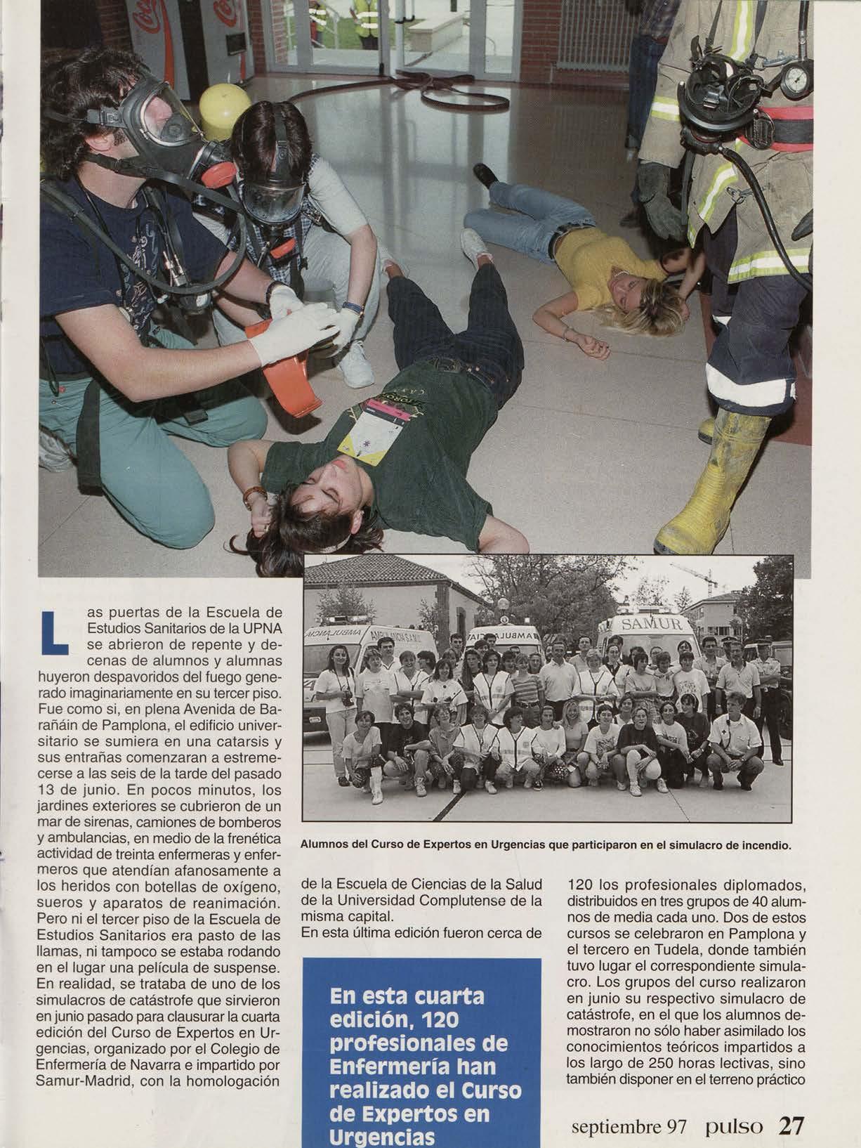 Las puertas de la Escuela de Estudios Sanitarios de la UPNA se abrieron de repente y decenas de alumnos y alumnas huyeron despavoridos del fuego generado imaginariamente en su tercer piso. Fue como si, en plena Avenida de Barañáin de Pamplona, el edificio universitario se sumiera en una catarsis y sus entrañas comenzaran a estremecerse a las seis de la tarde del pasado 13 de junio. En pocos minutos, los jardines exteriores se cubrieron de un mar de sirenas, camiones de bomberos y ambulancias, en medio de la frenética actividad de treinta enfermeras y enfermeros que atendían afanosamente a los heridos con botellas de oxígeno. sueros y aparatos de reanimación. Pero ni el tercer piso de la Escuela de Estudios Sanitarios era pasto de las llamas, ni tampoco se estaba rodando en el lugar una película de suspense. En realidad, se trataba de uno de los simulacros de catástrofe que sirvieron en junio pasado para clausurar la cuarta edición del Curso de Expertos en Urgencias, organizado por el Colegio de Enfermería de Navarra e impartido por Samur-Madrid, con la homologación