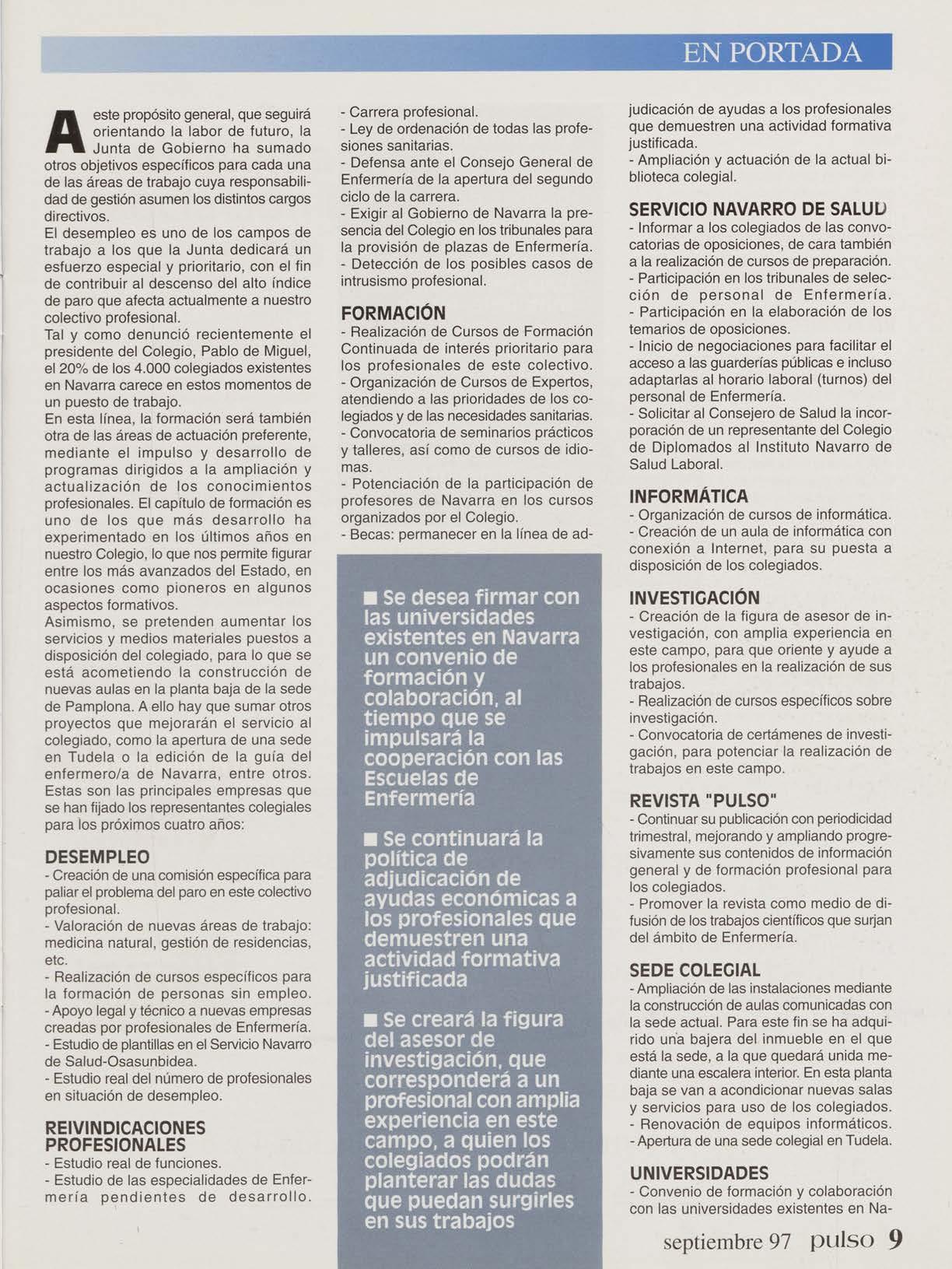 Después de un período de cuatro años de mandato, iniciado en agosto de 1993, la Junta de Gobierno ha celebrado un proceso electoral que culminó el 26 de septiembre con la renovación parcial de sus miembros, de conformidad con lo establecido en los estatutos de la Organización Colegial. Coincidiendo con este imperativo legal, la propia Junta ha considerado oportuno realizar un alto en el camino para hacer balance del arduo trabajo desarrollado durante este período, a lo largo del cual el Colegio de Diplomados de Enfermería de Navarra ha exoerimentado sustanciales avances.