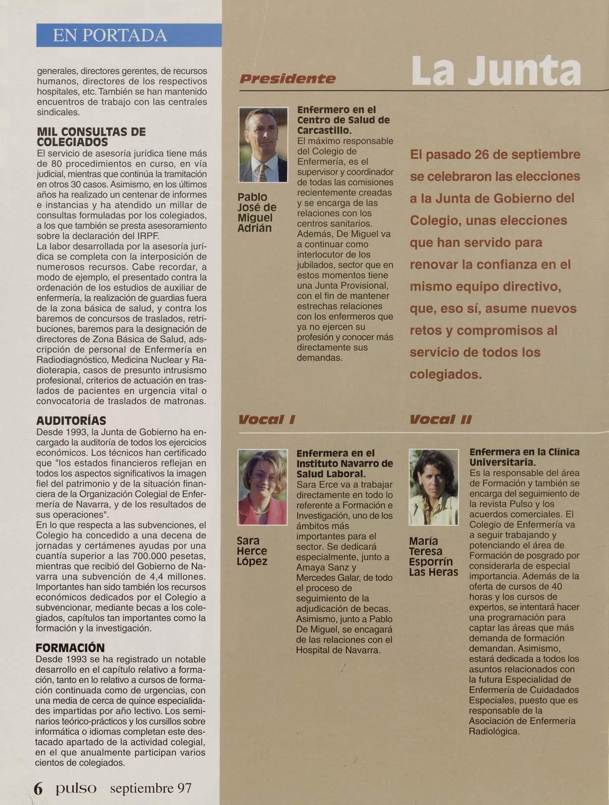 Edita y d i rige: Colegio Oficial de Enfermería de Navarra Junta de Gobierno: Pablo de Miguel (Presidente), M• Pilar Montero (Vicepresidenta), MI Jesús Orta (Tesorera), Antonio Villanueva (Secretario) , Sara Erce (Vocal) , M' Teresa Esporrín (Vocal), M' Mercedes Galar (Vocal), Juana M' Turrillas (Vocal) y Amaya Sanz (Vocal) Redacción : Marivi Salvo, Xabler González y Maite Esparza