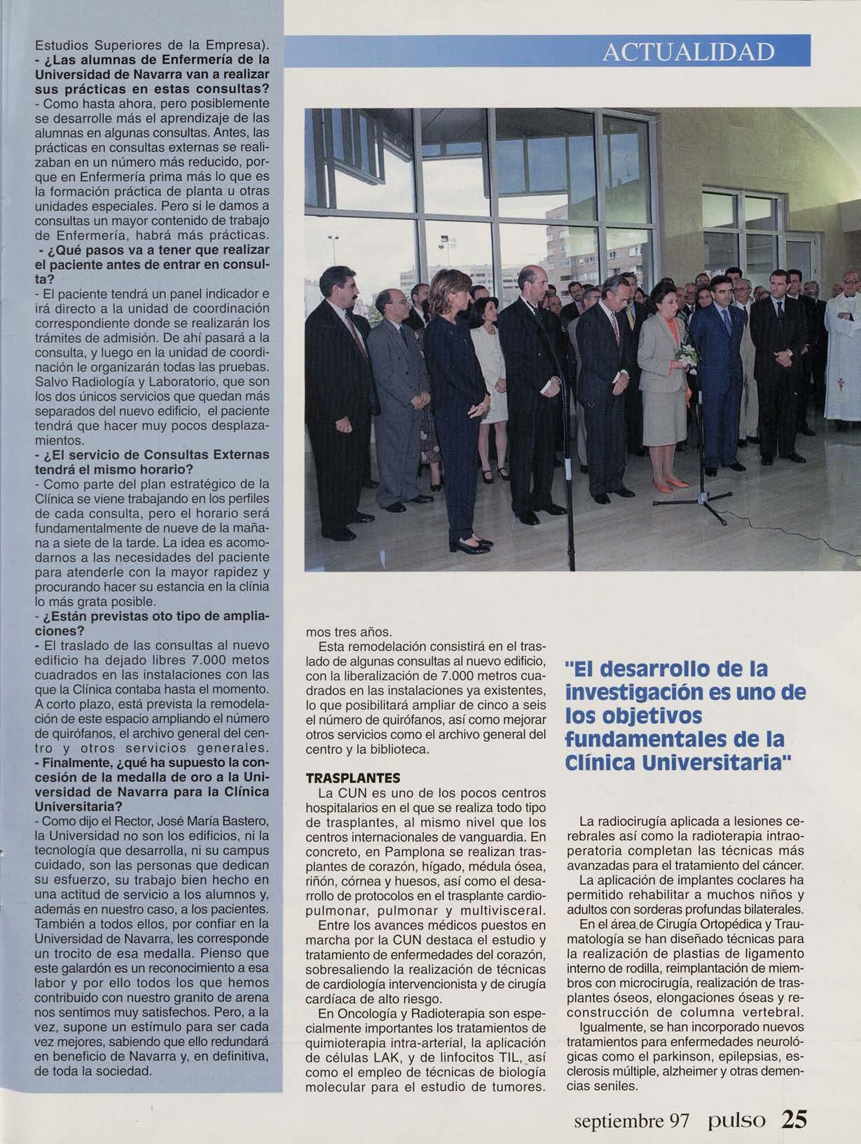 - Como dijo el Rector, José María Bastero, la Universidad no son los edificios, ni la tecnología que desarrolla, ni su campus cuidado, son las personas que dedican su esfuerzo, su trabajo bien hecho en una actitud de servicio a los alumnos y, además en nuestro caso, a los pacientes. También a todos ellos, por confiar en la Universidad de Navarra, les corresponde un trocito de esa medalla. Pienso que este galardón es un reconocimiento a esa labor y por ello todos los que hemos contribuido con nuestro granito de arena nos sentimos muy satisfechos. Pero, a la vez, supone un estímulo para ser cada vez mejores, sabiendo que ello redundará en beneficio de Navarra y, en definitiva, de toda la sociedad.