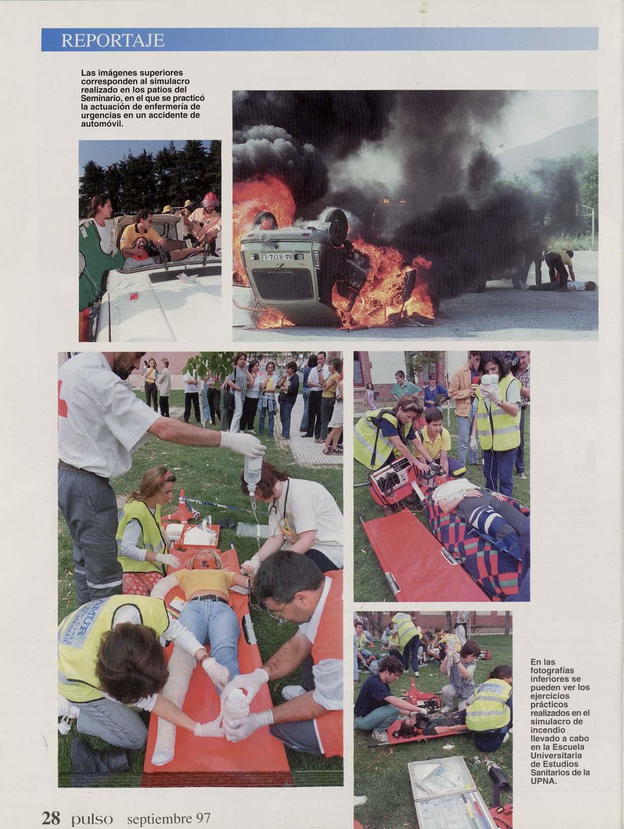 Samur-Mad rid, DYA , Cruz Roja, Policía Municipal y Bomberos de N avarra. La emergencia se c e ntra b a en un supuesto accidente d e tráfico, co nsistente e n e l c hoq ue fron tal d e dos turismos, un o d e los cua les se i ncendia ba t ras la co lisión, con la neces aria intervención de los bomberos. Como consecuencia de la colisión, una persona resultaba muerta y varias heridas de distinta consideración. Los alumnos tuvieron que atender a un herido en estado crítico que se encontraba atrapado en el interior del turismo. Mientras los bomber os procedían a cortar las chapas (apertu ra de vía extrao rdi naria de evacua c ión) las alumnas y alumnos del curso estabilizaban al herido, al igual que a otro que presentaba traumatismo craneoencefálico moderado, fractura de miembro inferior y contusión torácica. Tras su preparación por las enfermeras y enfermeros, los heridos eran trasladados a un centro hospitalario por las ambulancias que habían acudido al lugar.