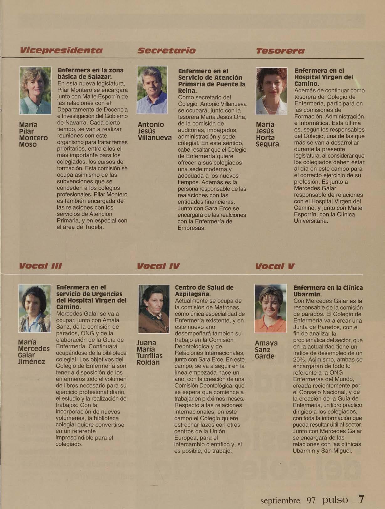 Enfermera en el Hospita l Virgen del cam ino. Además de continuar como tesorera del Colegio de Enfermería, participará en las comisiones de Formación, Administración e Informática. Esta última es, según los responsables del Colegio, una de las que más se van a desarrollar durante la presente legislatura, al considerar que los coleg iados deben estar al día en este campo para el correcto ejercicio de su profesión. Es junto a Mercedes Galar responsable de relac1ones con el Hospital Virgen del Camino, y junto con Maite Esporrin. con la Clfnica Universitaria.