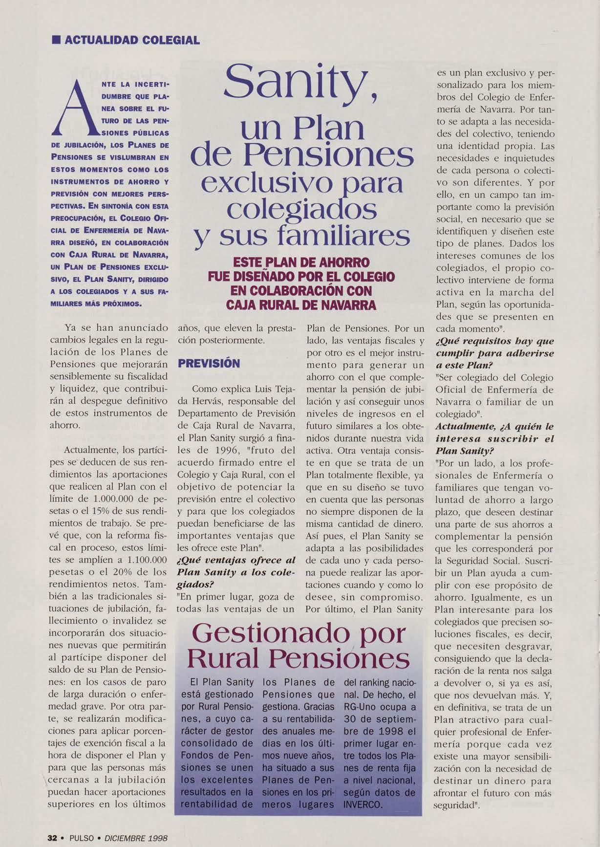 ANTE LA INCERTI · DUMBRE QUE PLA· NEA SOBRE EL FUTURO DE LAS PEN• SIONES PÚBLICAS DE JUBILACIÓN, LOS PLANES DE PENSI ONES SE V I SLUMBRAN EN ESTOS MOMENTOS COMO LOS INSTRUMENTOS DE AHORRO Y PREVISIÓN CON MEJORES PERS· PECUVAS EN SlNTONiA CON ESTA PREOCUPACI ÓN, EL C OLEGIO OfiCIAL DE ENFERMERiA DE NAVA· RRA DISEÑÓ, EN COLABORACIÓN CON C AJA RURAL DE NAVARRA, UN PLAN DE P ENSIOHES EXCLUSIVO, n PLAN 5ANJTY DIRIGIDO A LOS Y A SUS FA• MILlARES MAS PRÓXIMOS