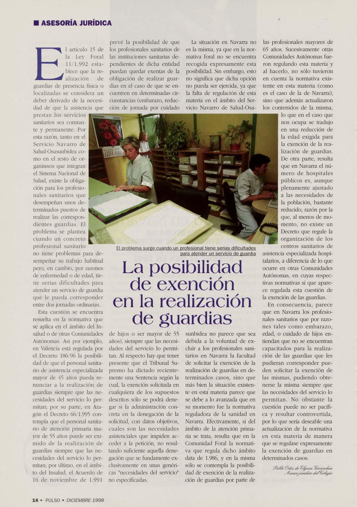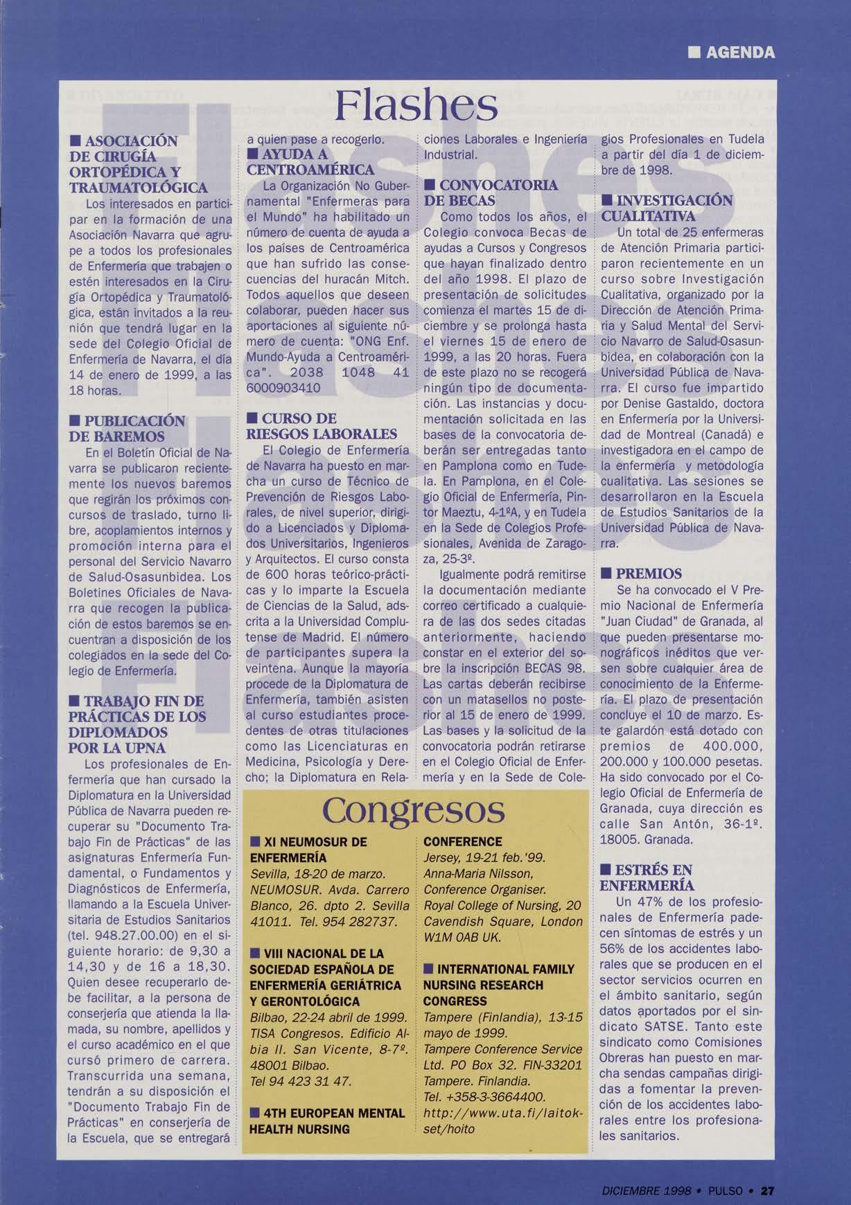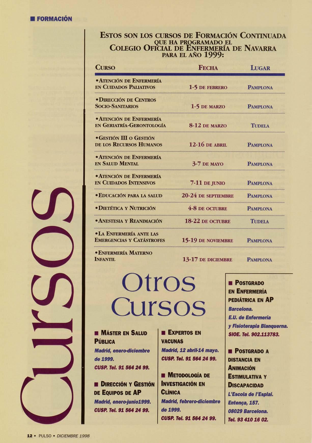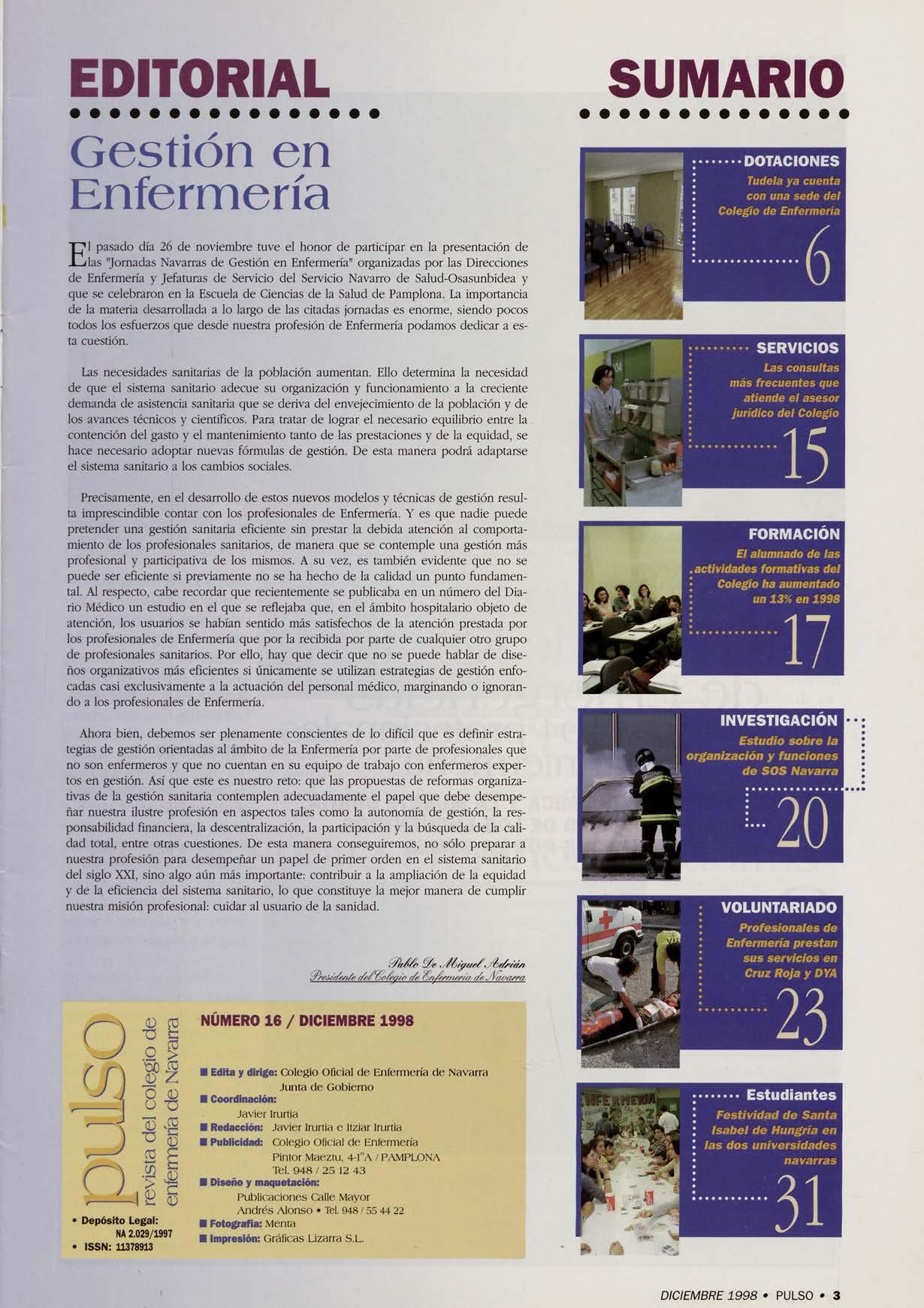 El pasado día 26 de noviembre tuve el honor de participar en la p resentación de las "Jornadas Navarras de Gestión en Enfermería" organizadas por las Direcciones de Enfermería y Jefamras de Servicio del Servicio Navarro de Salud-Osasunbidea y que se ce lebraron en la Escuela de Ciencias de la Salud de Pamplona. La importancia de la materia desarrollada a lo largo ele las citadas jornadas es enorme, siendo pocos todos los esfuerzos que desde nuestra profesión de Enfermería podamos dedicar a esta cuestión.