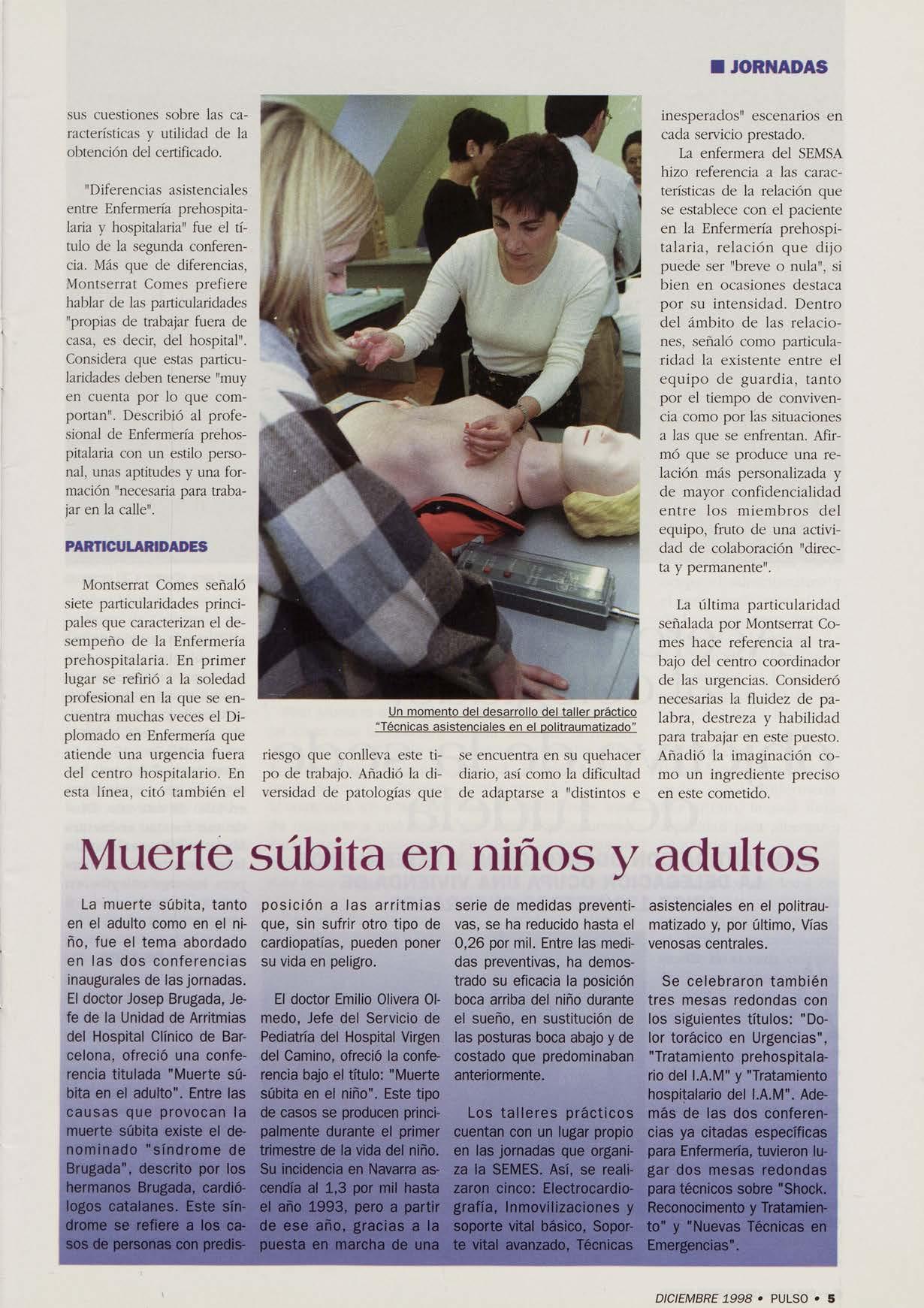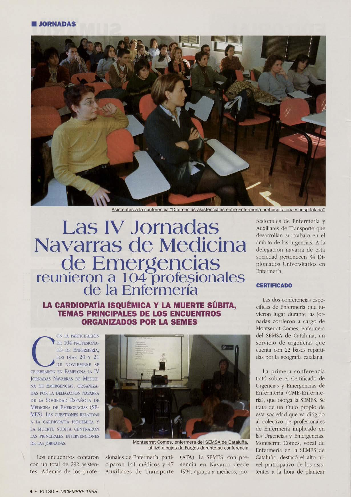 eDE 104 PROFF.SlOMLES OE ENFERMERÍA, LOS DfAS 20 Y 21 DE '10\' I EM II RE SE CELEBRARON EN PAMPLONA !.A IV j ORNADAS NA\'ARRAS DE MEDICINA DE EMERGF.l'\CIAS, ORGANIZADAS POR Lo\ DEI.EGACIÓN NAVARRA DE LA SOCIEDAD ESPAÑOLA DE MEI)IC INA DE EMERGIT'\'CIAS (SEMES) L\!i CL'ESilONES A LA CARDIOPATIA ISQL'ÉMICA Y LA SlJBITA CENT RARON LAS PRINCIPAI..ES INTERVENC IONES OE LAS JORNADA$