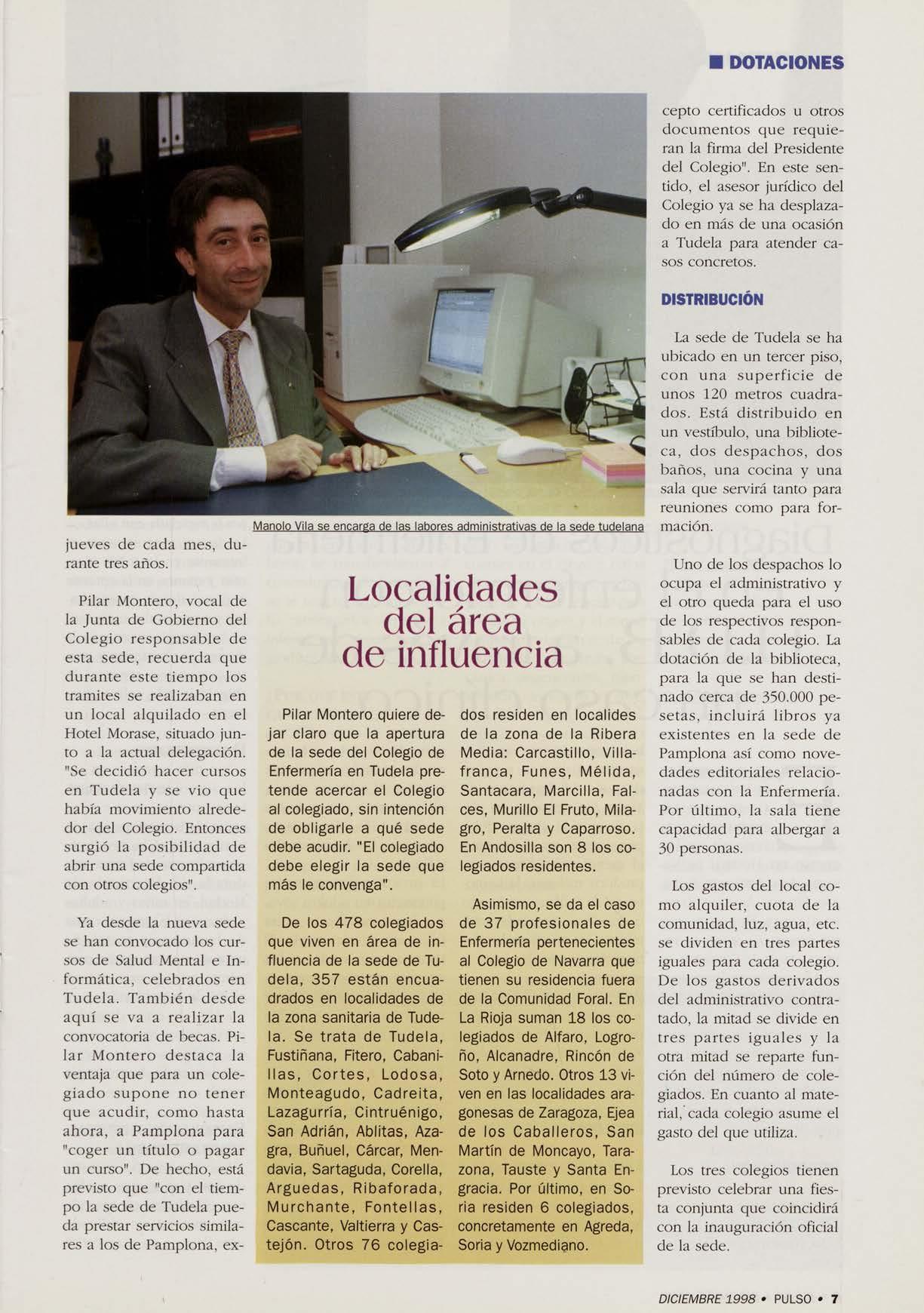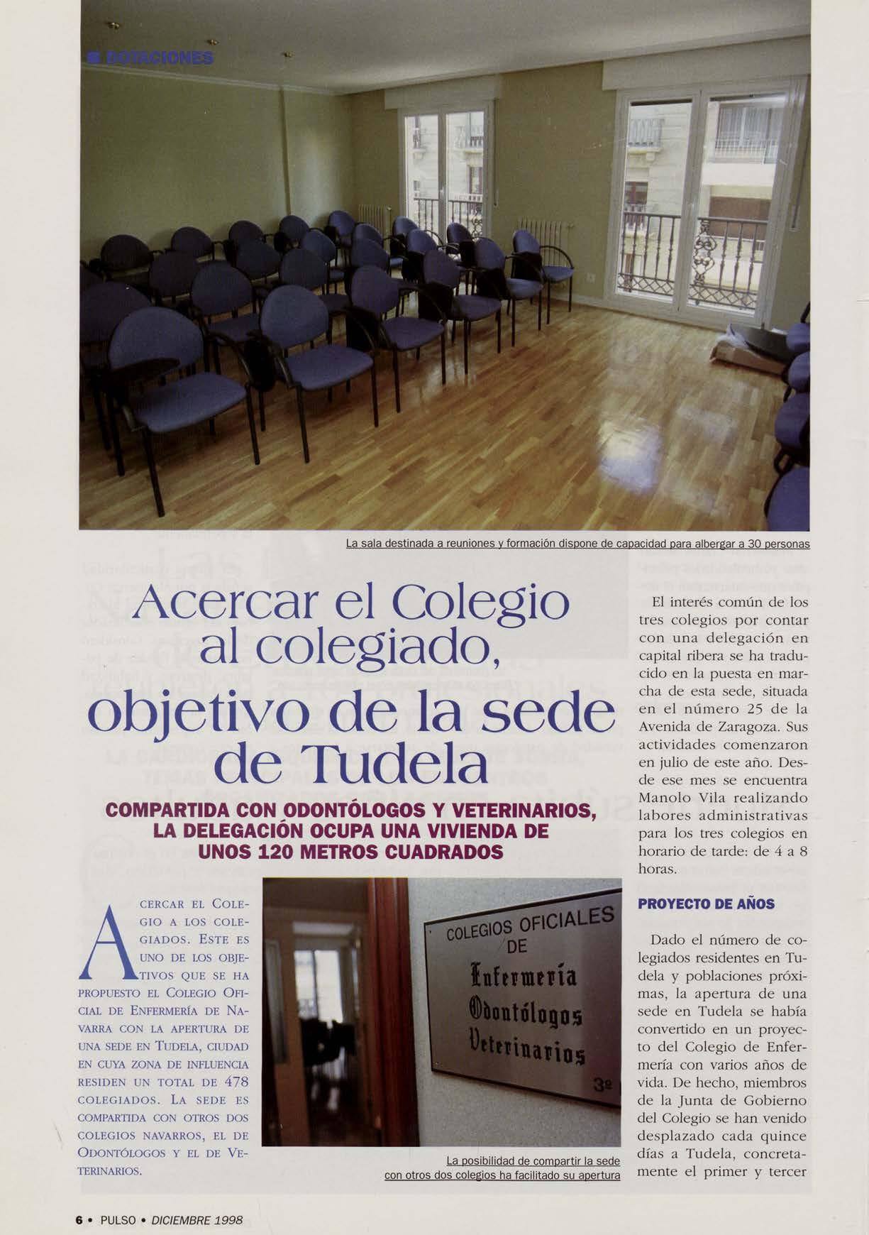 D ad o el número d e col egi ad os residentes en Tud eJa y po bla ci o nes próxim as . l a a p ertura d e un a se d e en Tud ela se ha b ía co nvertid o en un proyectO d e l Col egi o d e Enferm ería con varios añ os d e vida. De hecho , miemb ro s d e la junta d e Gobie rn o del Co l egi o se han venido d es pl aza d o ca d a quin ce días a T ude l a, co nc r etam ente e l primer y te r ce r