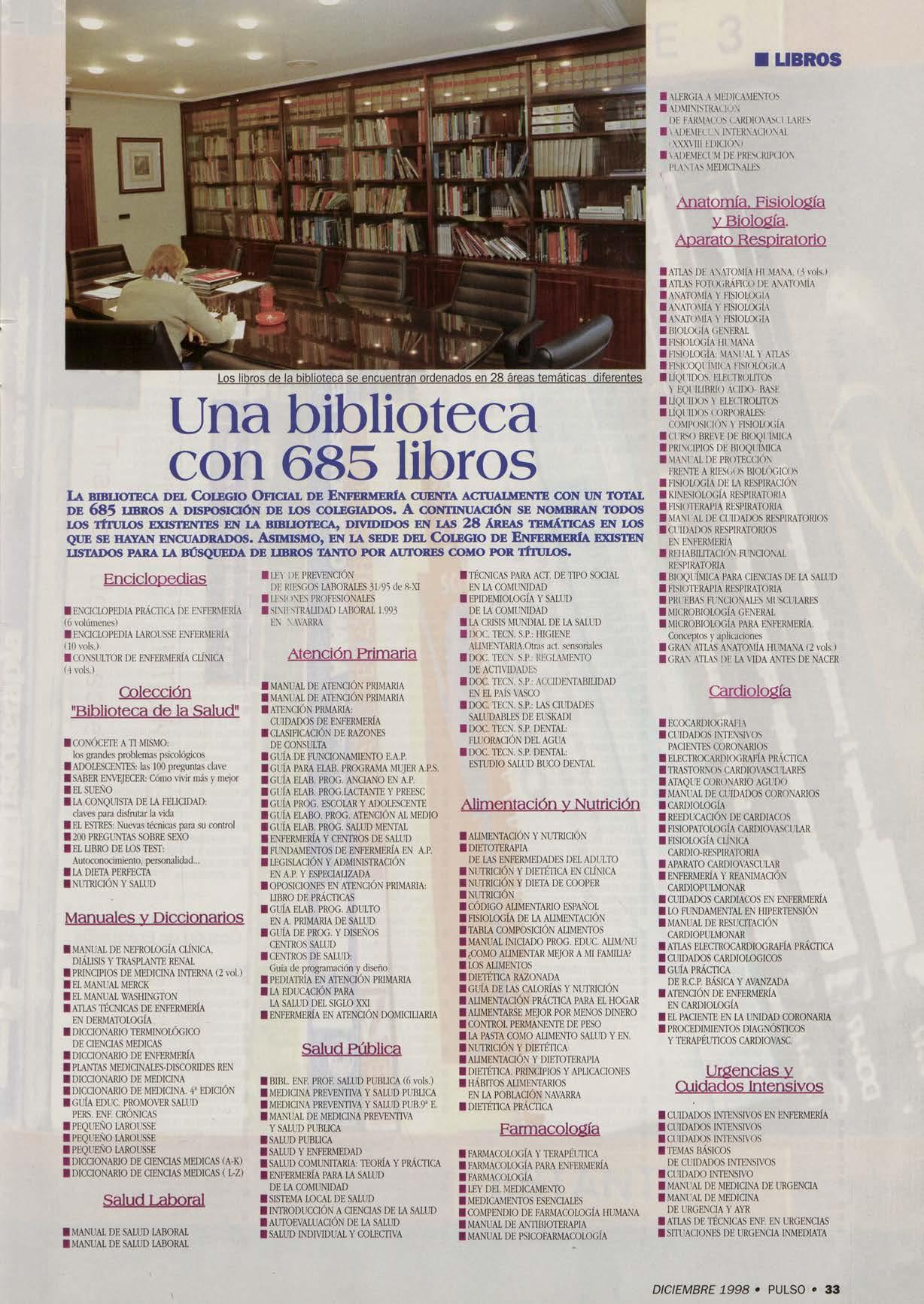 LA BIBUOTECA DEL CoLEGJO OFIOAI. DE ENFEilMERfA CUENTA ACI1JALMI!N'I'E CON UN TOTAL DE 68S liBROS A DISPOSIOÓN DE LOS COLEGJADOS. A CONTINUAOÓN SE NOMBBAN TODOS LOS rtruL0s EXlSTBNTES EN LA BIBUOTI!CA. DIVIDIDOS EN lAS 28 ÁREAS TEMÁnCAS EN LOS QVE SE HAYAN ENaJADllADOS. AsiMJ.sMO, EN lA SEDE DEL ColEGIO DE ENF1!RMJ!R1A EXISTEN liSTADOS PARA lA BÚSQUEDA DE liBROS TANTO POR AUl'ORES COMO POR rtruws.