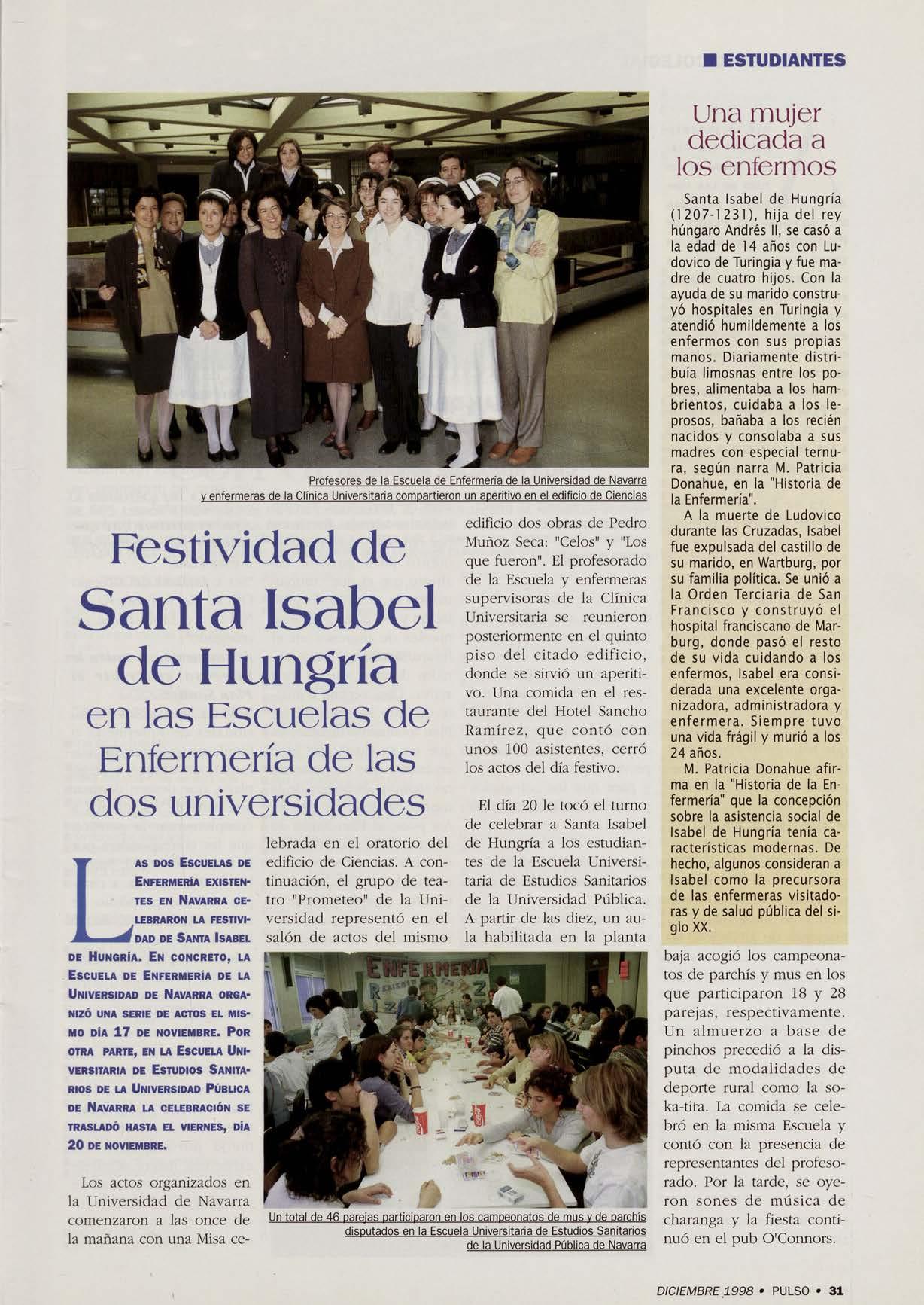 LAS oos EscuELAS DE edificio de Cie ncias A conENFERMERíA EXISTEN- tinuación , e l g rupo de teaTES EN NAVARRA CE• l f O "Prometeo" de la UniLEBRARON LA mmv1• vers idad representó en e l DAD DE SANTA ISABEL salón de actoS del mismo DE HUNGRÍA EN CONCRETO, LA ESCUELA DE ENFERMERIA DE LA UNIVERSIDAD DE NAVARRA ORGA• NIZÓ UNA SERIE DE ACTOS EL MIS· MO DÍA 17 DE NOVIEMBRE. PoR OTRA PARTE, EN LA EscUELA UNIVERSITARIA DE ESTUDIOS SANITA• RIOS DE LA UNIVERSIDAD POBUCA DE NAVARRA LA CELEBRACIÓN SE TRA$LAOÓ HASTA EL VIERNES, PíA 20 DE NOVIEMBRE.